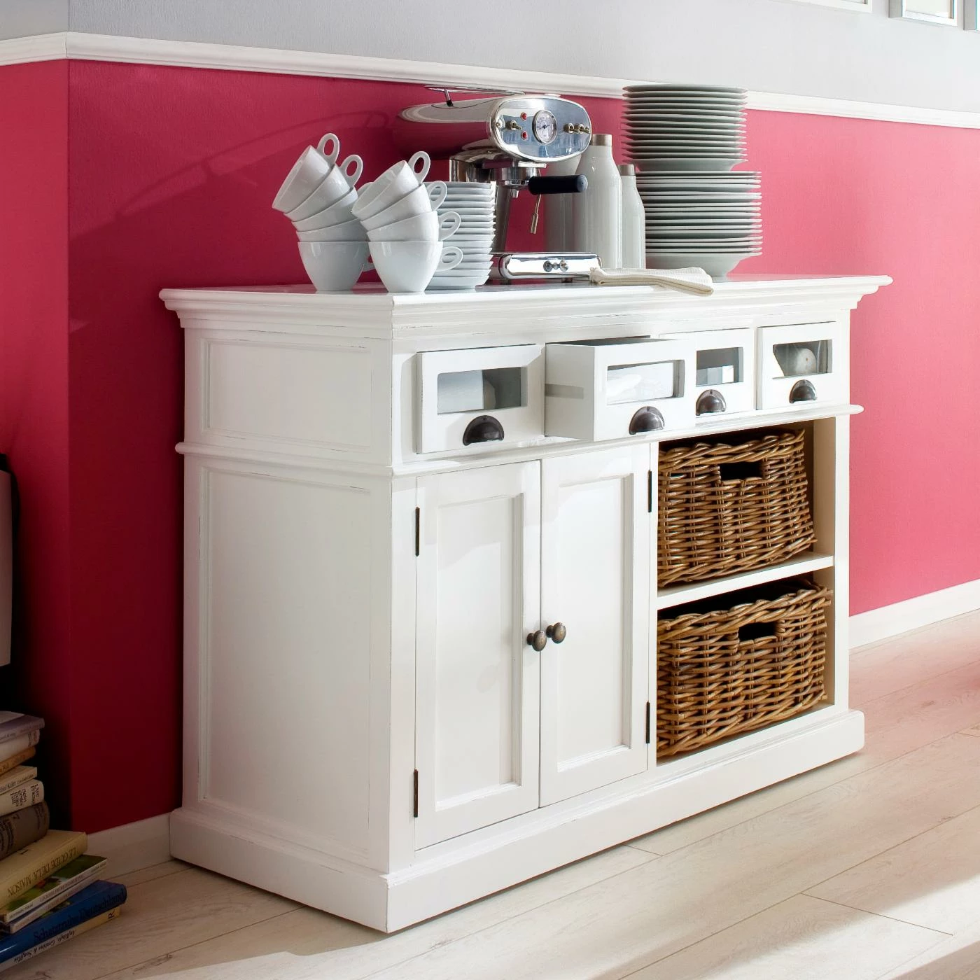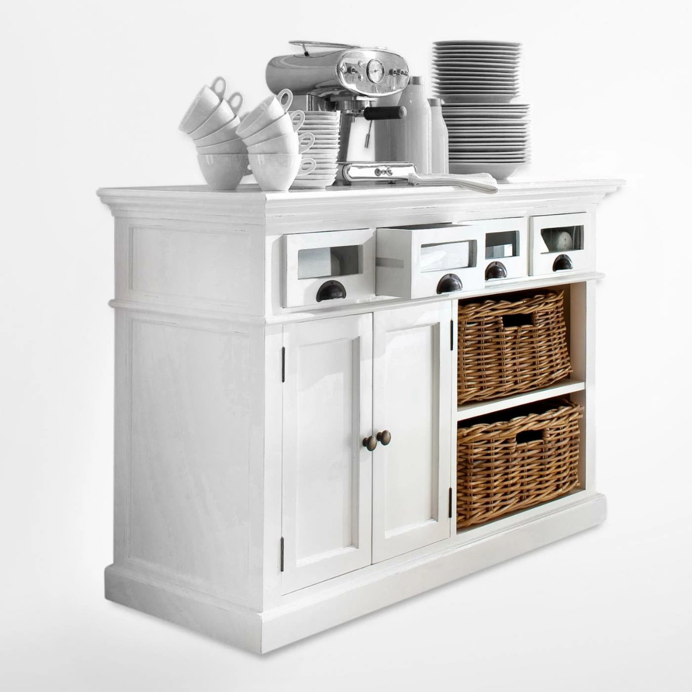 Don’t let a single soup spoon go missing thanks to the Nova Solo Halifax Kitchen Buffet. This beautiful buffet is a massive storage option that matches your lighter-colored traditional design or country-style kitchen. Thick mahogany hardwood supports the frame, bolstered by composite wood panels. A double-door cabinet conceals an interior shelf with two open shelves beside it, featuring two rattan storage baskets. Four pull-out drawers featuring transparent glass panels are also built into the design, . A semi-gloss white finish with distressed detailing completes the look, complemented by antique brass hardware.