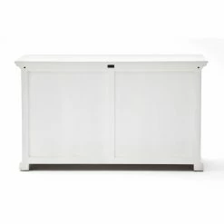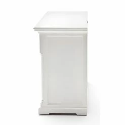The Nova Solo Provence Classic 4 Door Sideboard blends function and style with two cupboards, two generous drawers, and ornamental accent columns for a refined addition to any space. Crafted from kiln dried mahogany and engineered wood with a crisp white semi-gloss finish, this thoughtfully crafted sideboard features antique brass hardware, and removable interior shelving for easy organization.