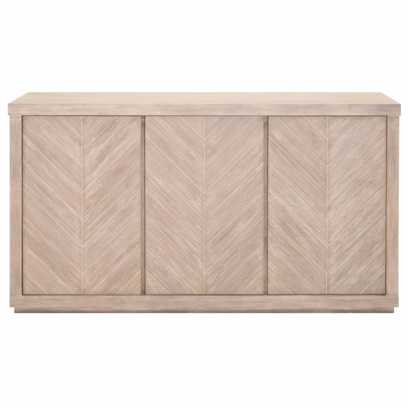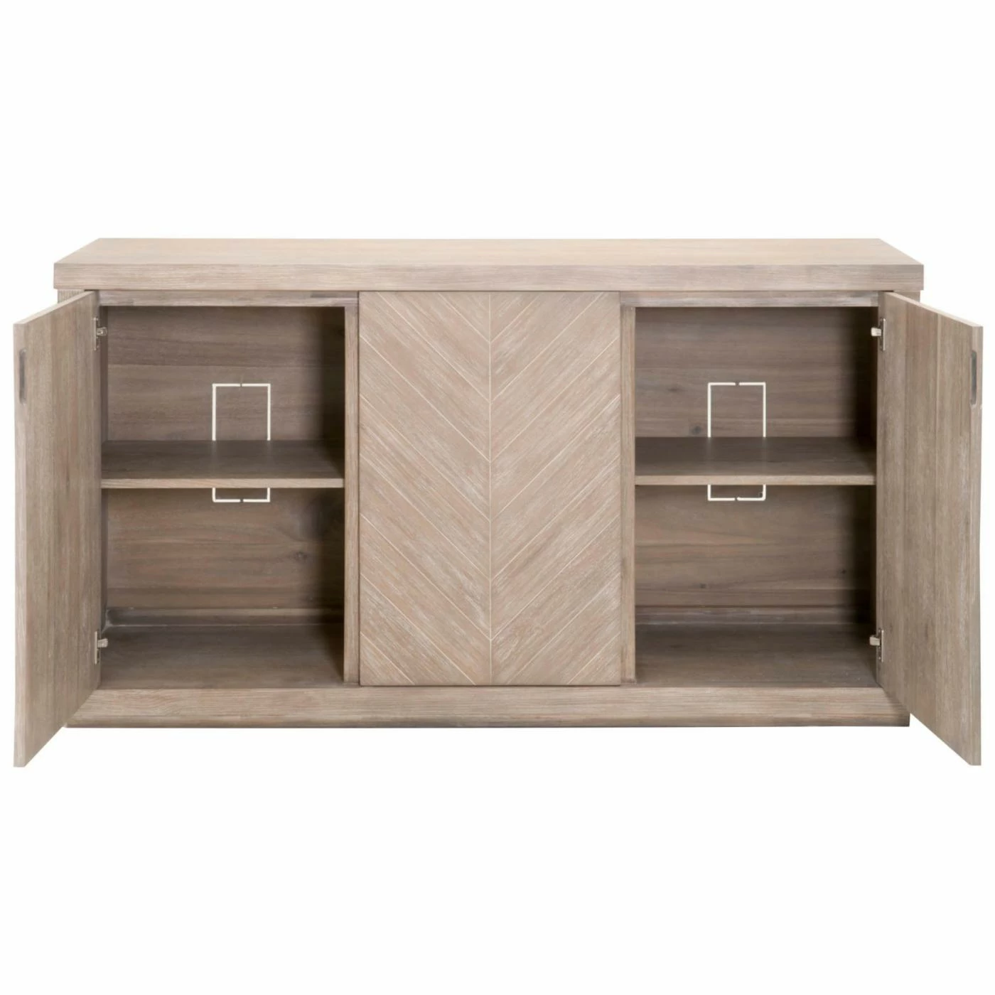 Unclutter your cupboards and pantry with the Orient Express Furniture Adler Sideboard. This handsome contemporary-style sideboard packs a lot of storage into a small area. Its wide frame is rendered from lightweight engineered wood and acacia hardwood solids. Three seamless, handle-less doors open to reveal shelved storage that are perfect for baking supplies, kitchen tools, dishes, and more. The frame is topped by acacia veneers with a chevron design on the doors.