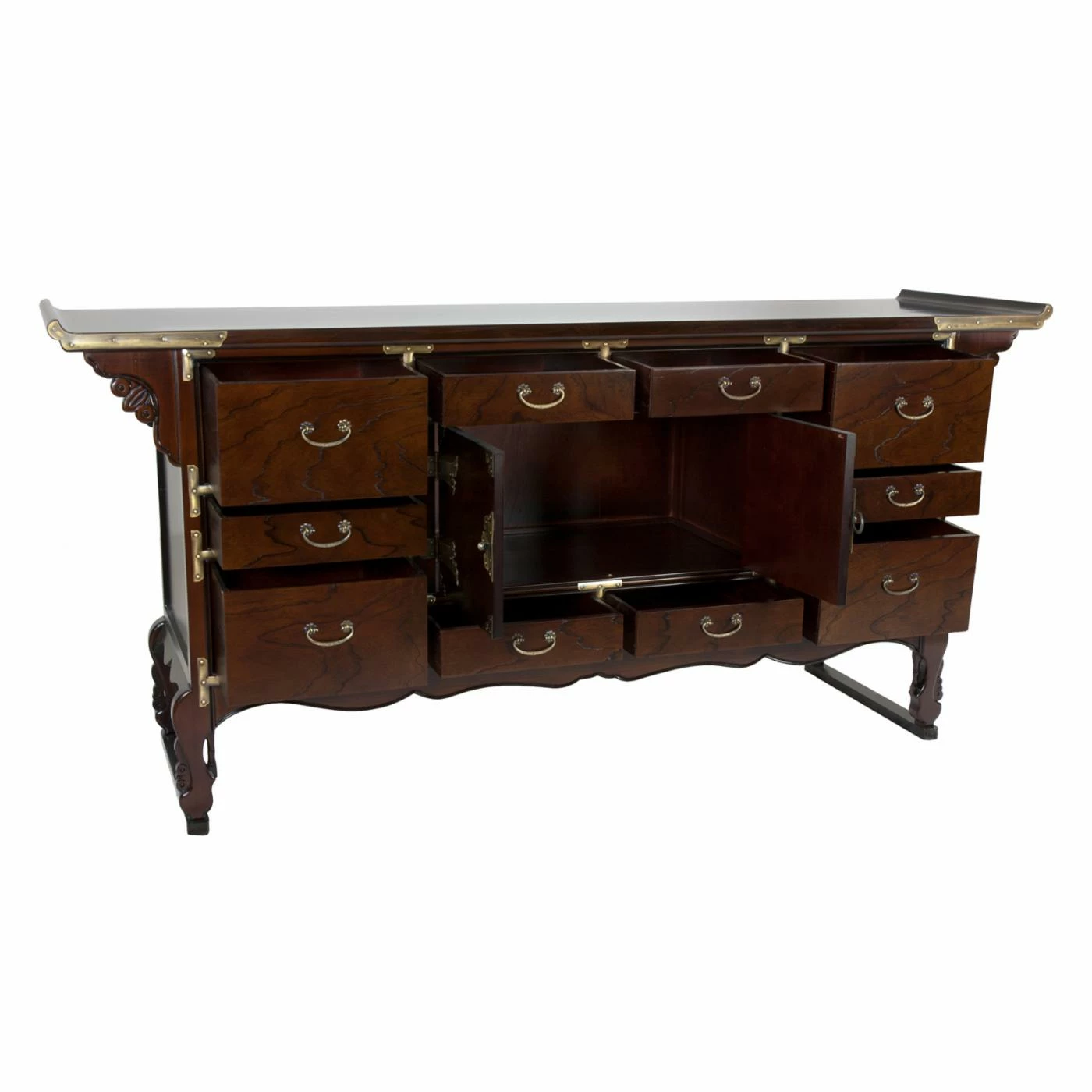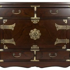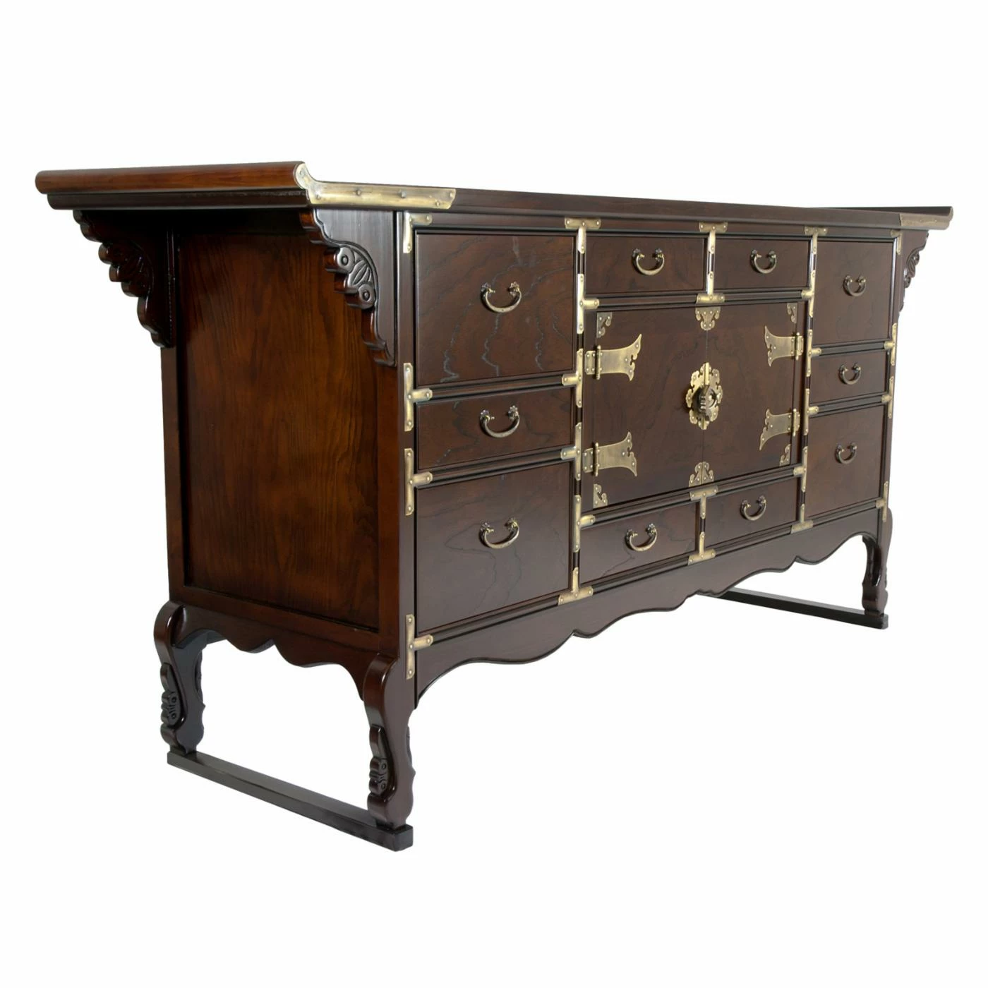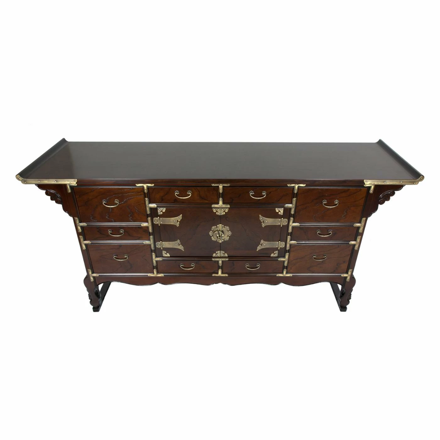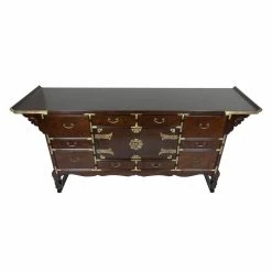 You’ll have to see the Oriental Furniture Korean Tansu Style 13 Drawer Buffet Server in person to believe it. This handsome piece features distinctive Asian designs with a striking brass medallion hasp, hinges, corner fittings, and handles. The details are breathtaking, as is the elm wood construction and rich, dark stain. It features an authentic Japanese and Korean-style cantilevered top with a lucky brass fish lock and key. Thirteen drawers and one cabinet allow for plentiful storage space in your kitchen or dining area.Β