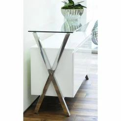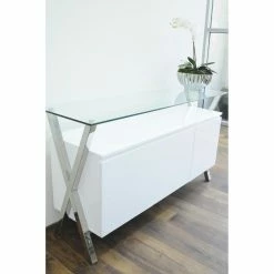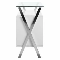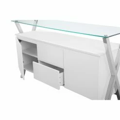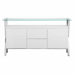 The Pangea Home Beverli Buffet forges a fresh way of combining serving or display space with storage. Beneath the clear tempered glass top, there’s a broad display shelf with six inches of headroom. Store glassware and other serving essentials inside two drawers and two cabinet doors. Drawers feature soft-close mechanisms.