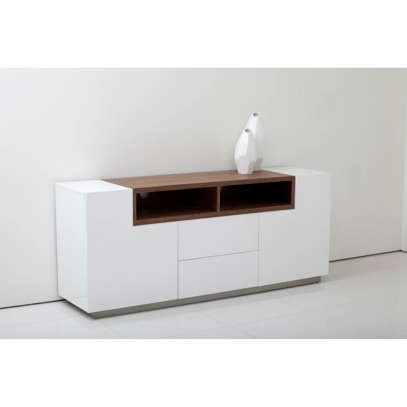 Built to serve your media needs or function as a dining room server, the Pangea Home Matrix Tall Buffet has plenty of storage compartments, all housed within a crisp, clean exterior. Two soft-close drawers are just right for smaller items, while two cabinet doors and two open compartments can house media devices, serving ware, or home bar essentials. Behind each door, there’s an adjustable shelf and a storage cubby on top.