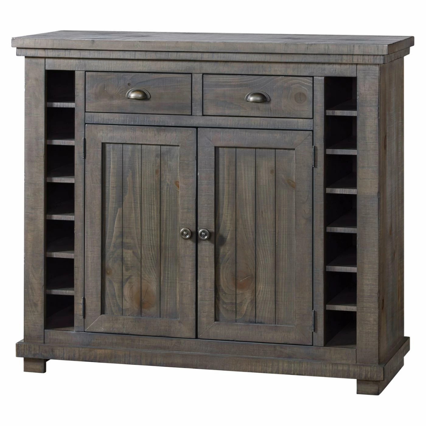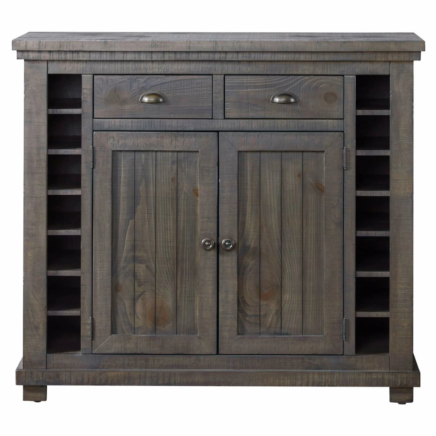 Add nuance to your gathering space with the Progressive Furniture Willow Wooden Server. This buffet is crafted of heavy rubberwood with pine veneers. The rough hewn texture backs up the salvaged/reclaimed impression created by the distressed gray finish. Store entertaining essentials securely within two drawers and a cabinet area. Integrated wine racks provide storage space for up to fourteen bottles.