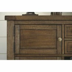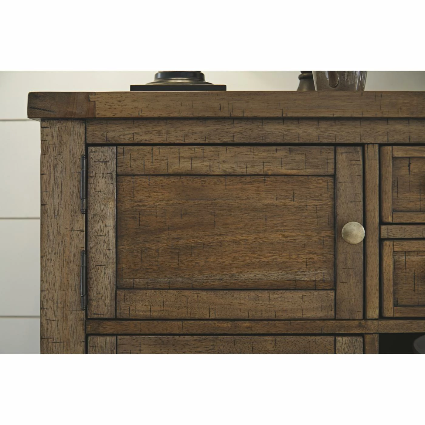 The Signature Design by Ashley Moriville Server beams with charm in your dining space. The rustic appearance of this server showcases a natural finish, four cabinets, two open shelves, and two smooth-operating drawers. It offers abundant storage and provides plenty of display space for your favorite dining items.