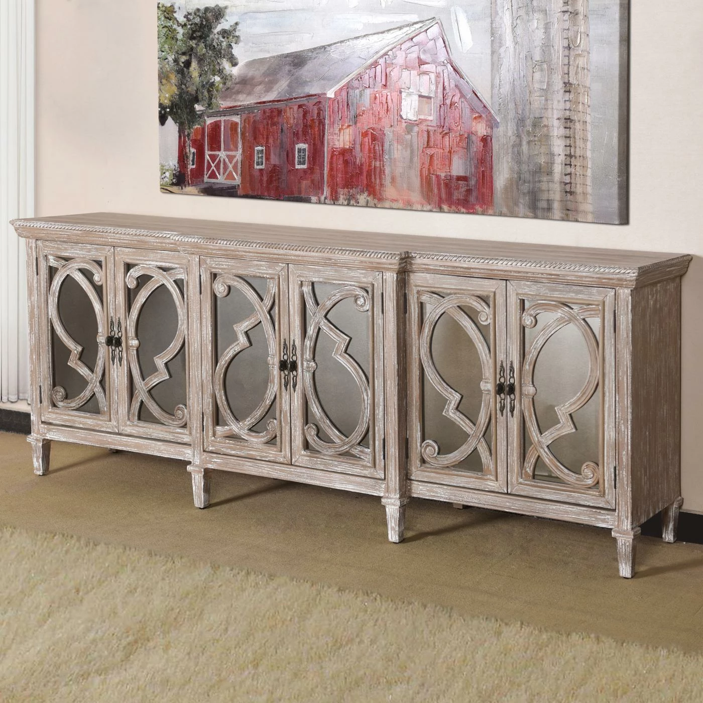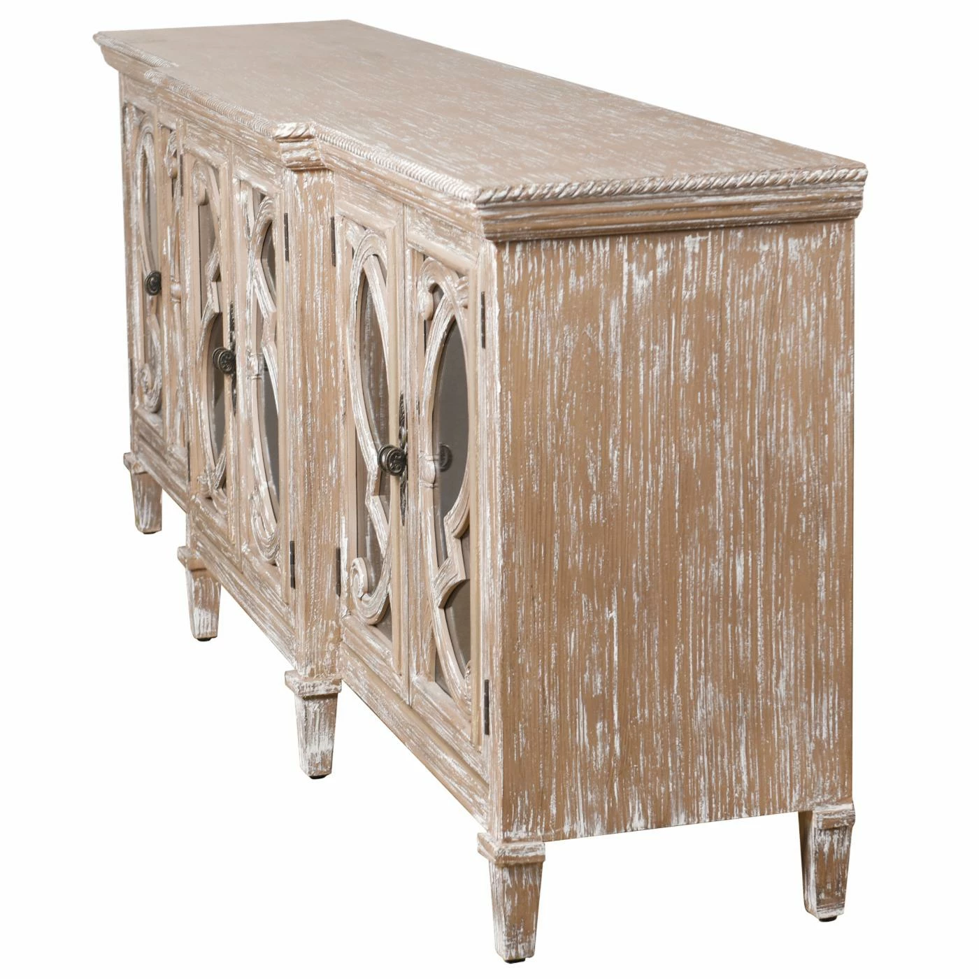 Excellent storage comes in a distinctively elegant package with the StyleCraft Naples 6 Door Mirrored Front Cabinet. From its mirrored and sculptural door fronts to its molded details, this cabinet offers a serious stage presence. Its wood construction features a distressed finish for a little rustic charm. The six doors open to reveal ample storage, allowing you to keep your space tidy with ease. A rope border defines the top and lends a fetching final finish.