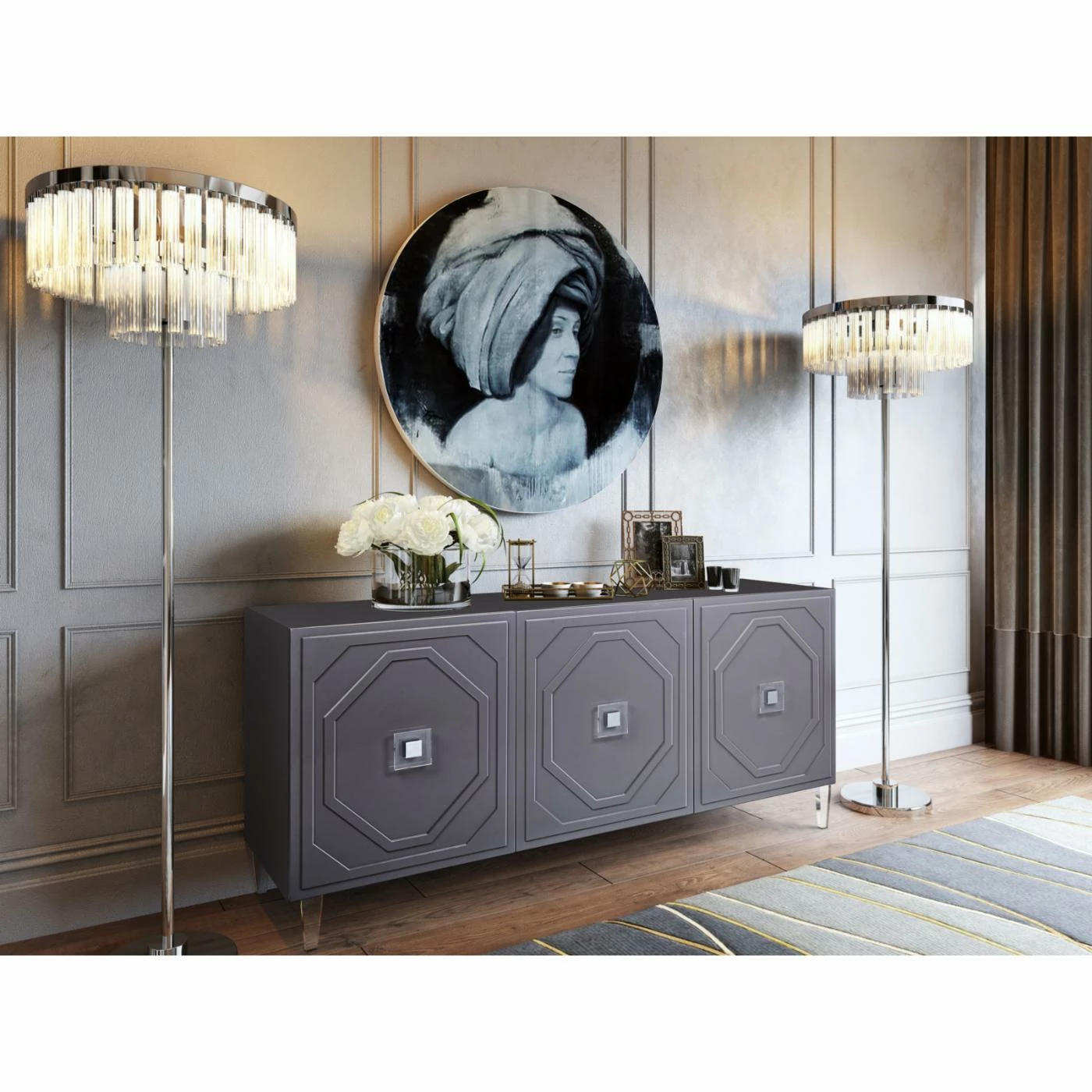 A showpiece and storage space all in one, the TOV Furniture Andros Lacquer Buffet is a must-have accent for your living area or formal dining room. Its dramatic design is constructed from durable MDF with clear acrylic legs that make the expansive cabinetry appear to be floating on air. The vast cabinet comes in your choice of finish and features three doors with raised geometric pattern and center metal pulls. These doors operate on soft-closing hinges and open to a generous interior compartment fitted with sturdy shelves great for sorting glassware, dinnerware, holiday dΓ©cor, and more. Some light assembly is required.