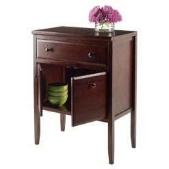 Stylish and functional, the Winsome Orleans Modular Buffet with Drawer & Cabinet enhances the visual appeal of your dining space while adding a little storage space for china, servingware, stemware, and more. One drawer and one double-doored cabinet take on your storage needs. The rich cappuccino finish and transitional lines make for an appealing addition to your dining room. Watch for the matching Orleans wine storage buffet and buffet with flip-down door.