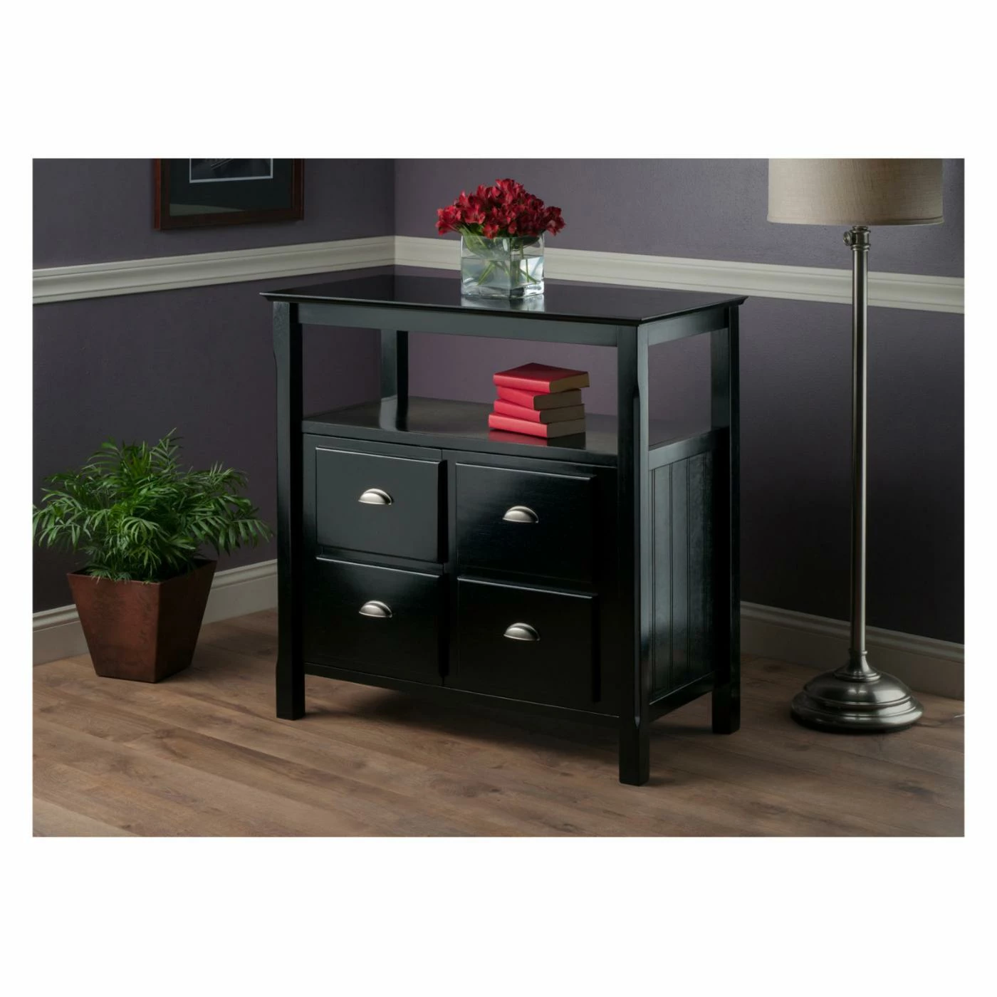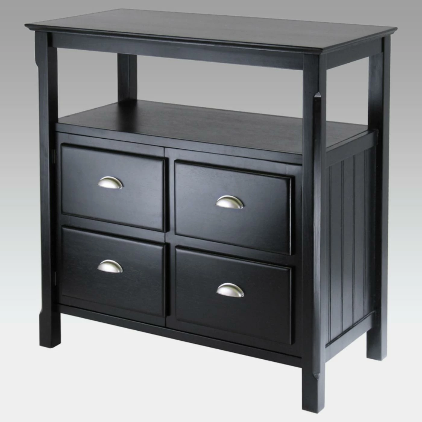 With the cool of contemporary and the warmth of traditional design, the Winsome Timber Buffet Cabinet looks right at home in any home. Use it in the dining room for dinnerware or in the living room for extra storage – this is no one-trick pony. The two cupboard doors open to a storage area with a shelf, while the open compartment above provides a handy spot for storage or display. Plus, the matte black finish, brushed steel pulls, and carved legs create a subtle elegance.