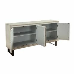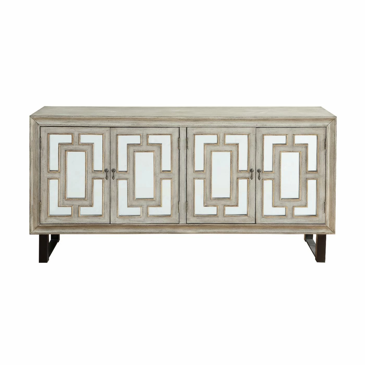 The clean lines, water pool lattice, and mirrored panels of the Coast to Coast 22583 4 Door Media Credenza are sure to complement just about any decorating style. The soft bamboo whitewash finish is supported by the black wood and metal base. Lots of inside storage with cable routing slots for organizing your stereo, games, and other media. Assembly required.