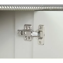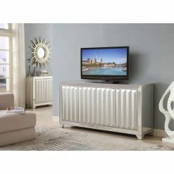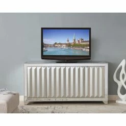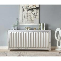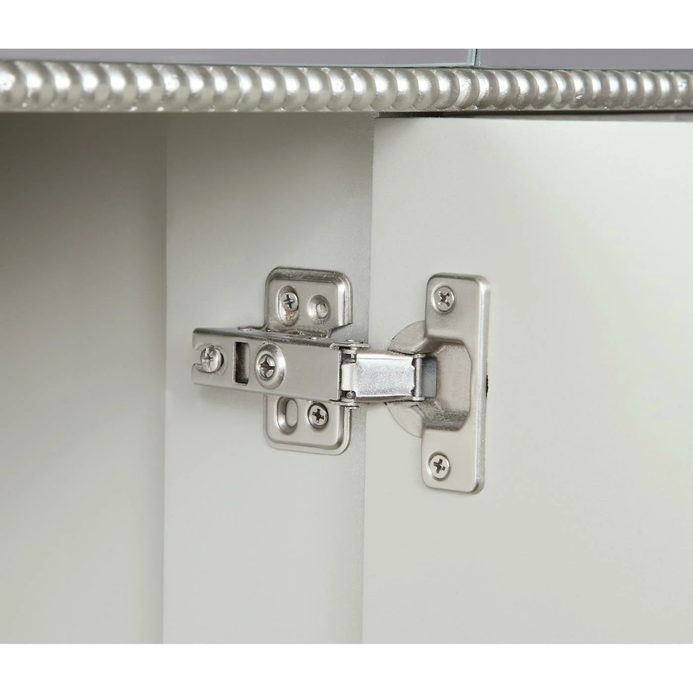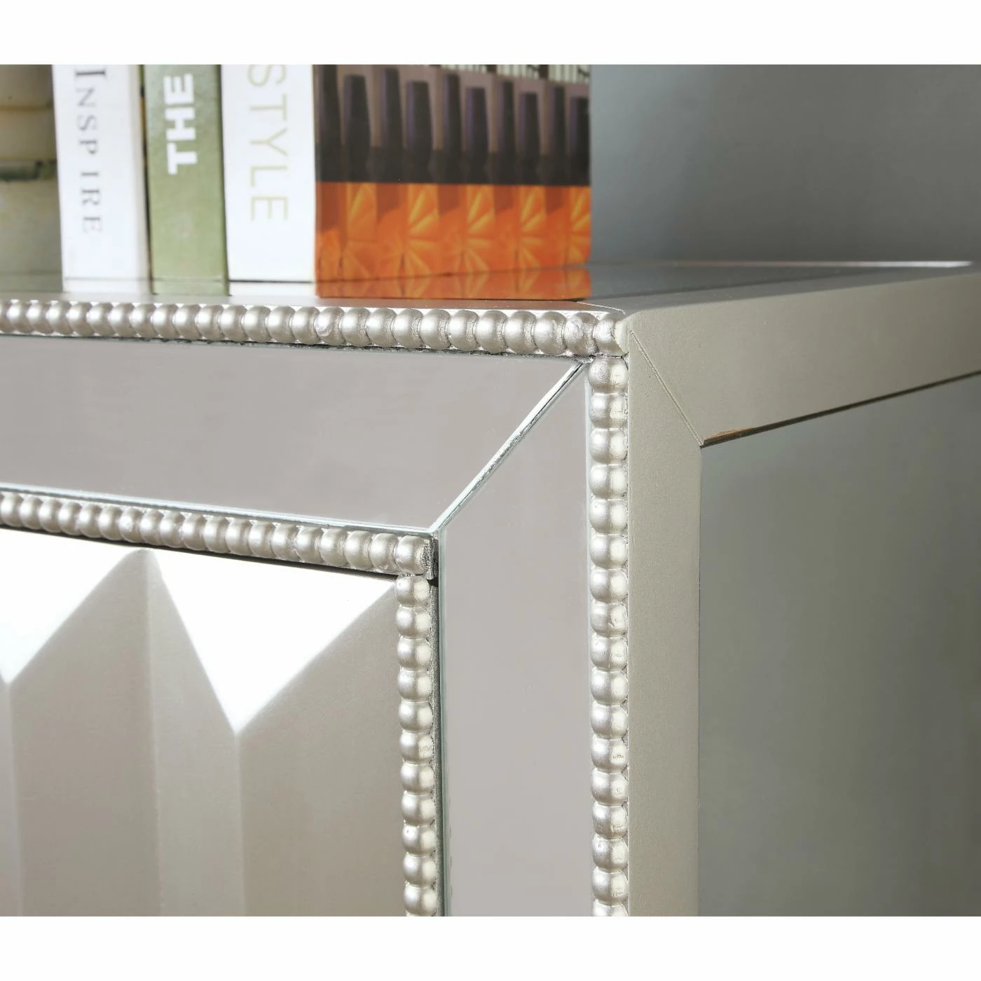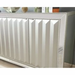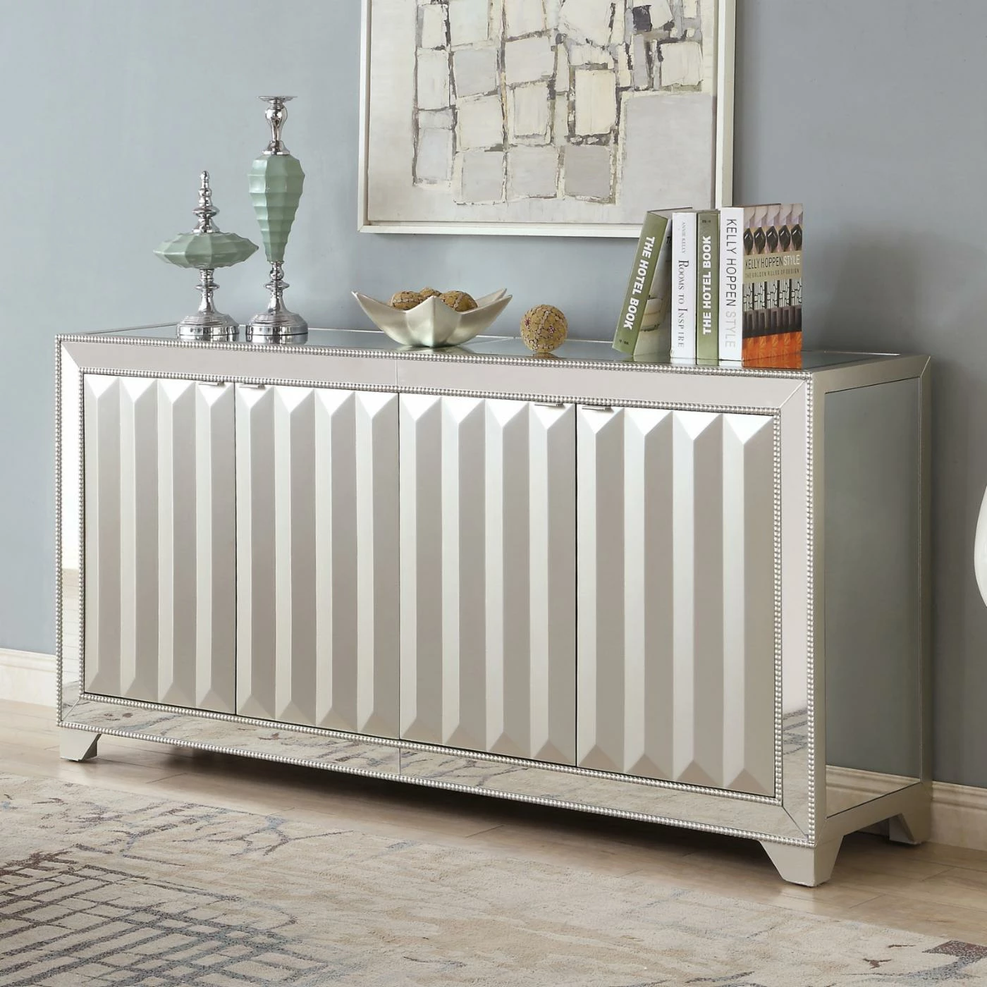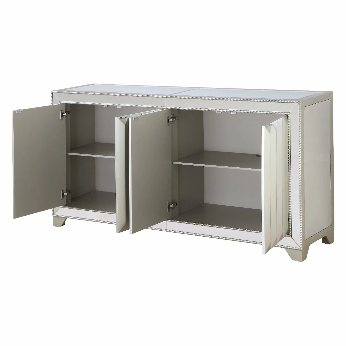 A brilliant glam storage accent, the Coast to Coast Elsinore Champagne 4 Door Credenza is a stunning match for your modern bedroom, entryway, or living room. Two double-door storage cabinets are incorporate into the design, each boasting a fixed interior shelf. The frame is constructed from tough, lightweight engineered wood, finished in champagne with soft gray panels. The doors each have faceted mirrored panels with a mirrored border. The border is studded with silver beads.