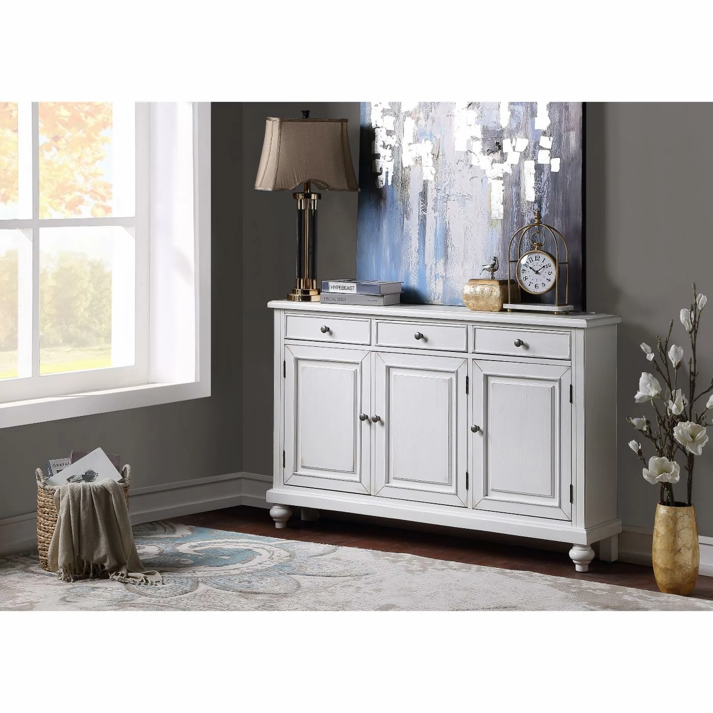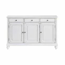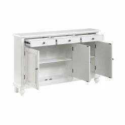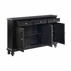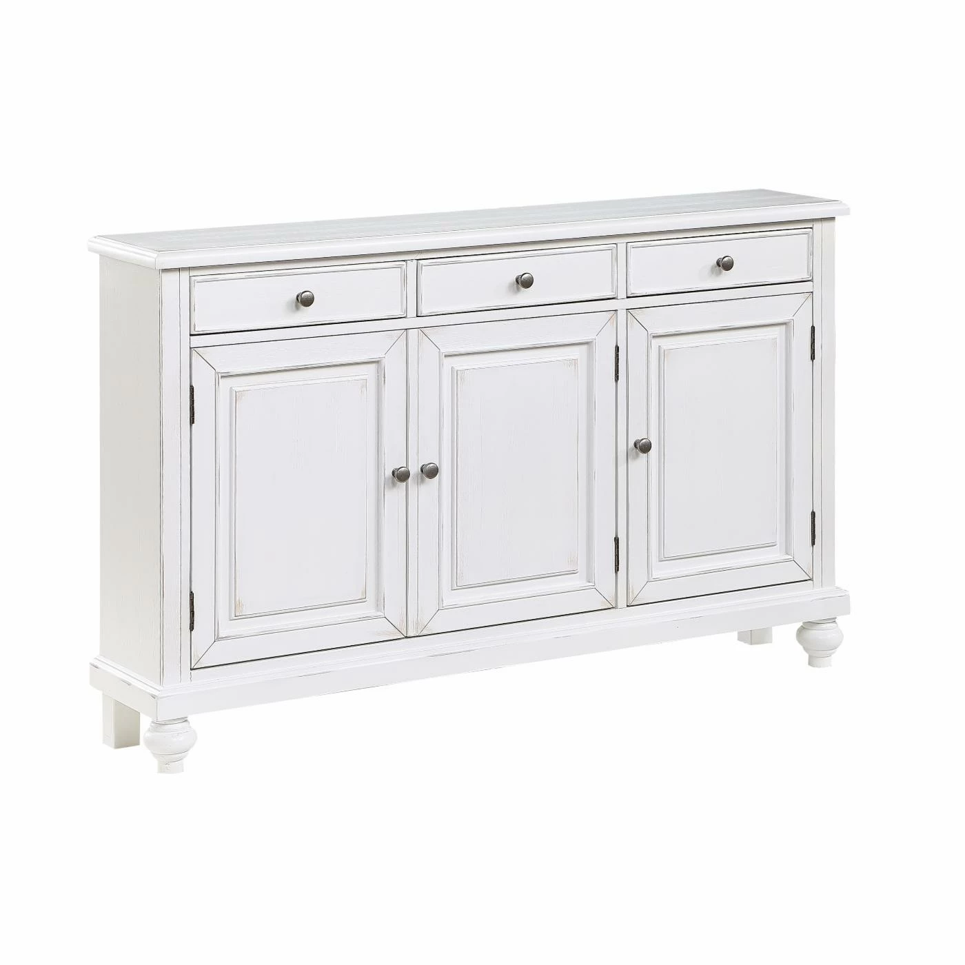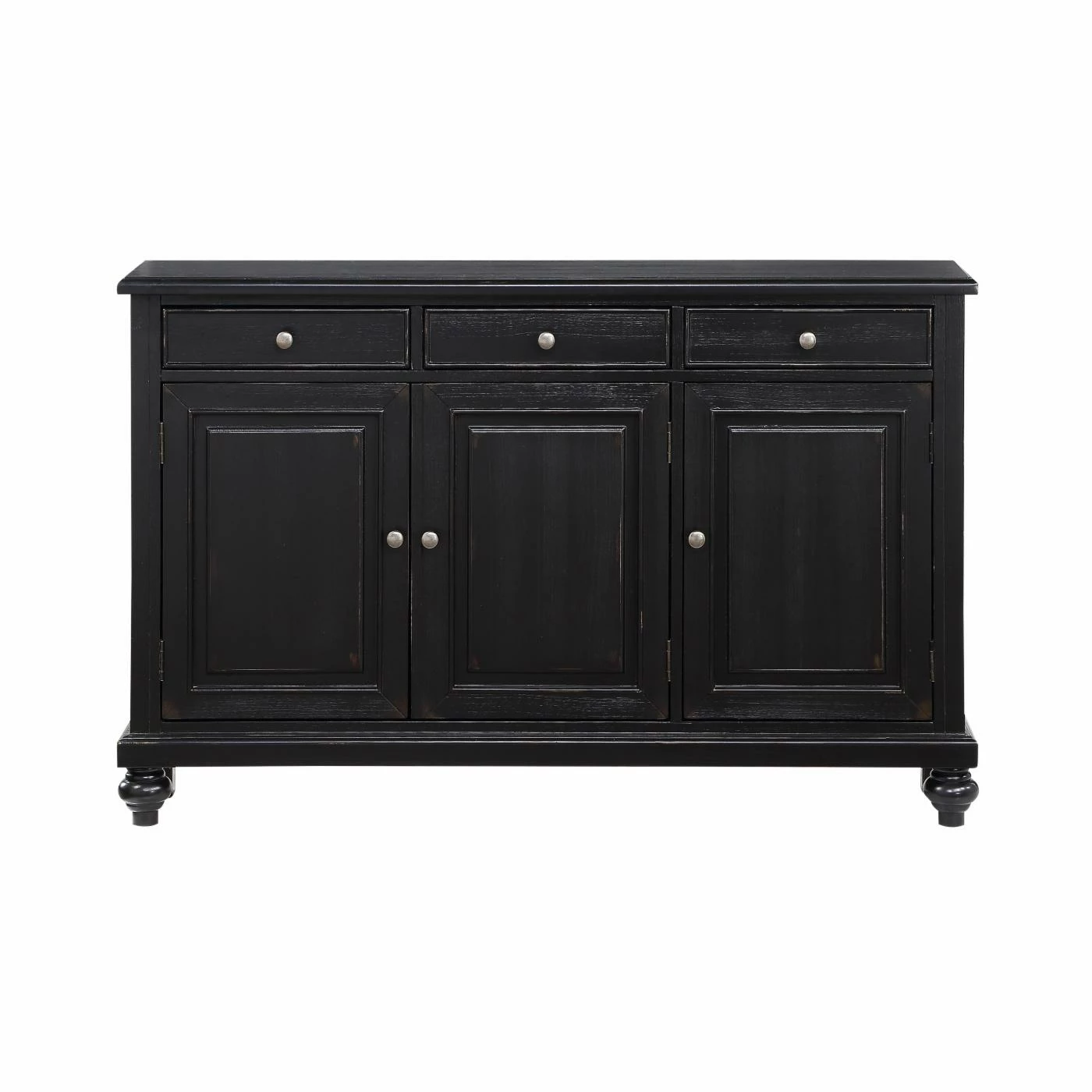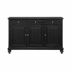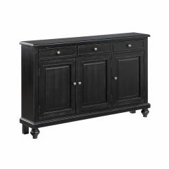 In your foyer, dining room or den, the roomy Coast to Coast Panel 3 Door and 3 Drawer Dining Credenza will be a welcome addition. This credenza is coated in a choice of available finish with turned ball feet. The three panel doors open to reveal a shelved interior, and the three upper drawers are ready to hold everything form your guest napkins and candles to pens and papers. This handsome Credenza not only has the look you desire, but also the functional storage options you crave!