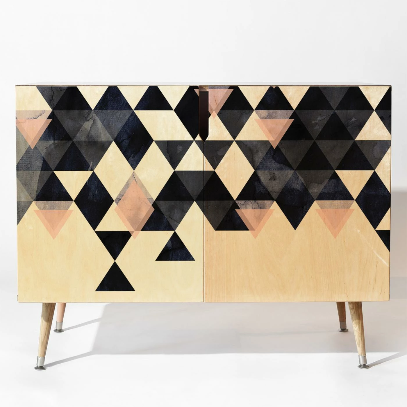 Bring your home an infusion of modern style with the Deny Designs Emanuela Carratoni Blue Geometry Credenza, punctuated with a multi-triangle design in colors of ivory, pink, and black. This eye-popping credenza is made of Baltic birch that’s simple to care for with a wipe of a non-abrasive cloth. Select your favorite available leg style and get lots of storage with the included interior shelf.