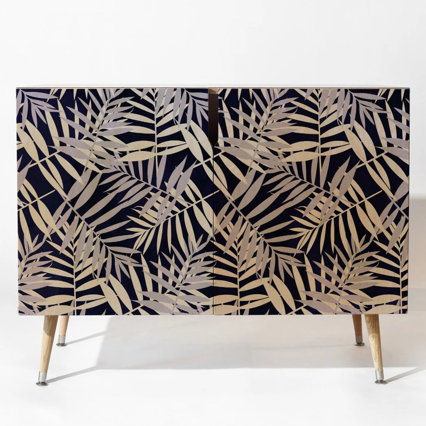 The Deny Designs Emanuela Carratoni Jungle Style Credenza is adorned with tropical leaf silhouettes in shades of ivory and gray, and the black background helps them pop for a bold look in any room. This durable Baltic birch credenza is enhanced with your preferred available leg style to help you achieve the perfect design. It includes an interior shelf for storage, and it wipes clean using a non-abrasive cloth.