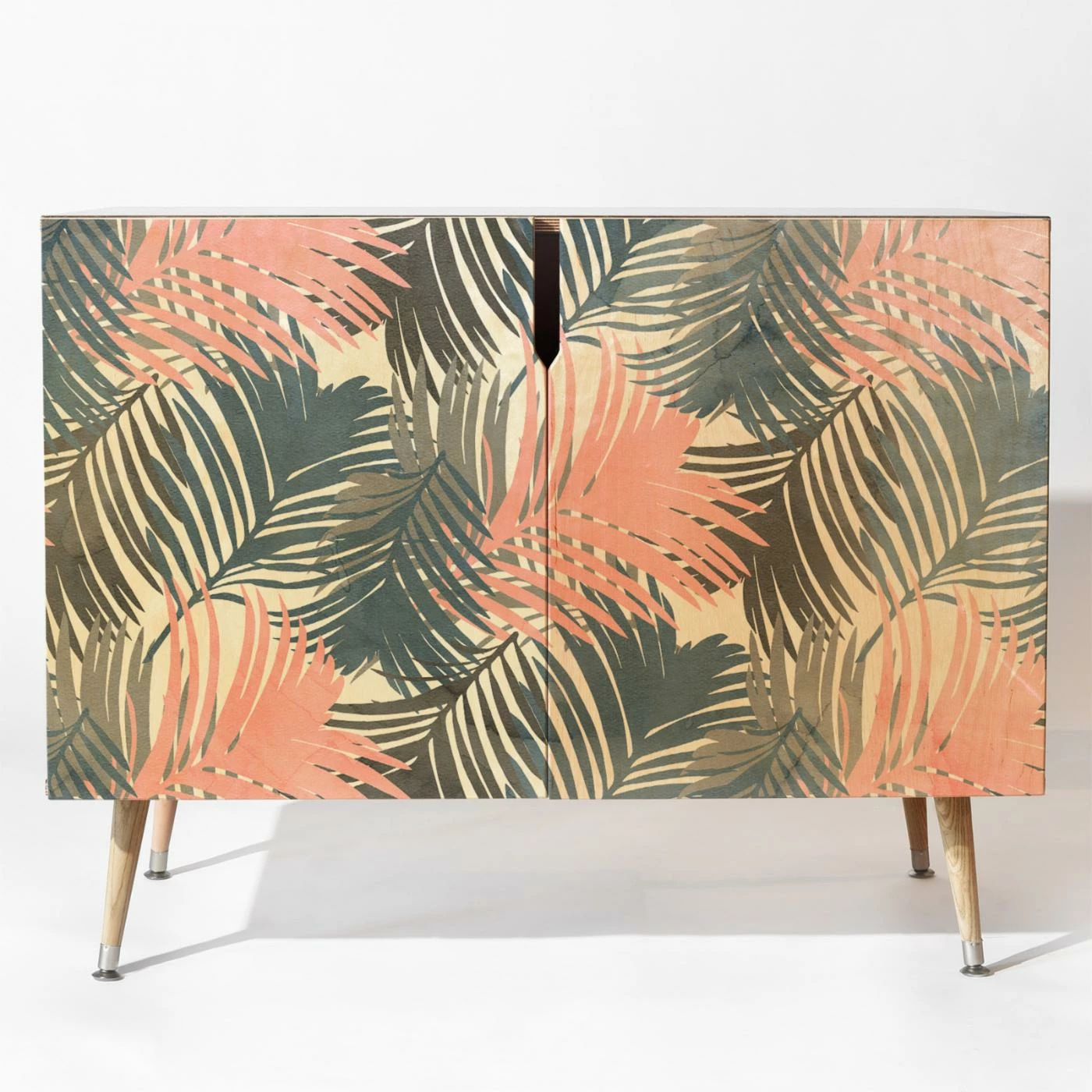 Add a lively, tropical look to your home with the Deny Designs Emanuela Carratoni Pattern Jungle Credenza, covered in a pink, ivory, and brown tropical leaf design. This chic credenza is crafted of Baltic birch wood with a smooth, durable gloss finish and your choice of available leg style. An interior shelf is included, and it can be kept clean by simply wiping it with a non-abrasive rag.