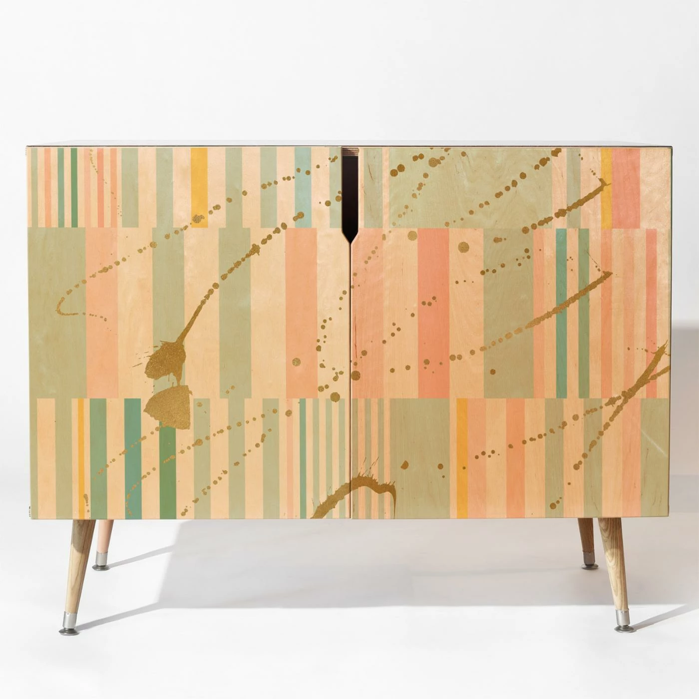 Pastel colored strips and paint splatter combine to give the Deny Designs Iveta Abolina Lisbon Stripe Credenza a unique, modern look. This chic credenza is made of Baltic birch and boasts easy care with a simple wipe of a non-abrasive cloth. Select your preferred available leg style and use it in a hallway or living room for a fun piece of functional furniture.