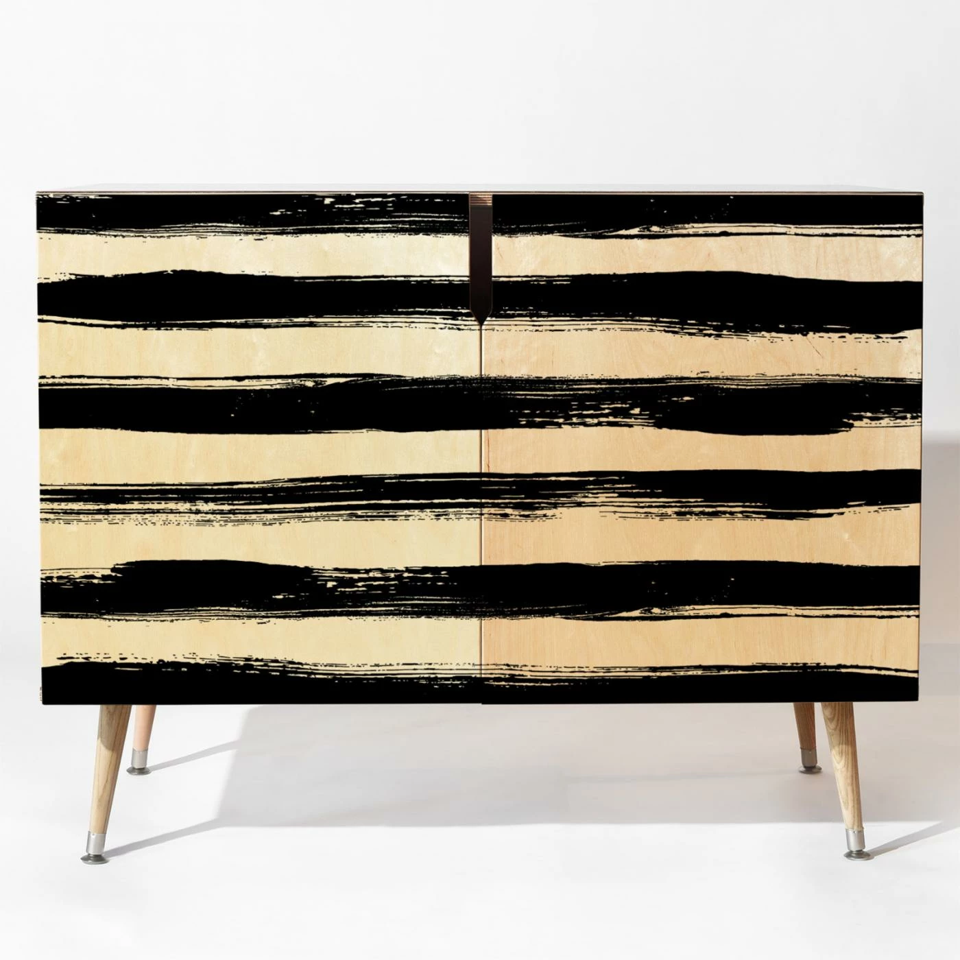 Painted black stripes creates an artsy look to the Deny Designs Kelly Haines Paint Stripes Credenza, completed with a smooth gloss finish. This ultra-modern credenza includes your choice of available leg style and incudes an interior shelf. Keep it clean by wiping it down with a non-abrasive cloth for easy care.