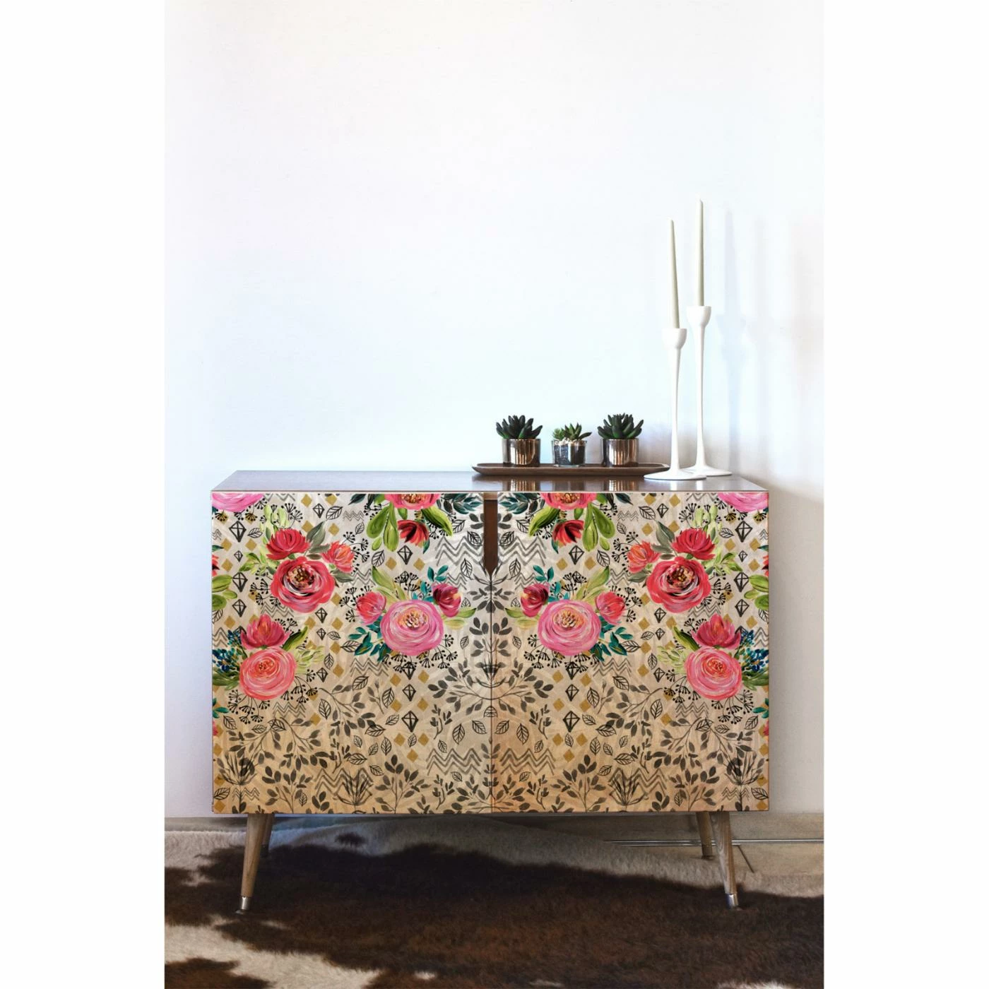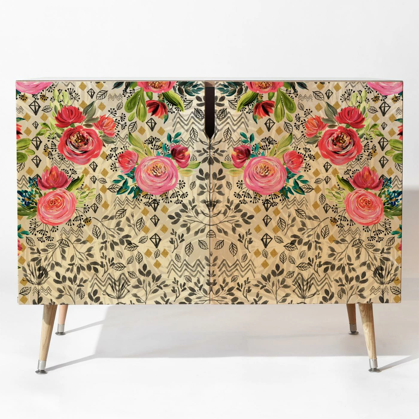 Pink blooming flowers and green leaves dance with geometric designs on the Deny Designs Marta Barragan Camarasa Flowered Nature with Geometric Credenza. This ultra-contemporary credenza boasts Baltic birch construction that can be kept clean with a wipe of a non-abrasive cloth. Select your favorite available leg style to get the perfect look in your favorite space.