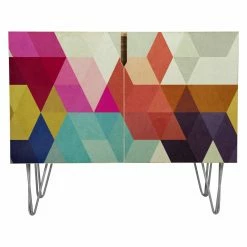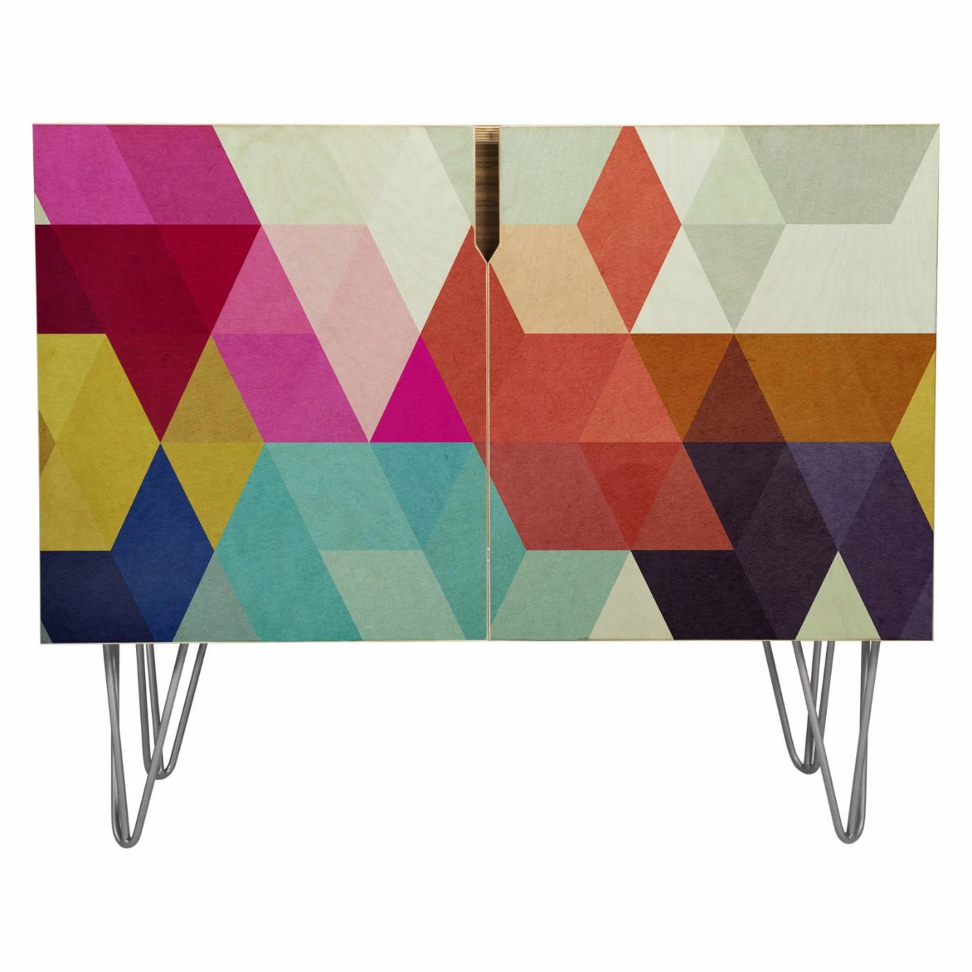 Color and shape is enough to evoke feeling, so feel the strong attraction of the Deny Designs Three Of The Possessed Modele 7 Credenza. This contemporary piece starts with a body of premium Baltic Birch that’s supported by a pair of metal hairpin legs. The original piece by Three of the Possessed is printed on the face of the credenza, then sealed behind a thick gloss finish that gives it a high polish while also protecting the image and the cabinet. Behind the pair of handle-less doors is a roomy interior with a fixed shelf and a matching print at the back of the space.