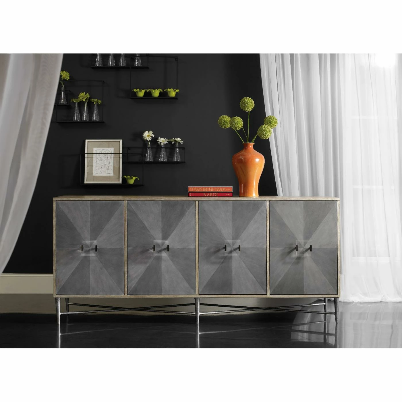 If you’ve been looking for that eclectic focal point for your space, look no further than the Hooker Furniture Melange Zola Four-Door Credenza. Ideal for dining rooms, living rooms, and more, this credenza is crafted of poplar and solid hardwood with elm, maple, and black walnut veneers. The soft-close doors draw the eye thanks to their multi-hued gray finish, and they conceal some convenient storage – one adjustable shelf each behind the left and right doors and another adjustable shelf behind the two center doors. A metal base with X-shaped stretchers completes the credenza.