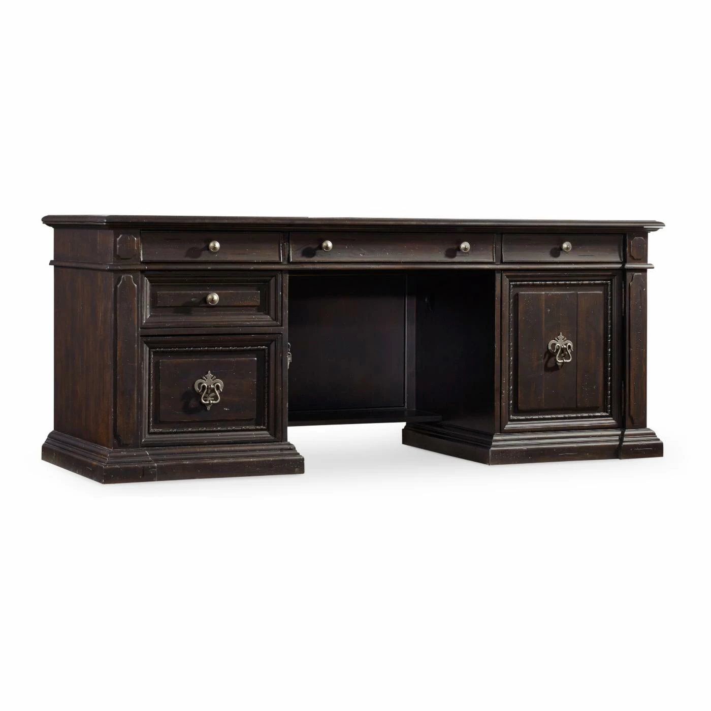 Set this Hooker Furniture Treviso Computer Credenza in a home office or den for a functional and regal furniture piece. Crafted of spruce solids and rustic pine veneers, this credenza is finished in dark macchiato and tobacco for a rich appearance. It’s equipped with one shelf and five drawers for enough space to store loads of items. This credenza is designed with ample knee space and a convenient keyboard drawer for your computer. Metal knobs and hardware add sleekness.