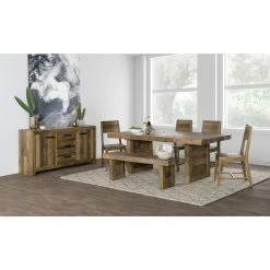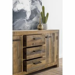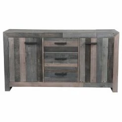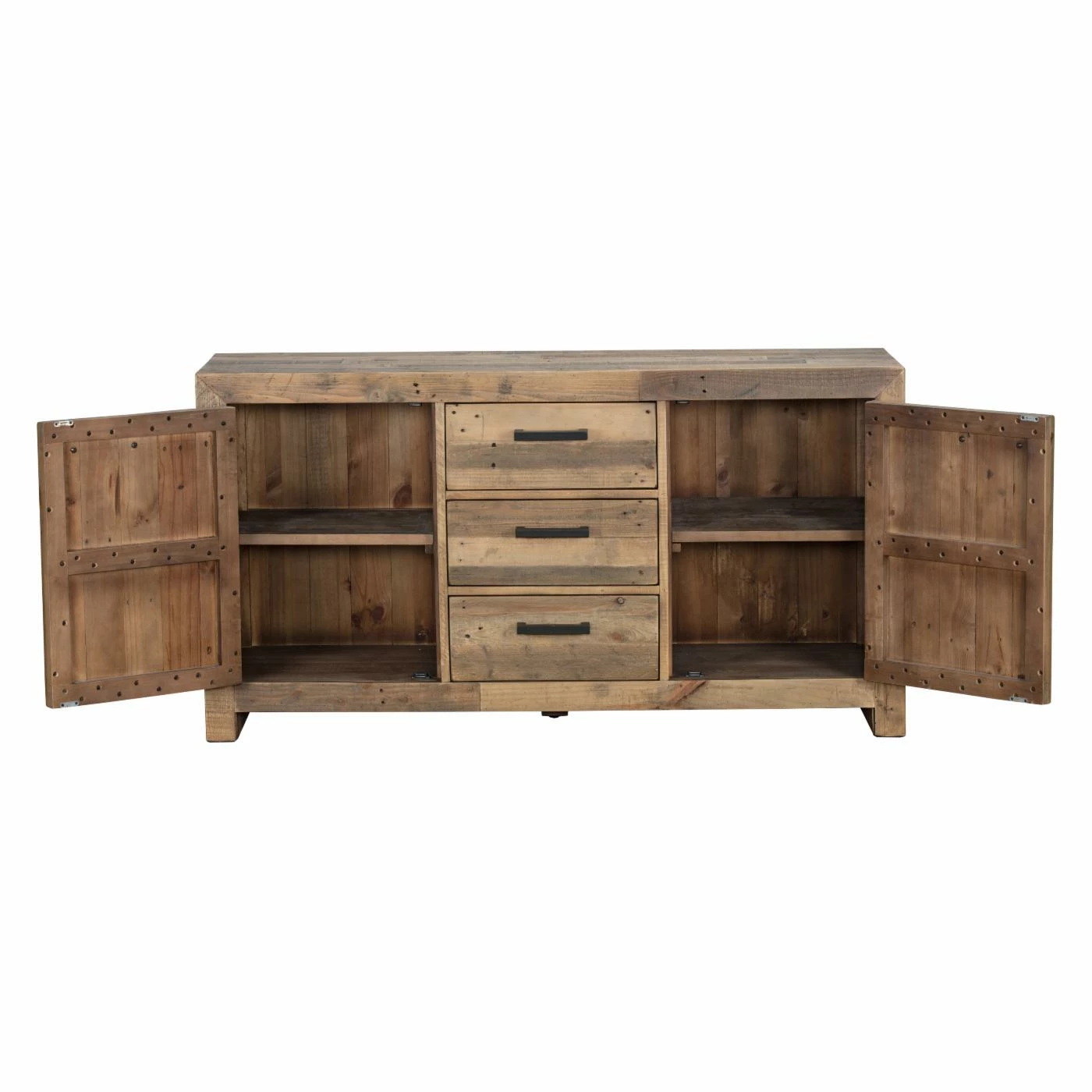 As a finishing touch to your rustic dining room, the Kosas Home Norman 3 Drawer Buffett can’t be beat. This buffet has a simple, robust design that’s handcrafted from reclaimed pine wood planks. It’s detailed with nail holes and natural color variations, and it comes in your choice of available hand-distressed finishes. For smart flatware and barware storage, this buffet features three drawers on side-mounted metal slides. One shelf is tucked behind two cupboard doors, offering room for larger serving pieces.