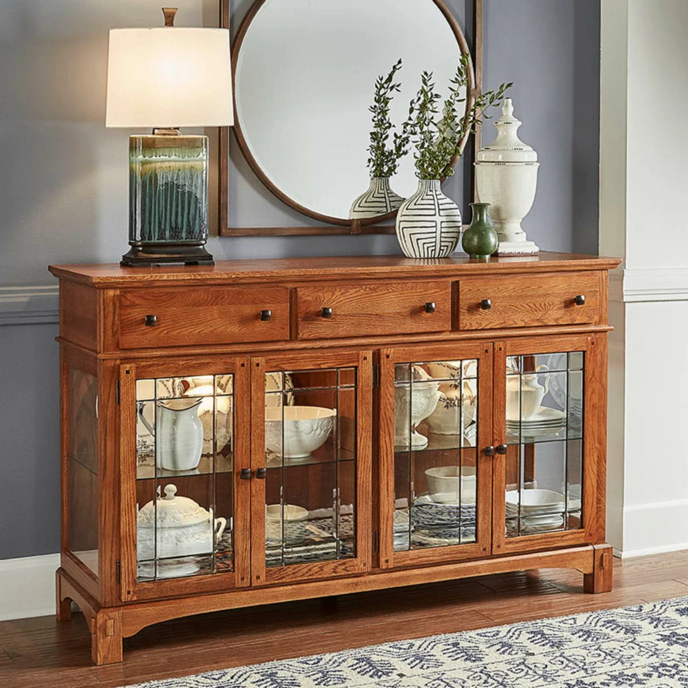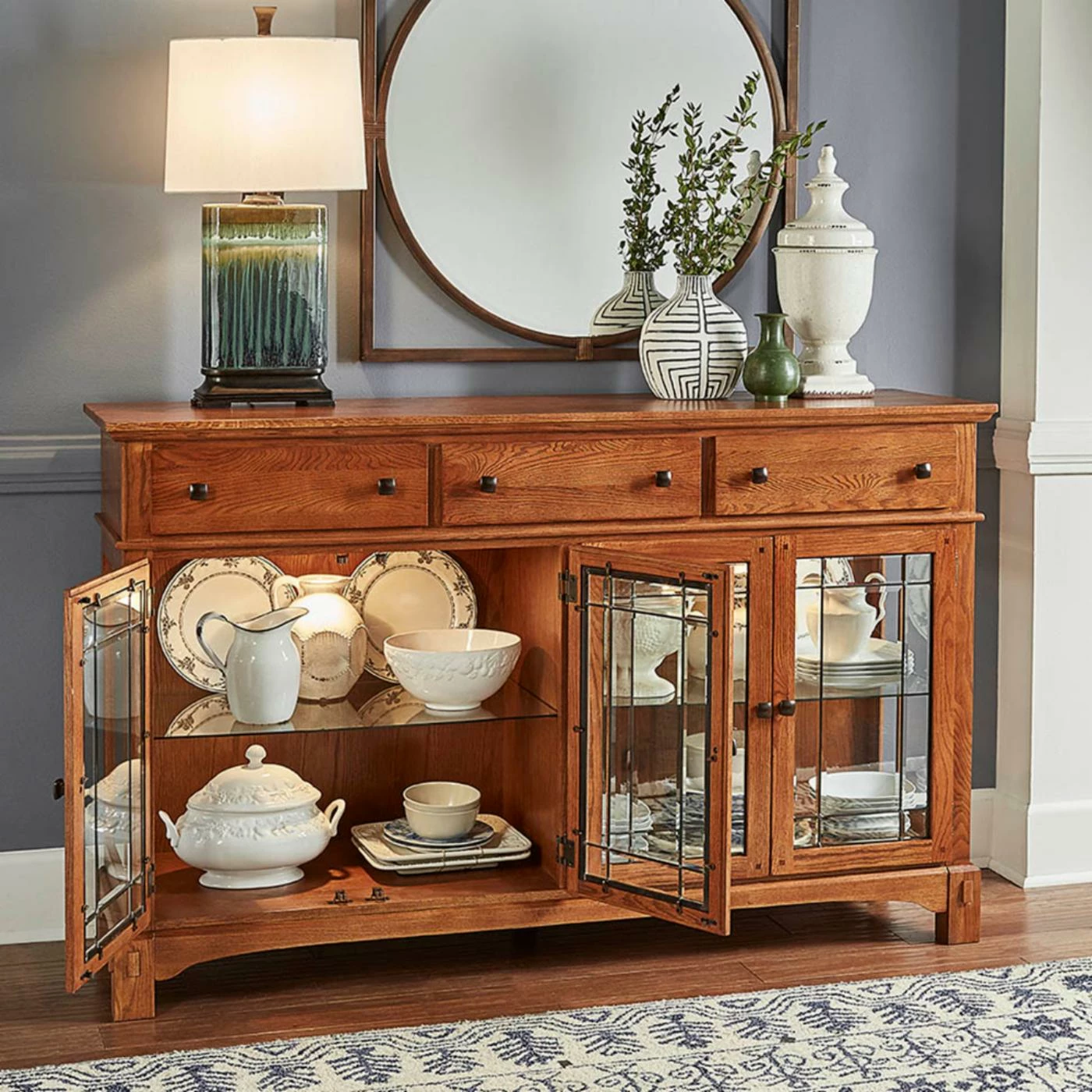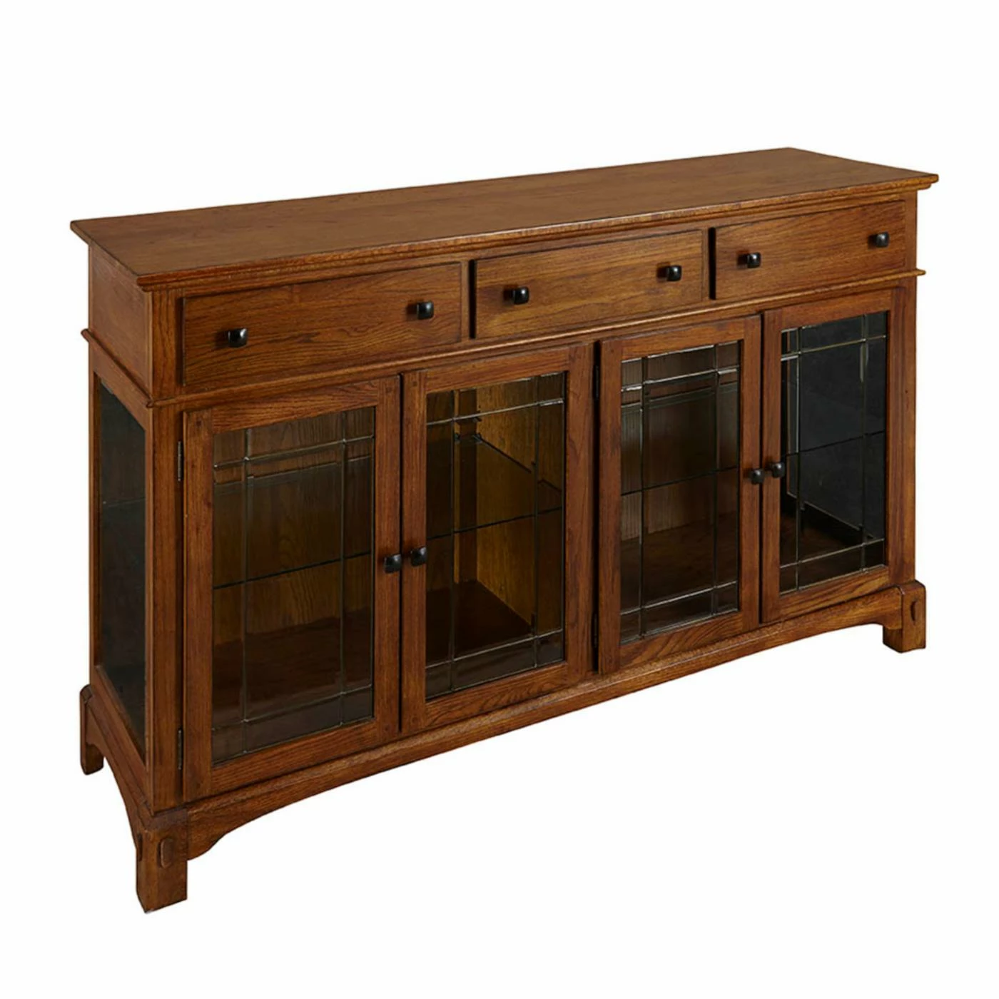 Leaded glass doors lend classic mission style to the A-America Laurelhurst Wide Dining Buffet. This wide dining buffet is a gorgeous way to display and store your dining essentials. Its heirloom-quality construction features solid oak and custom hardware. It’s available in select finish options. Three spacious drawers offer ample room and are well-built with English dovetailing on the front and back plus metal ball-bearing glides. Two sets of framed glass cabinet doors open French-style to reveal glass shelving and touch lighting within.