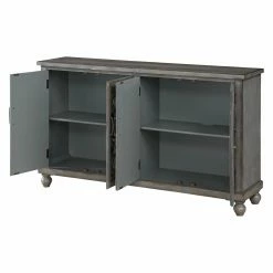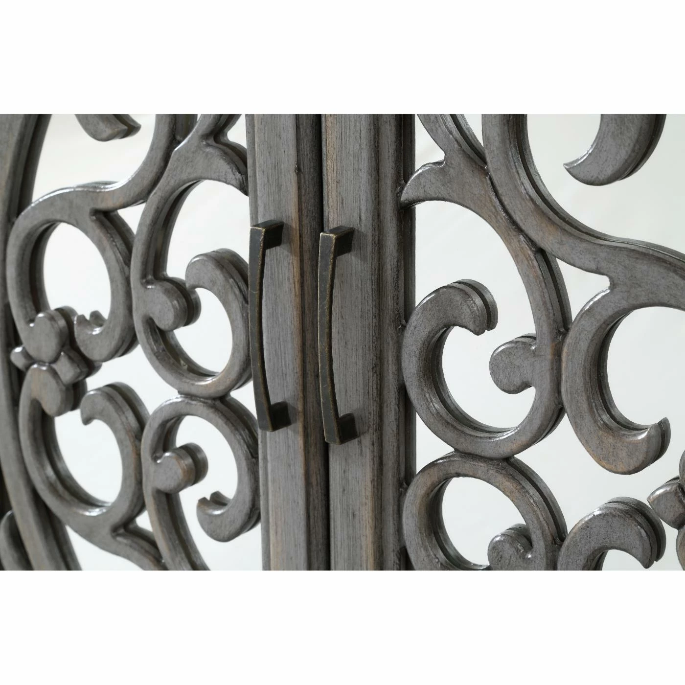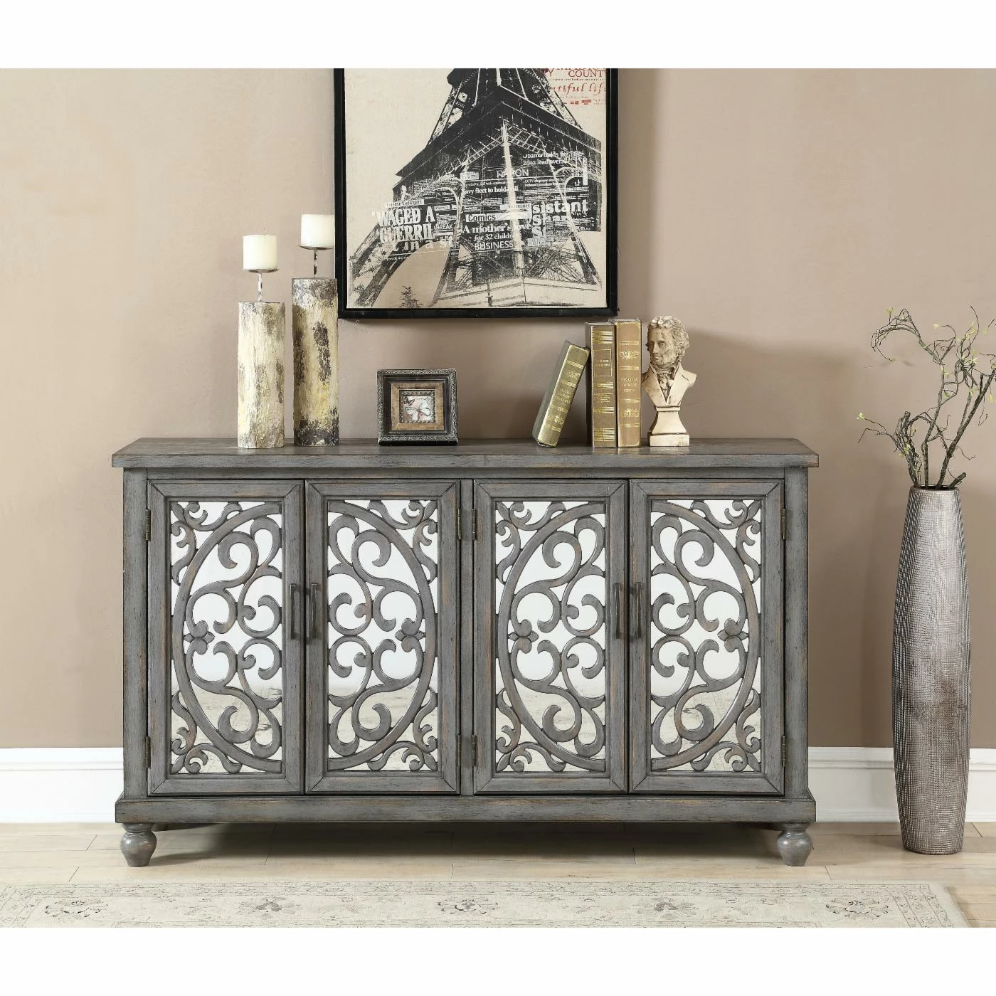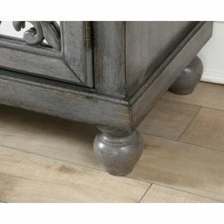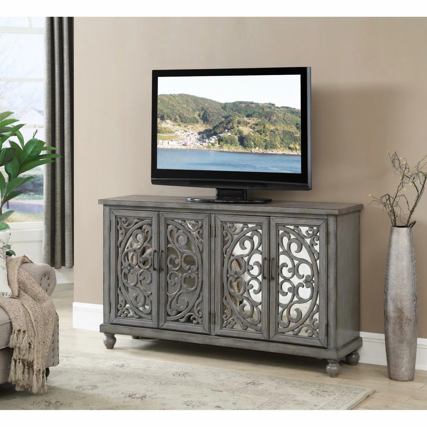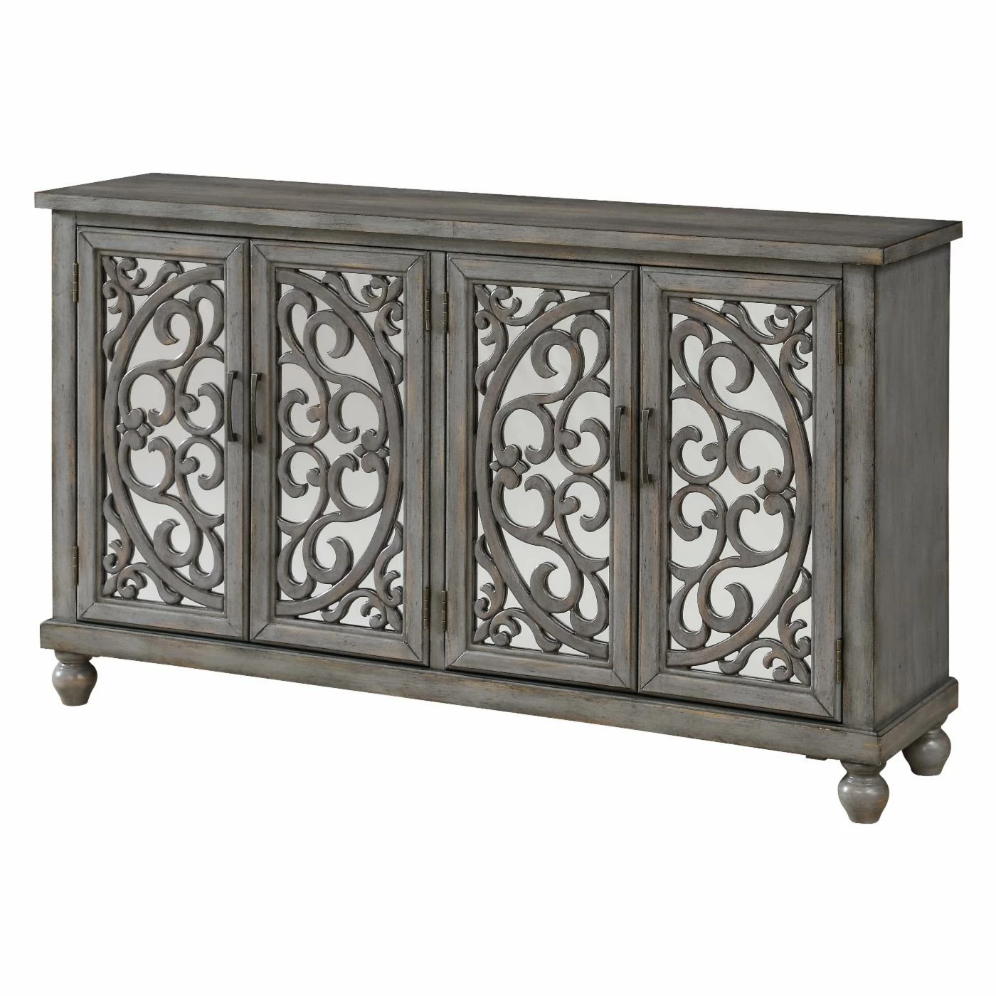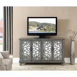 Ornate fretwork on mirrored doors makes the Coast to Coast Hammond Media Credenza a welcome addition to any living space. This media credenza comes in a gray wash finish with aged patina for an antiqued feel. For practical storage, its four doors open to reveal adjustable shelving and a cord management system.