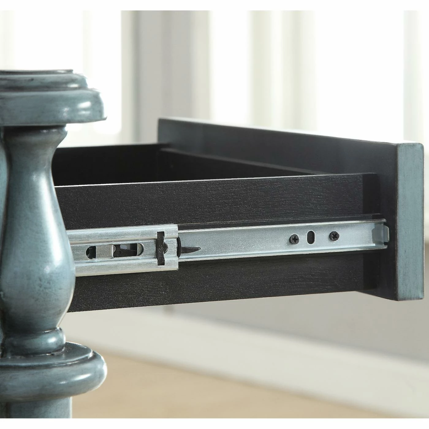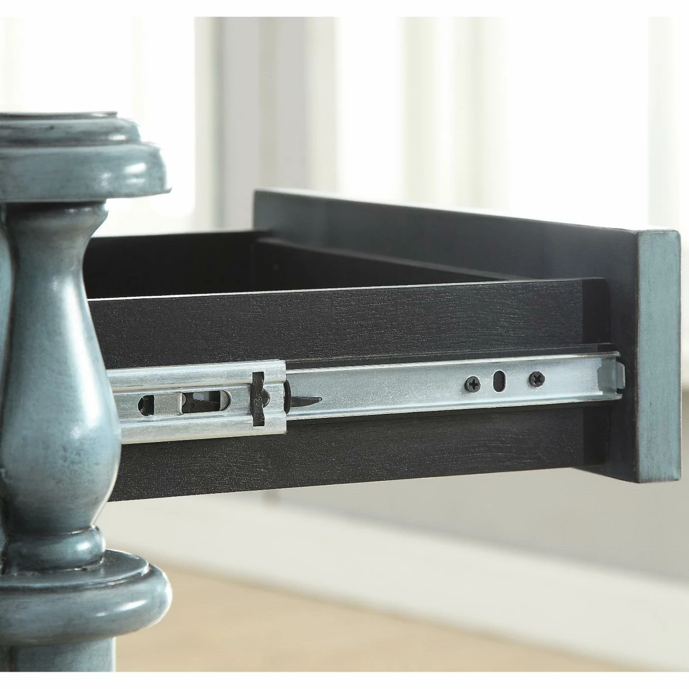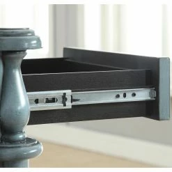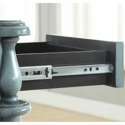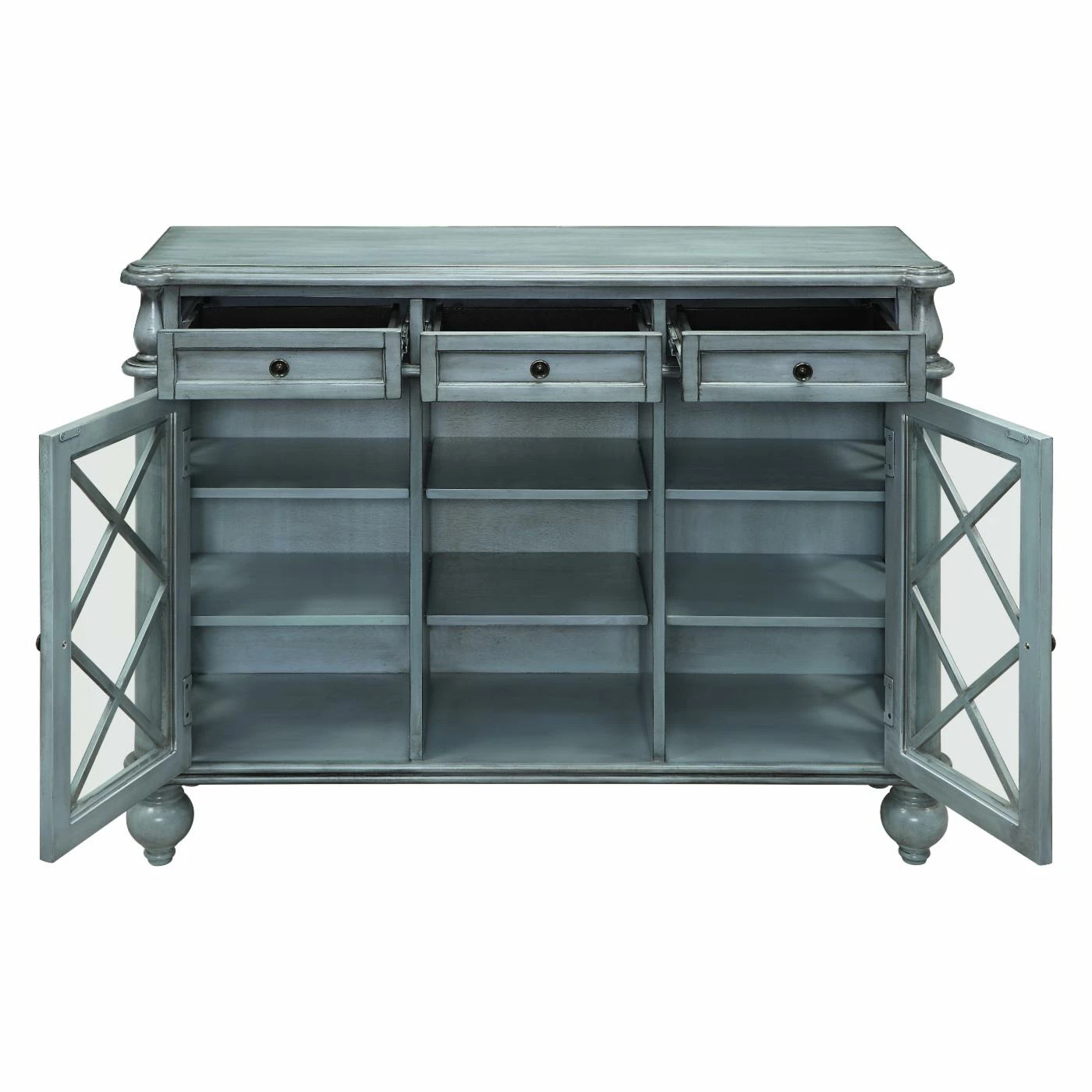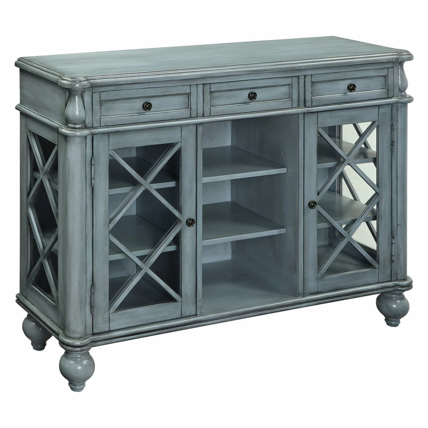 The Coast to Coast Mabry Mill Burnished Blue 2 Door Credenza is a dazzling side accent for your living room or bedroom. Engineered wood and poplar solids are used to construct the frame, perched on bun feet. A Chinese walnut veneer overlays the wood, finished in a soft burnished blue. Three recessed-front drawers are built into the top of the piece for concealed storage. The lower section includes two single-door cabinets with X-shaped slats and a clear glass backing panel. An open center area offers display. The cabinet interiors and open display area boast adjustable shelf.