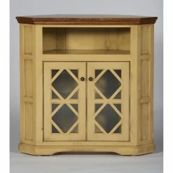 You may not be able to take your eyes off the Eagle Furniture 42 in. Shelter Bay Corner Credenza. This striking cottage-inspired credenza is made with solid birch wood in a total of 60 finish options to choose from. The two cabinet doors feature diamond pane glass doors with three shelves inside. This piece also features angled sides and an open top compartment in addition to a spacious solid wood distressed plank top.