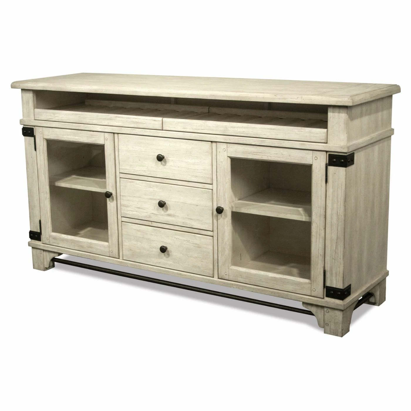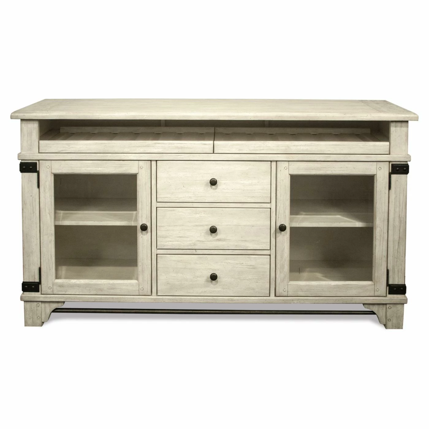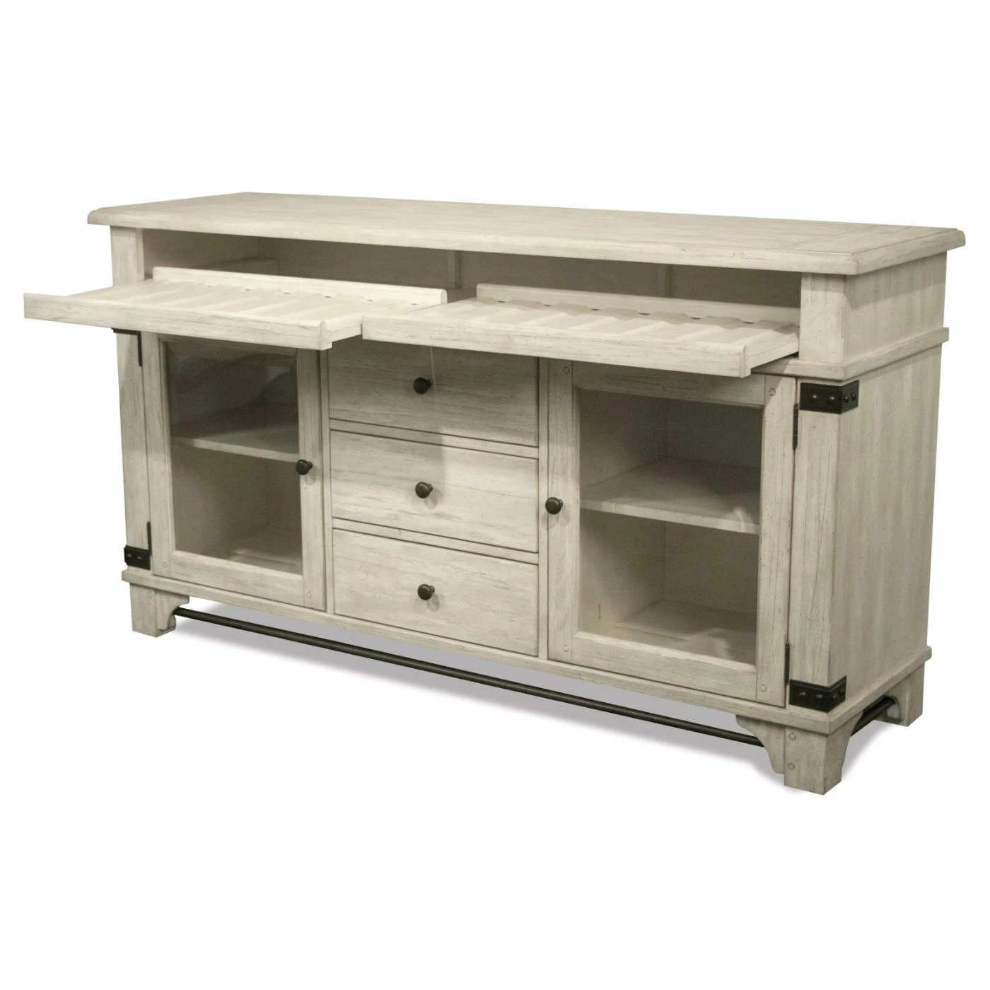Whether you live in the countryside or just wish you did, the Riverside Furniture Regan Sideboard offers farmhouse-inspired style for your dining space – not to mention some handy wine bottle storage. The two pull-out trays, complete with ball bearing extension glides, are sized just right for bottles of wine. Below, the three center drawers feature dovetail joinery, ball bearing extension glides, and felt-lined bottoms to protect delicate items. The two doors feature beveled glass fronts, and inside, you’ll find one adjustable shelf behind each door. Crafted of hardwood solids and veneers, the sideboard is finished in a Farmhouse White tone with decorative metal accents.