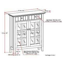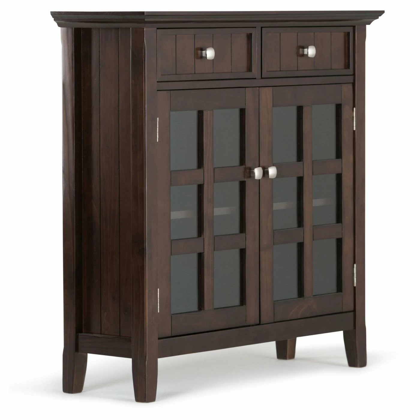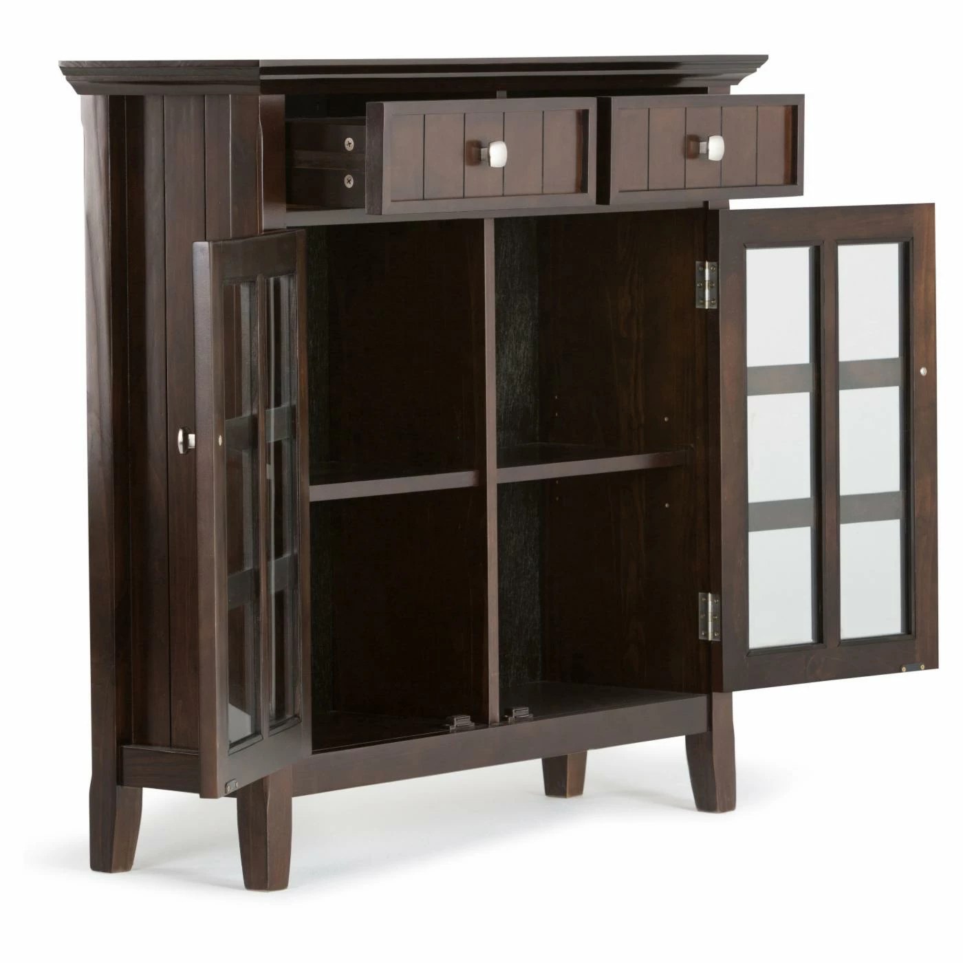 Take care of first impressions with the Simpli Home Acadian Entryway Sideboard. This extraordinary little cabinet features solid wood beadboard panels in a rich dark tobacco finish. Organize the gear you need for your comings and goings with two convenient drawers and tempered glass doors that open onto two adjustable shelves. The shelves can even accommodate bottles and glassware for entertaining.