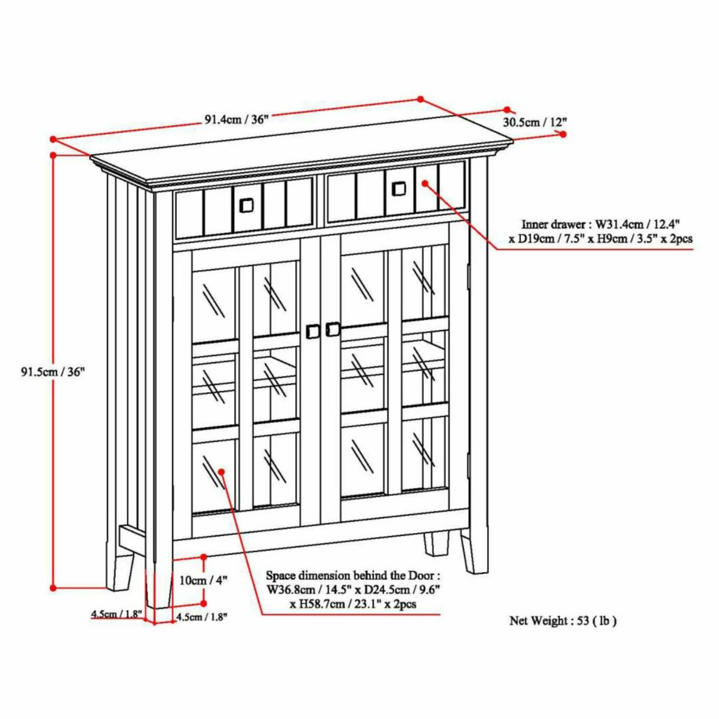 - Constructed of solid pine wood with glass doors