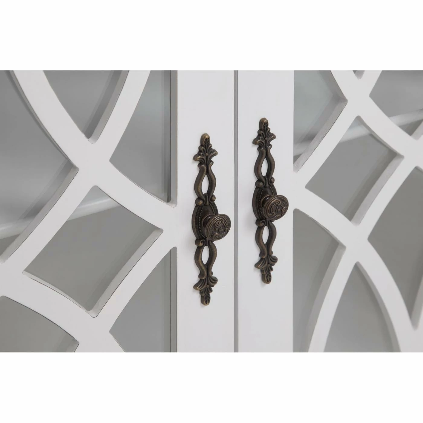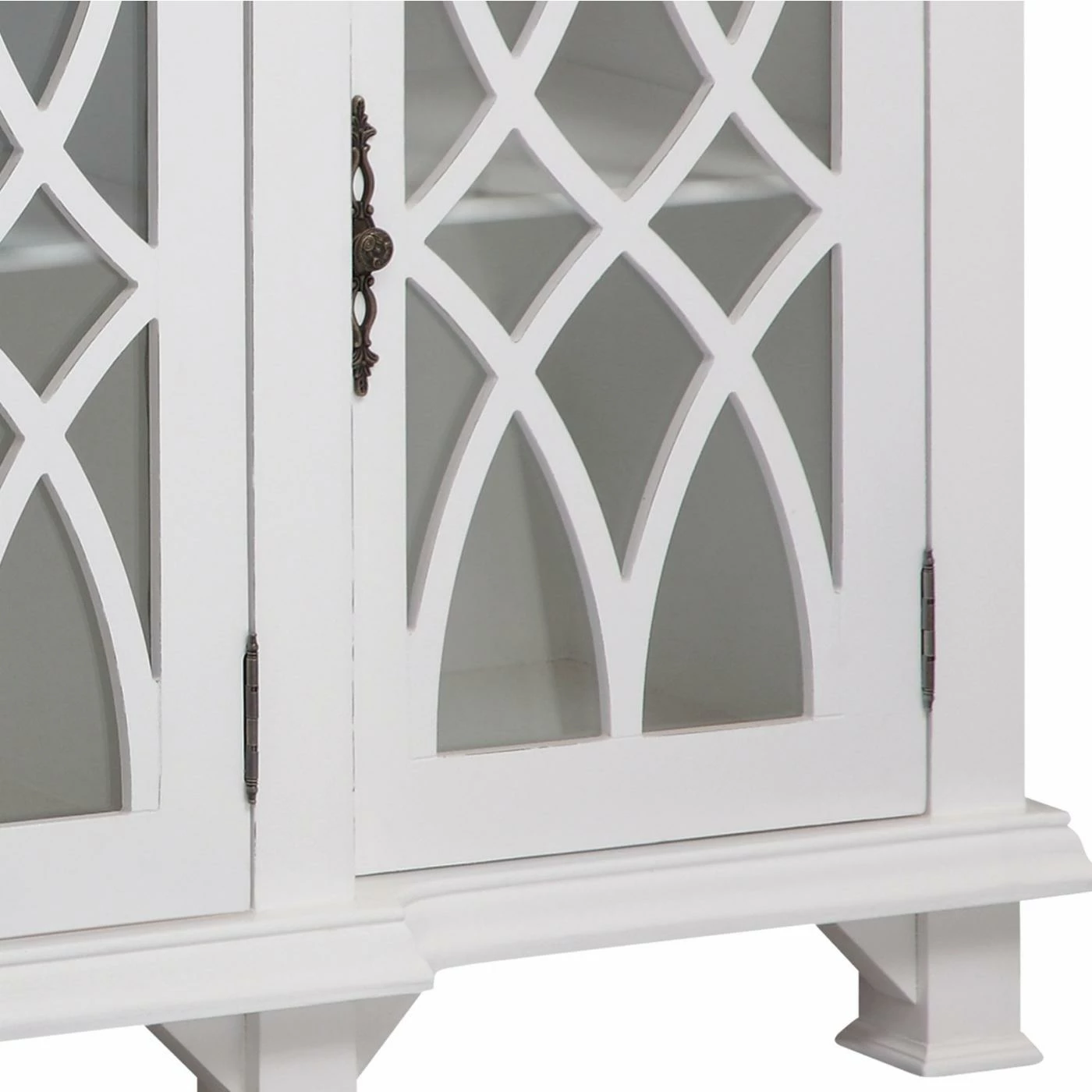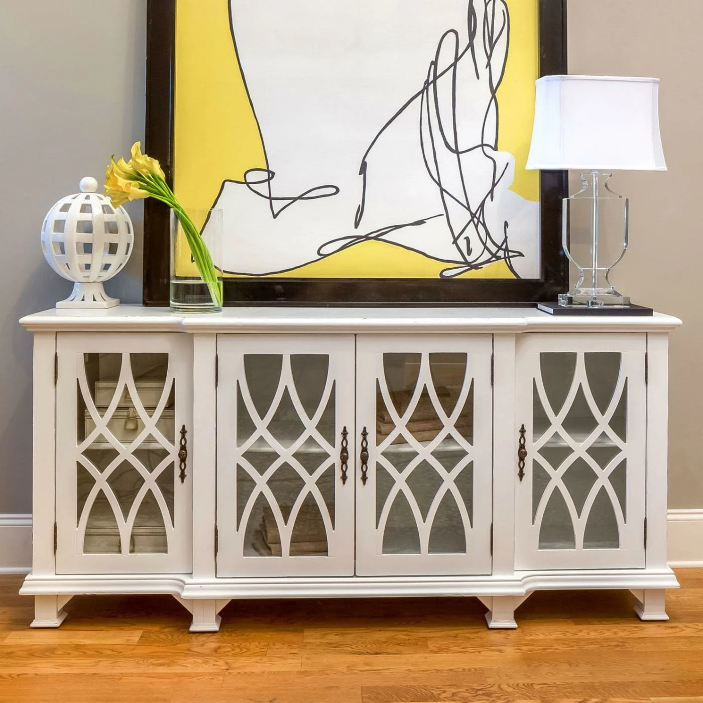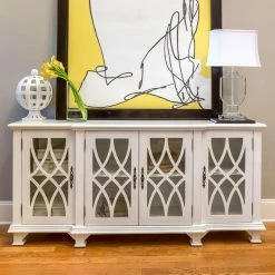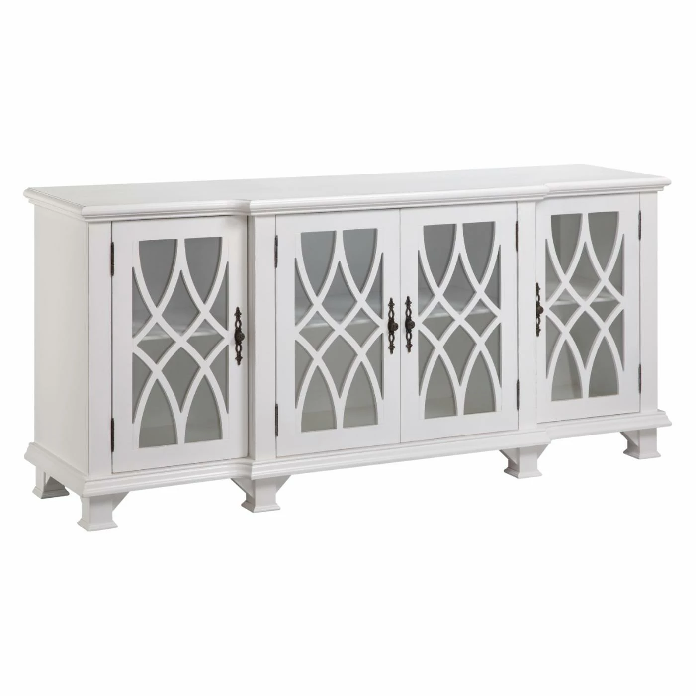 Detailed wood overlays on the glass doors of the Stein World Anastasia Four Door Sideboard make it an elegant accent piece for any interior space. The four doors allow you to see what’s displayed on the adjustable shelves within. This sideboard features a breakfront design and hand-painted white finish.