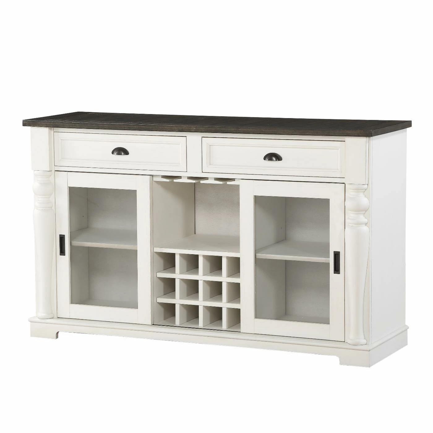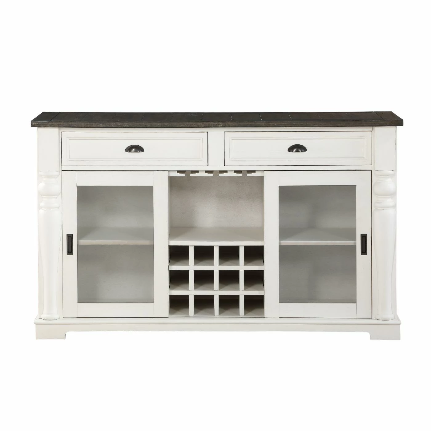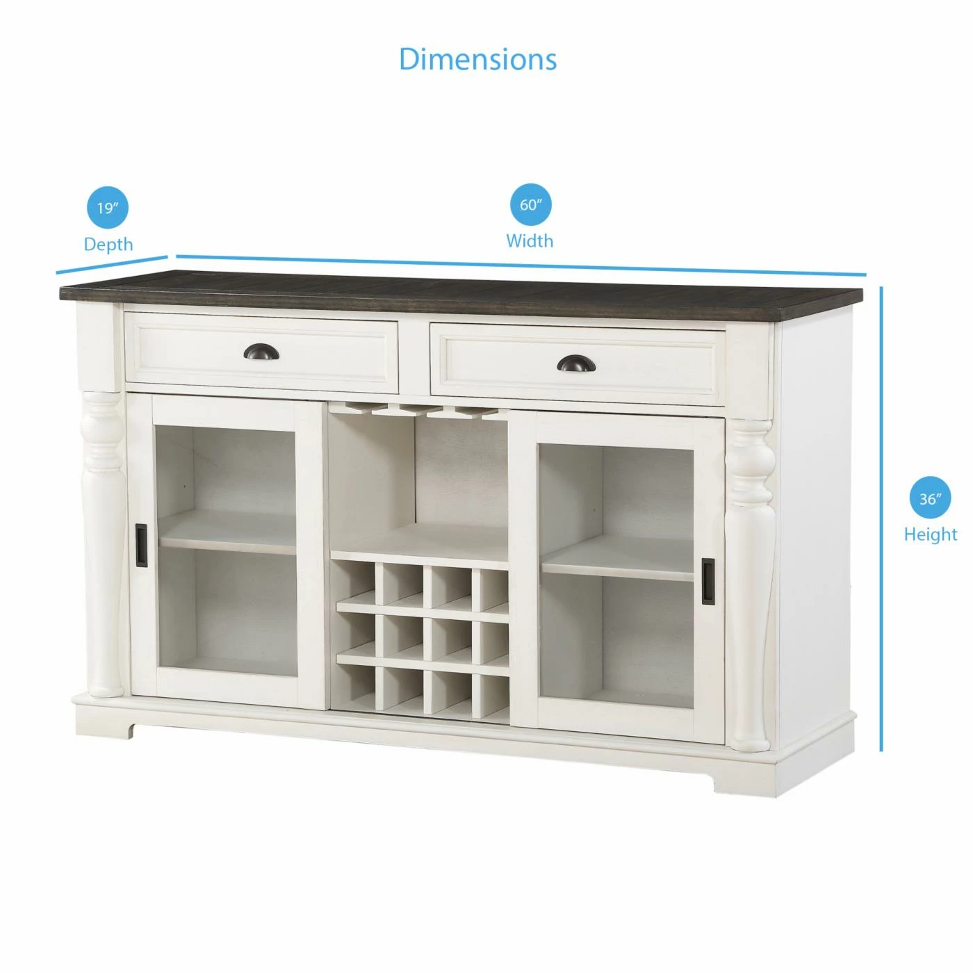Add a contemporary farmhouse touch to your dining space with the Steve Silver Co. Joanna Dining Buffet Server. This server features durable construction from select hardwoods and acacia veneers. It fairly brims with storage features like its wine compartment with space for twelve bottles, or its two shelves, open compartment, and two roomy drawers. Perched on elegant turned legs, this buffet server will lend designer style to dΓ©cor while providing terrific functionality. With its two-tone charcoal and ivory finish, this server is sure to pair like a dream. Assembly is required.