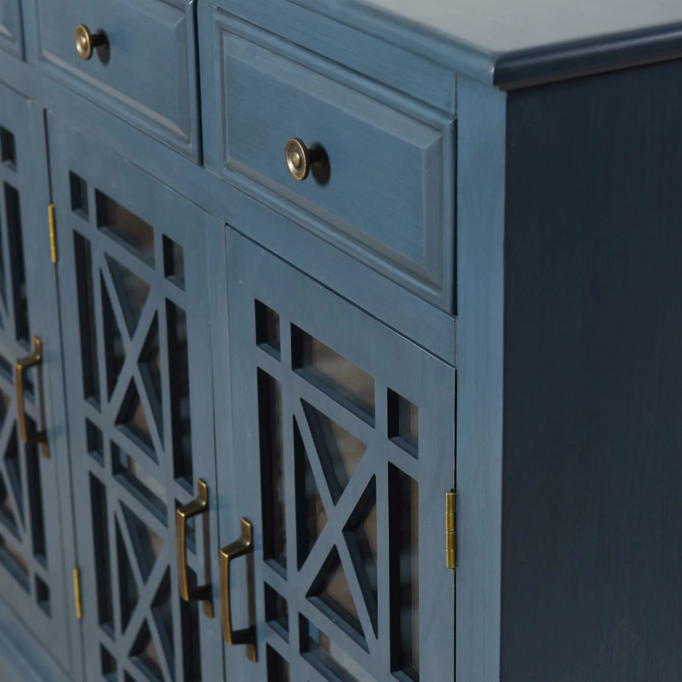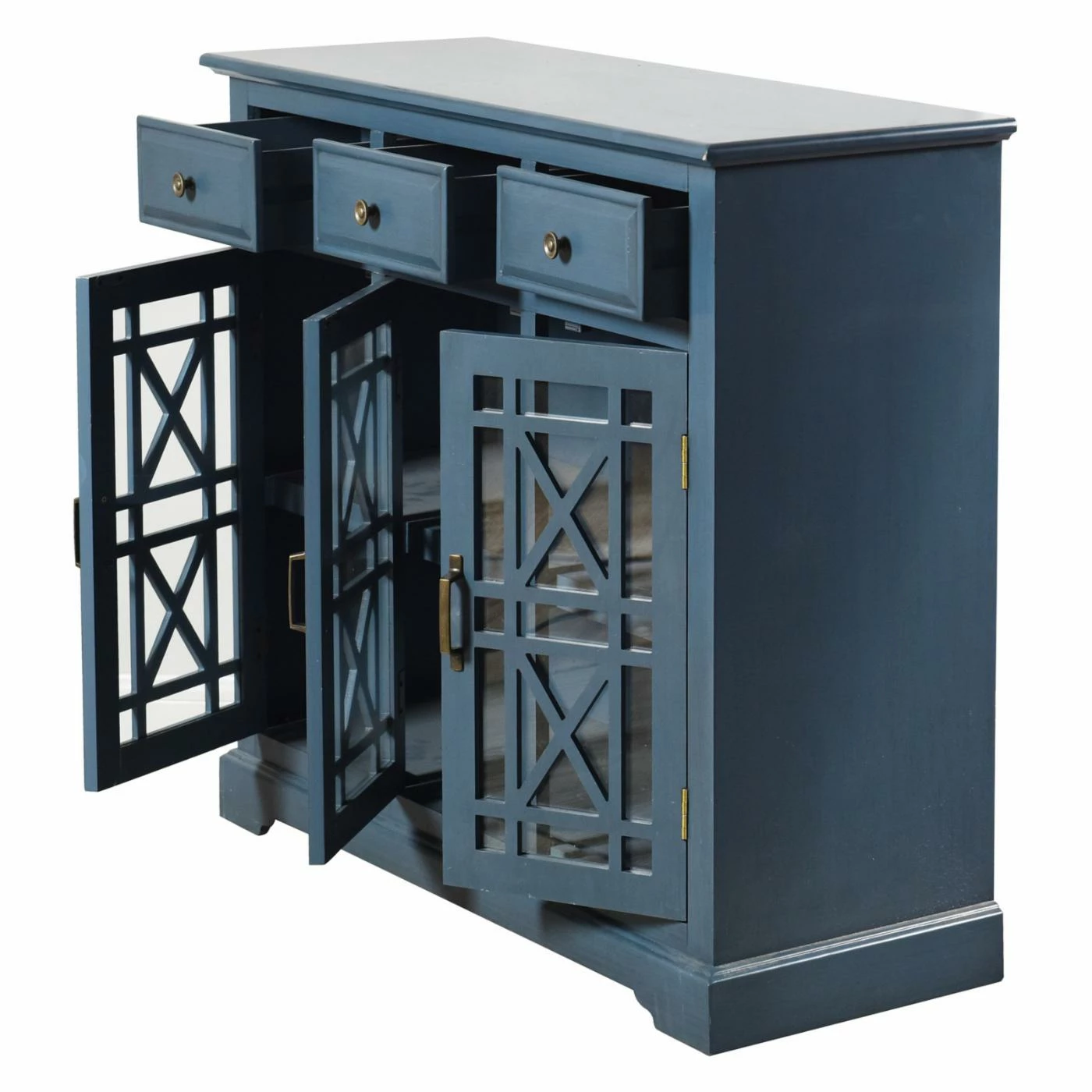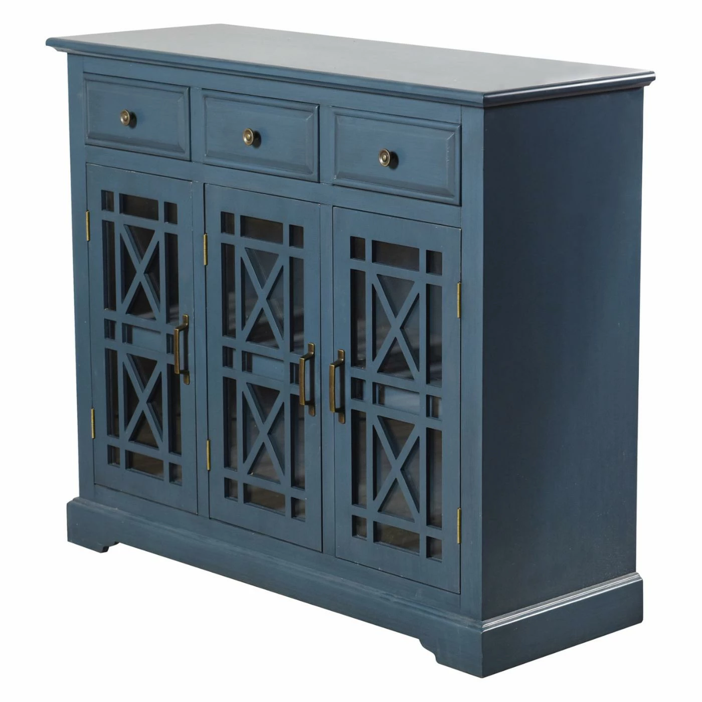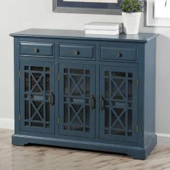 Display china, tableware, and glassware in the StyleCraft Archer Ridge Navy Blue Three Drawer Sideboard. Intricate geometric wood overlays add detail to the three doors in this sideboard. Each door opens to a handy shelf for two levels of display and three top drawers offer tucked away storage. This dining sideboard features a versatile navy blue finish that works well with nautical, cottage, and farmhouse interiors.