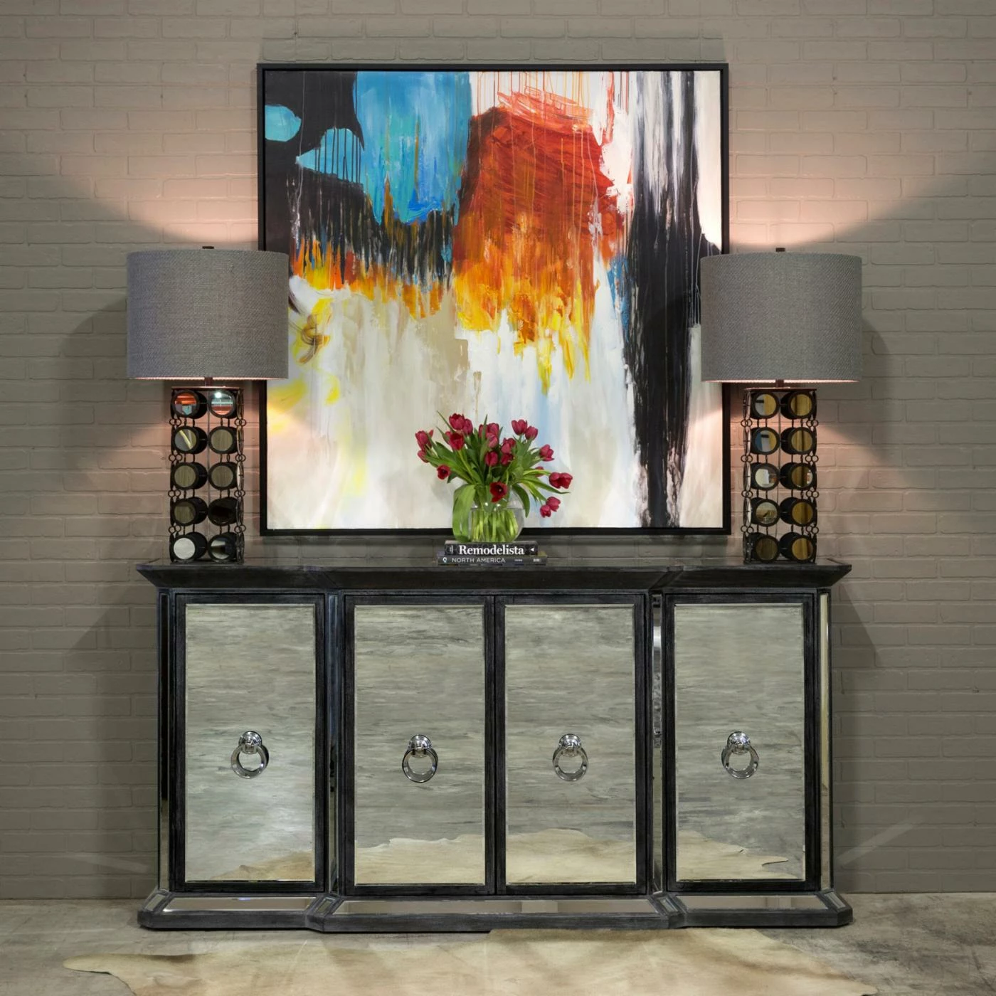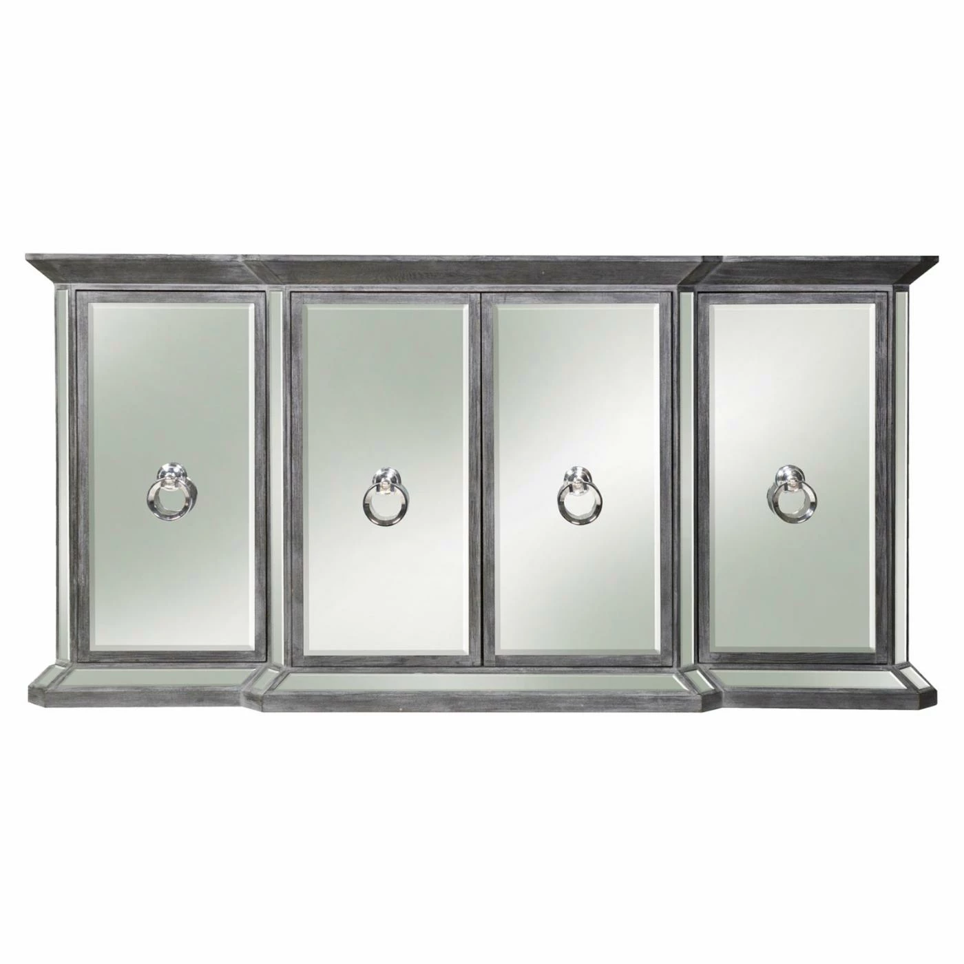 Mirrored surfaces add glam style to the Harp & Finial Crestmont 4 Door Sideboard while also allowing it to easily blend with any space. Four spacious cabinets conceal storage for dishes, linens, blankets, or other items, depending on where you put this sideboard. Add to the dining room for a luxe buffet or use it in the living room and add a pair of funky modern lamps. This sideboard looks just as at home in elevated modern spaces as it does in eclectic rooms with a variety of textures and colors. A metal ring door pull adorns the front of each cabinet door and the hardwood frame is finished in an understated dark gray.