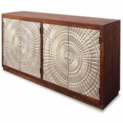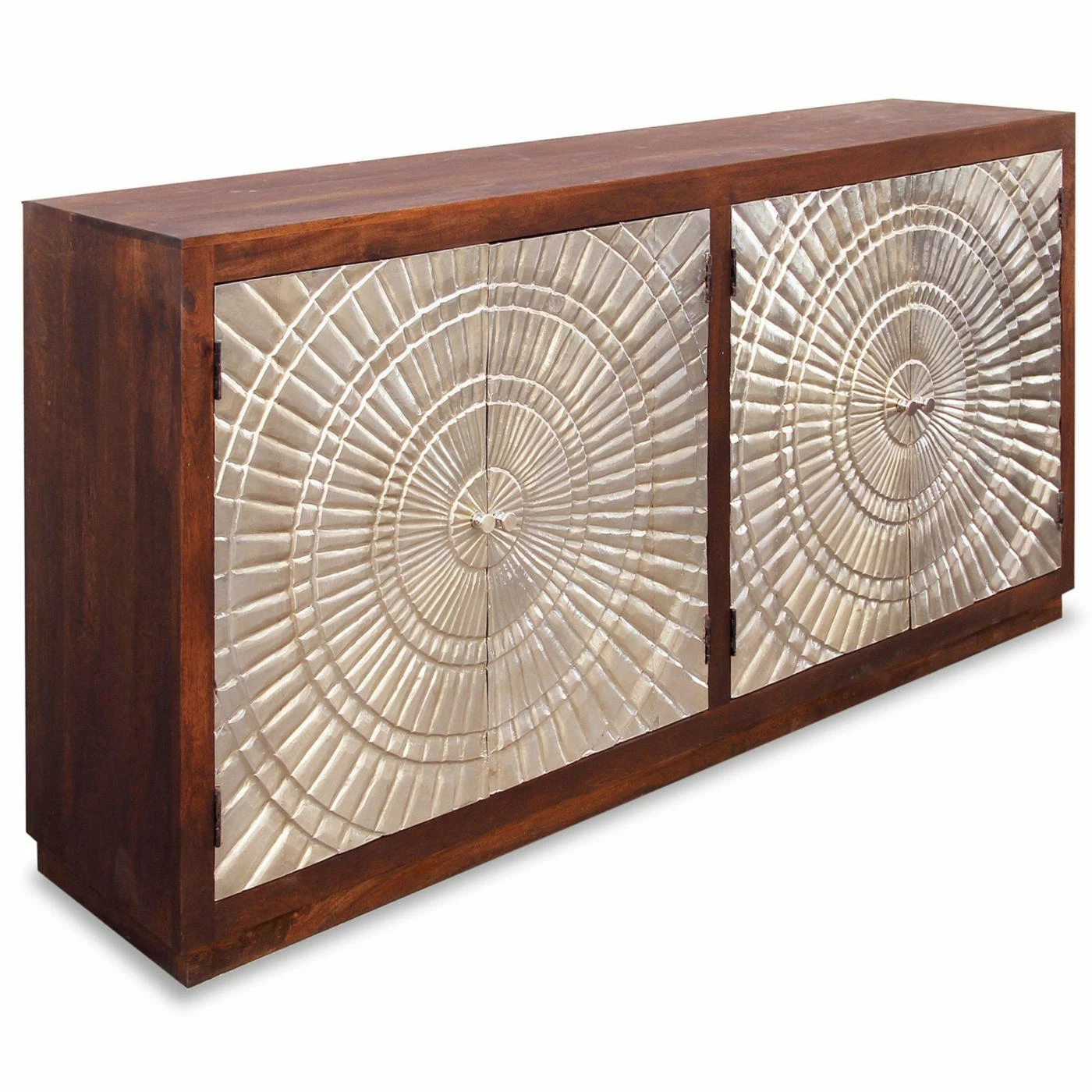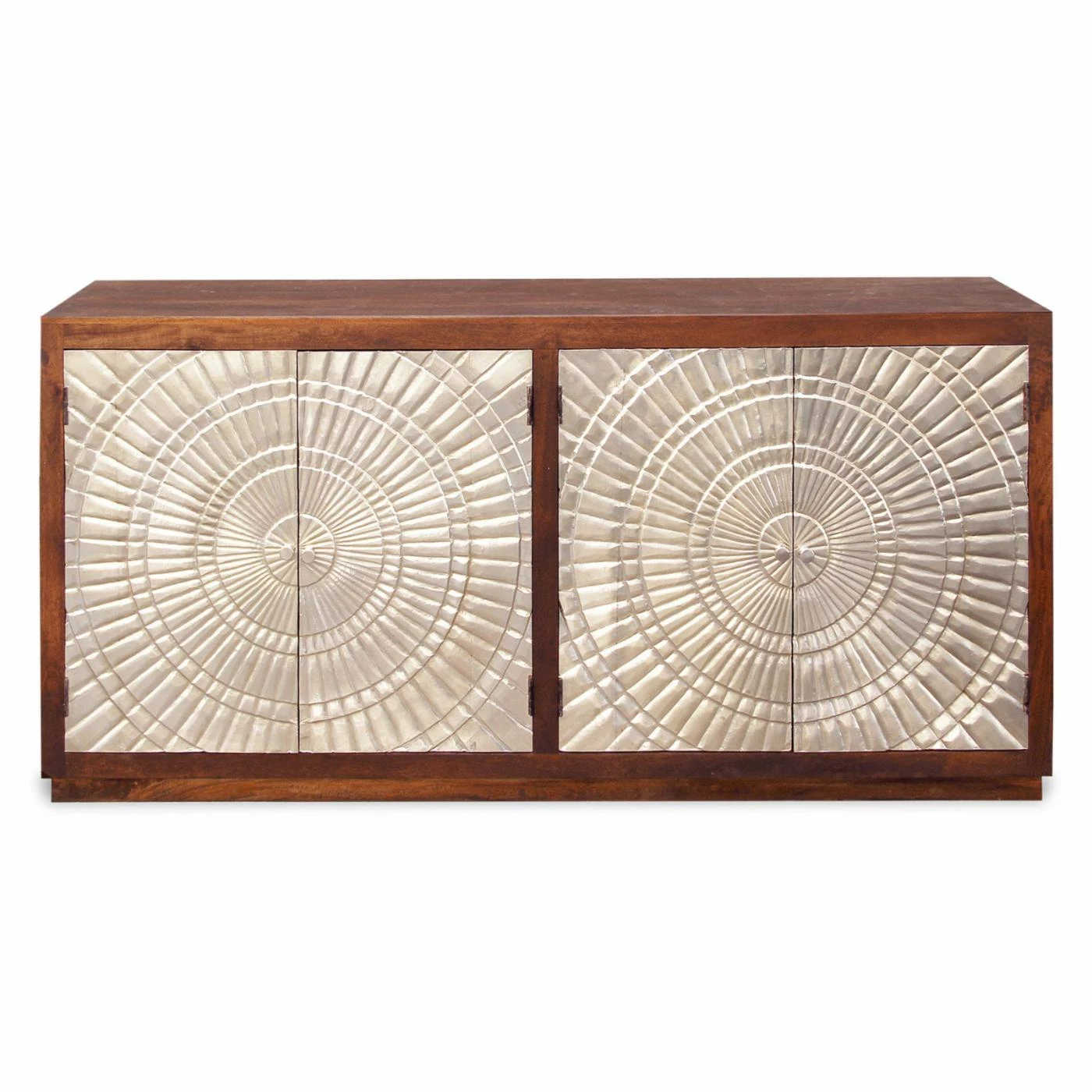 With its contrast of finishes and Art Deco-inspired motif, the Harp & Finial Halifax 4 Door Sideboard is almost too chic to be true. This sideboard’s four doors sport a stunning radiating disc pattern that’s enhanced by a luminous silver finish. The modern feel of the silver is countered by the dark walnut finish of the mango wood for a look that’s just striking. Open the four doors to reveal interior shelving that can be home to dishes, silverware, table linens, and more. Use the spacious top to display your favorite decorative pieces.