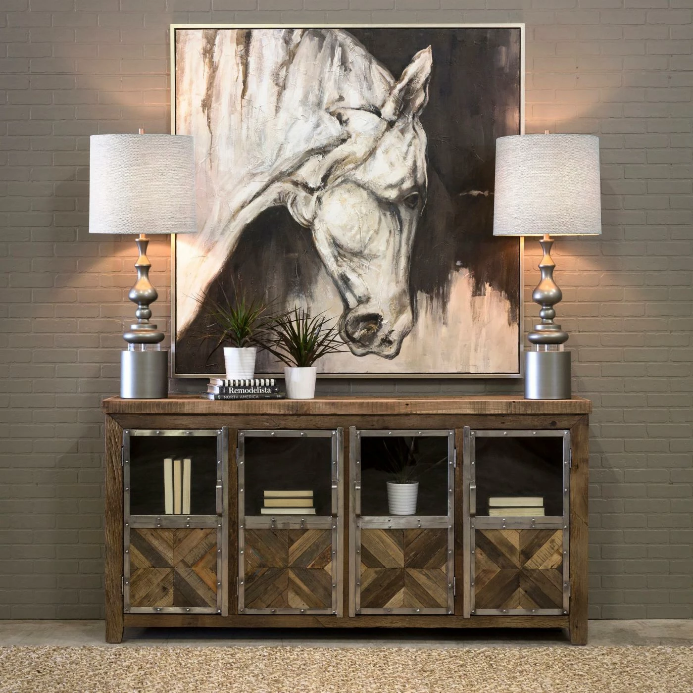 Add a little history and rustic style to your living room with the Harp & Finial Ayers 4 Door Sideboard. This sideboard is made of reclaimed railroad tie wood in a natural brown finish. The differences in the wood planks add layers and texture to the look. Each of the four wood doors are trimmed with chrome-finished metal with rivet details. The bottom half of the doors have X designs and the tops have clear glass to allow for display. Use as storage in your living area or as a buffet in the dining room.