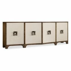 Spacious and spectacular, the Hooker MΓ©lange Credenza TV Stand is an ideal addition to your transitional-style living room or den furniture set. Its durable frame incorporates four cabinet doors, each with two adjustable shelves (eight shelves total). The front of the doors are upholstered with a beautiful white leather and feature floral square metal knobs. Sturdy poplar hardwood is used to craft the frame, patterned with a pecan veneer surface. The top surface is delicately scalloped.
