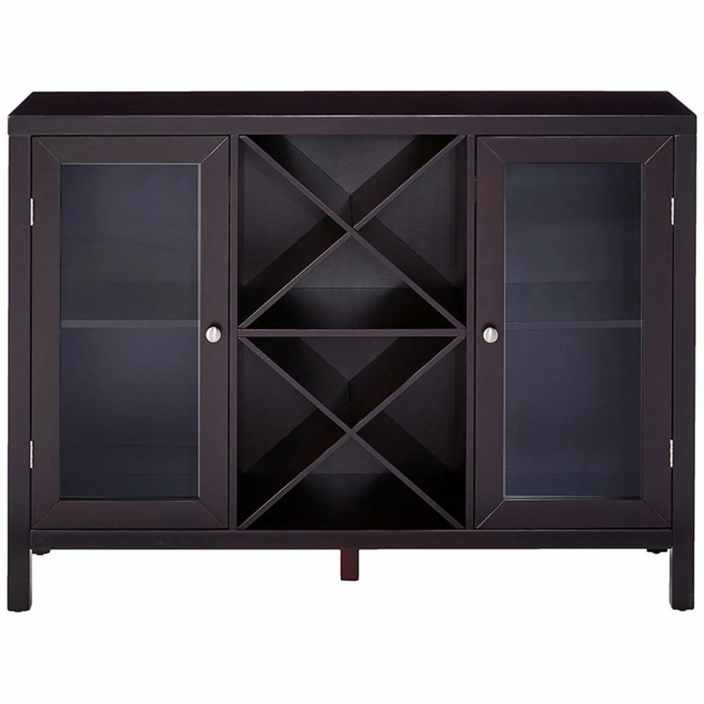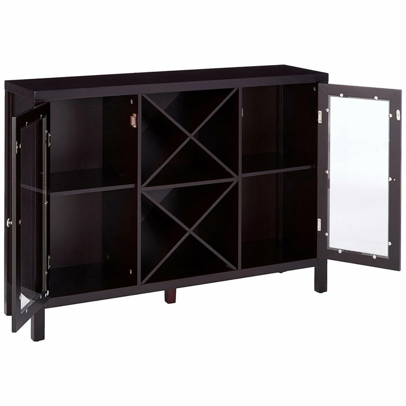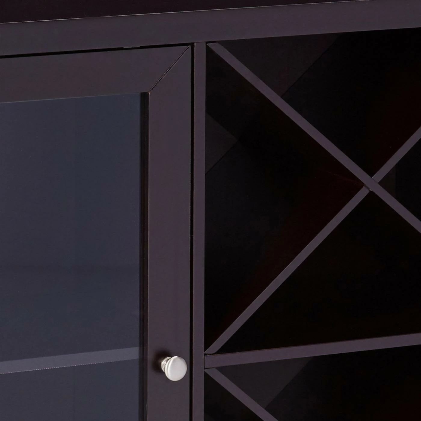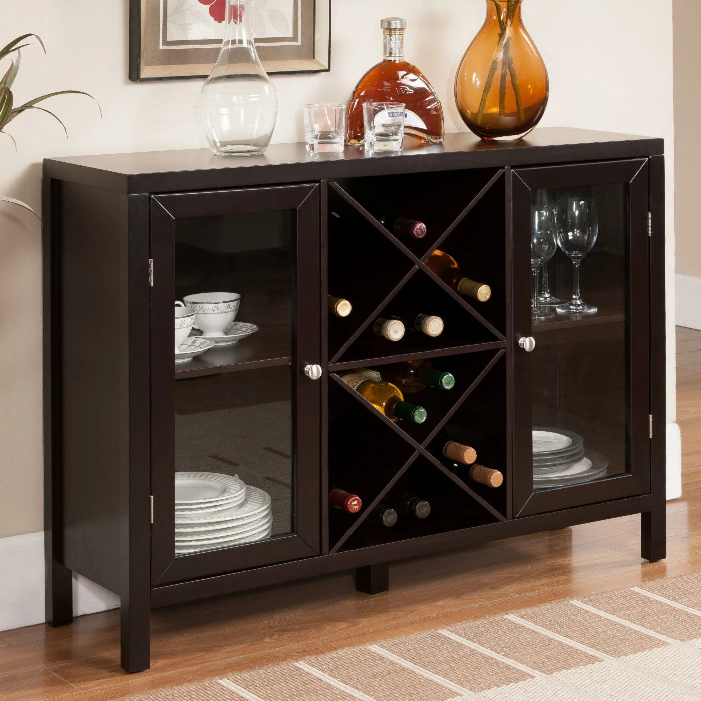Perfect for wine enthusiasts you love to entertain, this K & B Furniture Co. Espresso Wine Buffet is a stylish way to house your wine collection and serving pieces. Two X racks offer versatile 24-bottle storage. Two wood-framed glass doors offer a glimpse at what you have stored on the two shelves within this wine buffet.