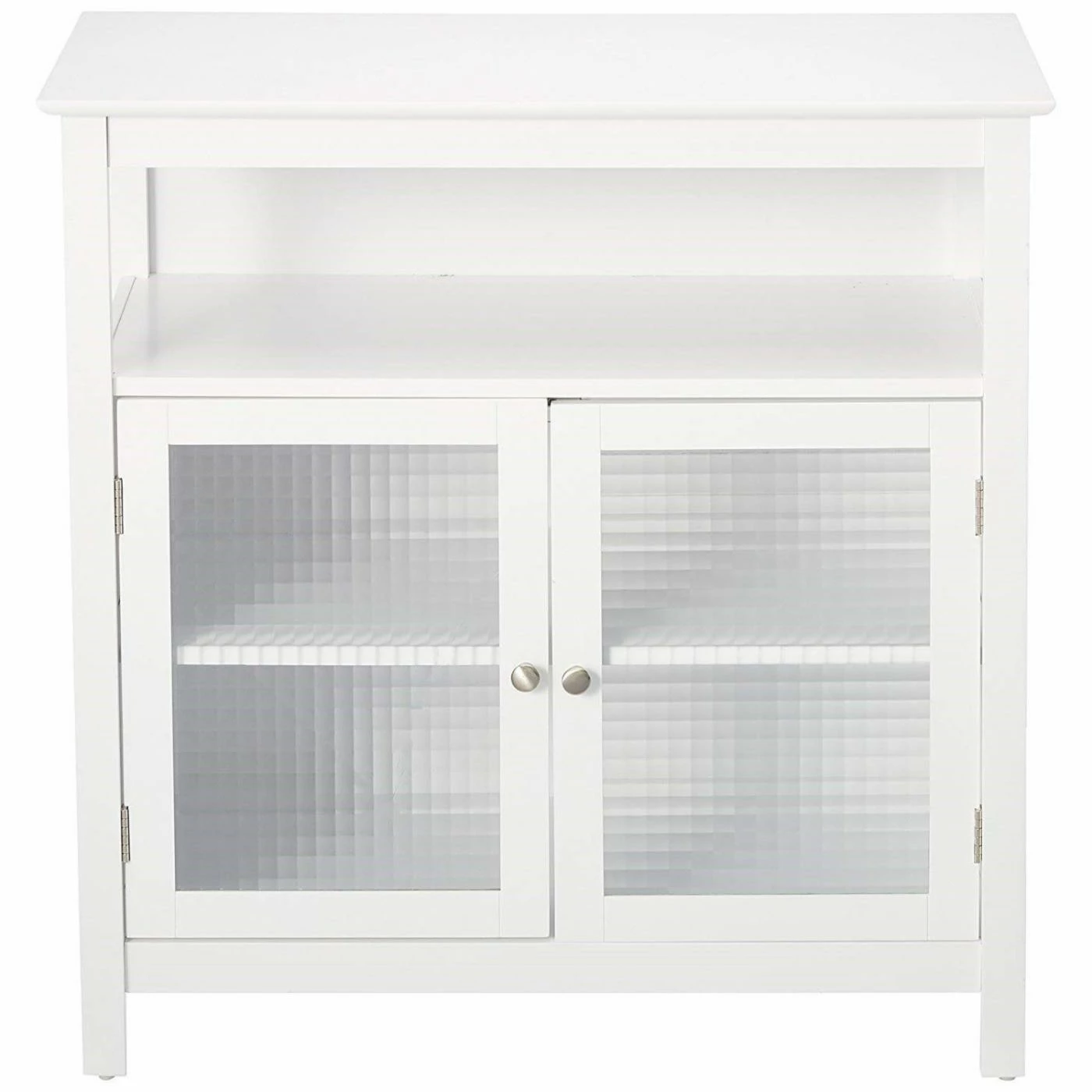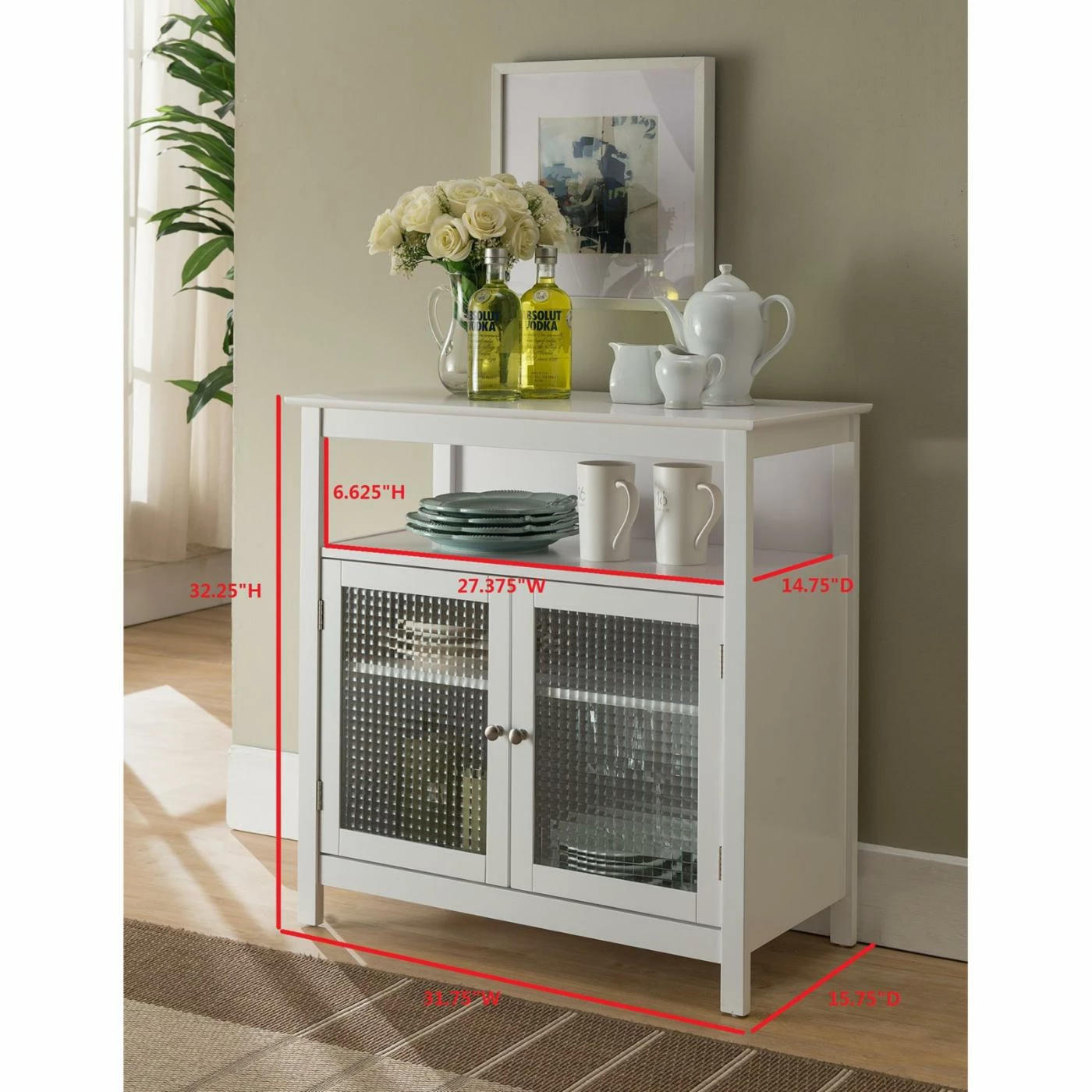 The K&B Furniture White Wood 2 Door Cabinet with Shelf channels country cottage charm. This crisp white cabinet is equipped with a spacious top and shelf for ample display space. The glass-front cabinet doors open to reveal additional shelves so you can store utensils and dishware.