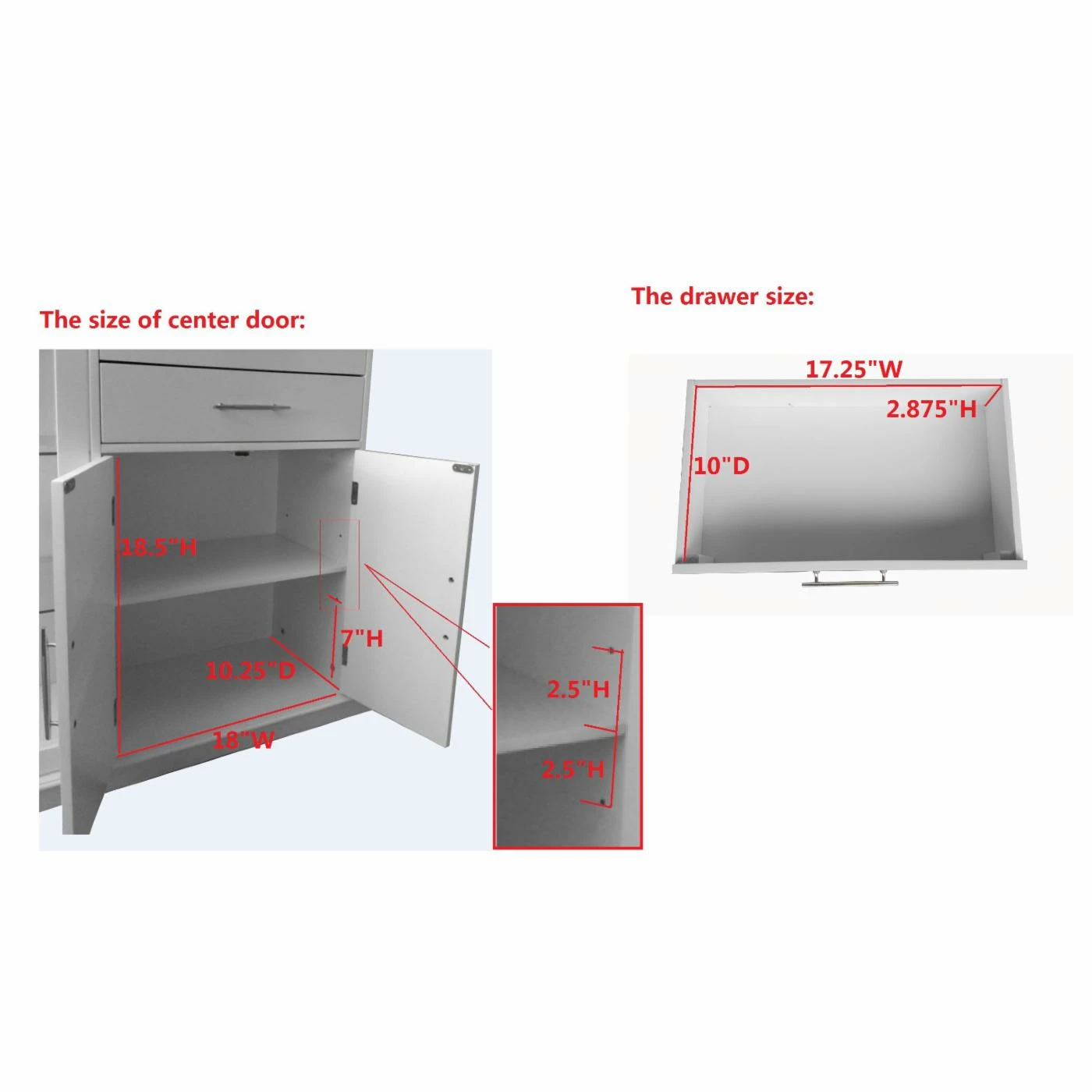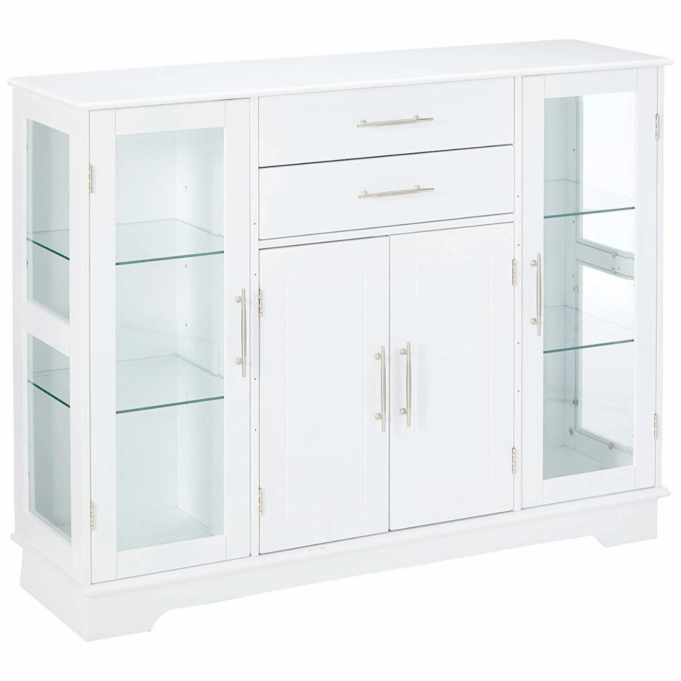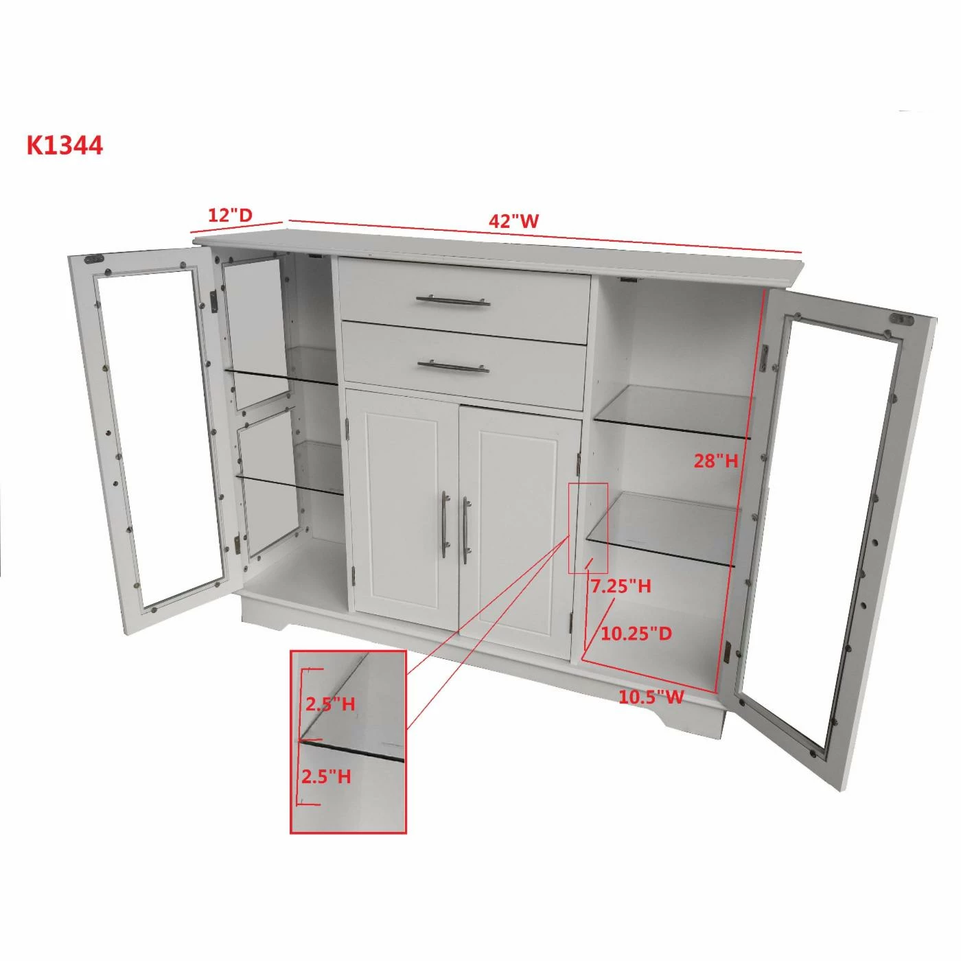 The K&B Furniture White Wood 4 Door Kitchen Storage Cabinet channels clean, modern design. It’s equipped with two drawers and eight shelves, ample space to store various dishware. Two of the cabinet doors feature a glass exterior so you can peek into the contents. This cabinet is complete with a crisp white finish.