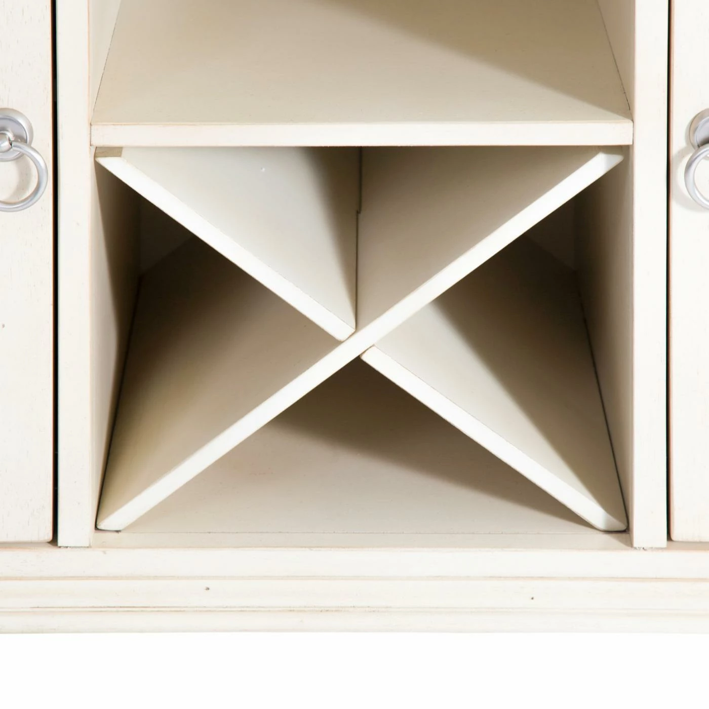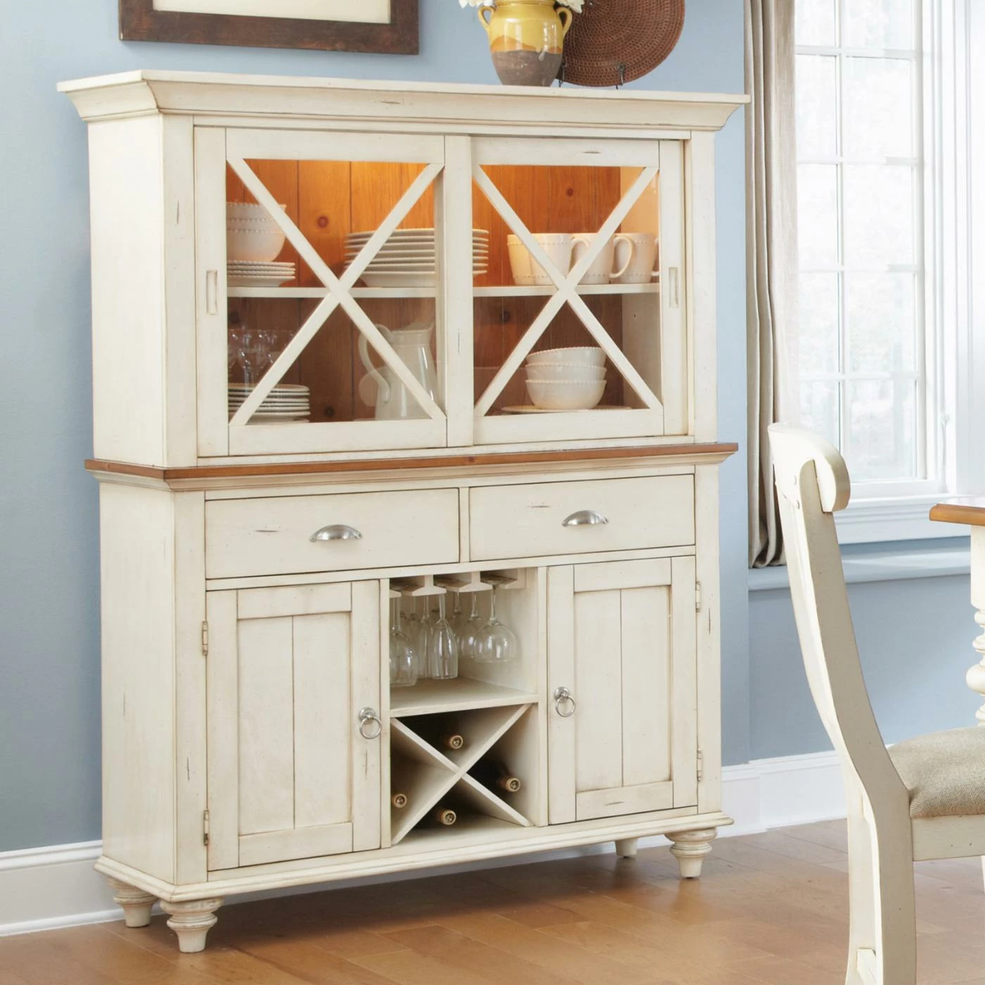 Casual coastal design comes home with the Liberty Furniture Ocean Isle Dining Buffet. This dining buffet has the charm of a cozy cottage by the sea. It’s made of hardwood solids and New Zealand pine veneers in a distressed bisque and natural pine finish for a two-tone look. Elegantly styled and casually proportioned, this buffet works in a dining room as well as a kitchen. It features two felt-lined top drawers, an open cubby with stemware racks and a wine bottle storage X flanked by two wooden doors for concealed storage.