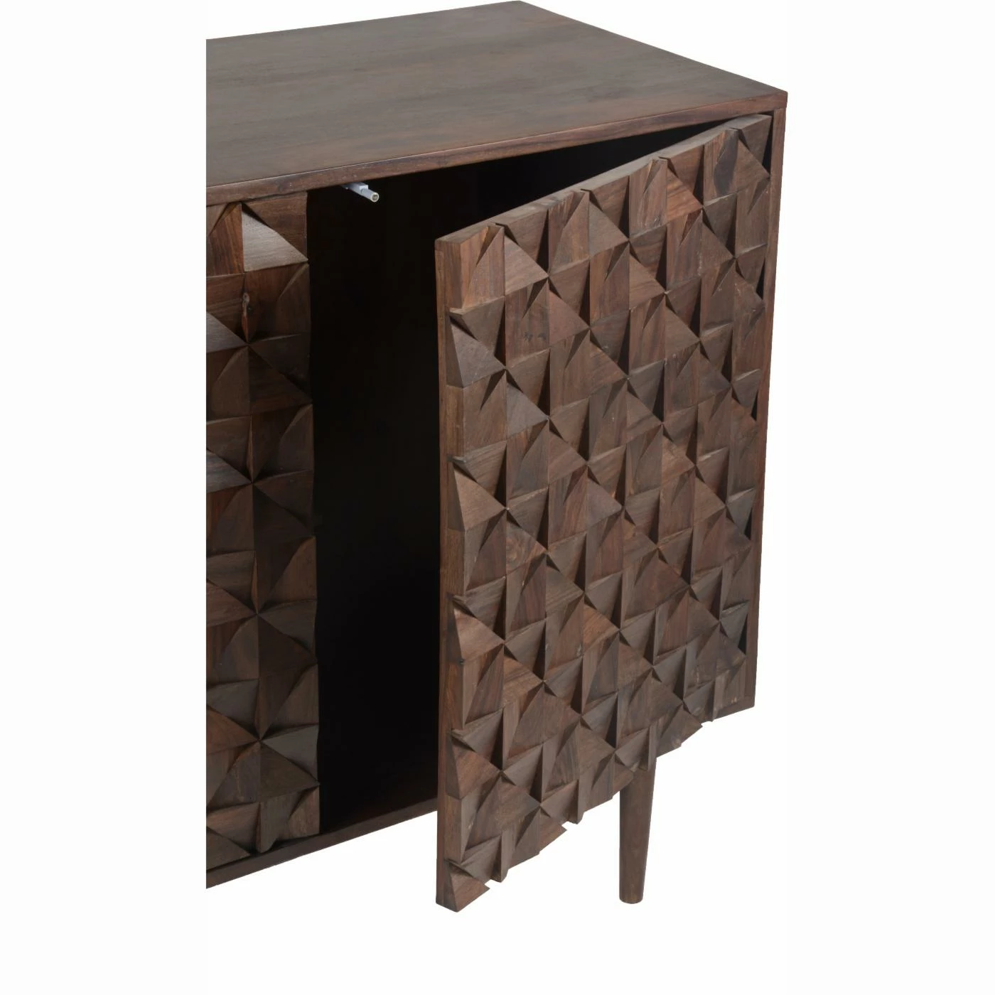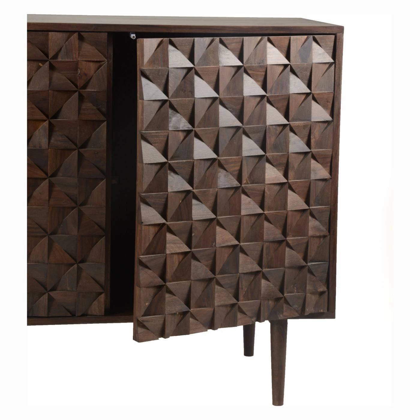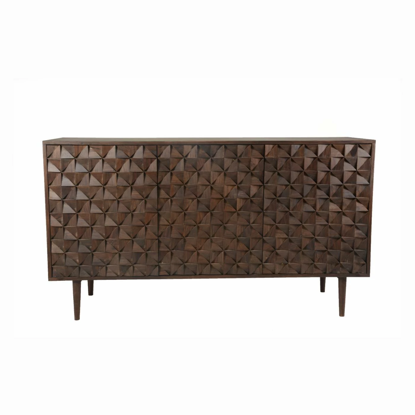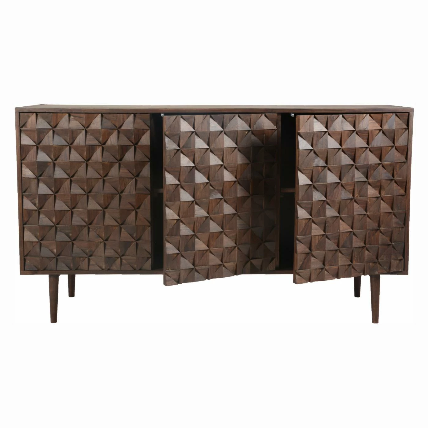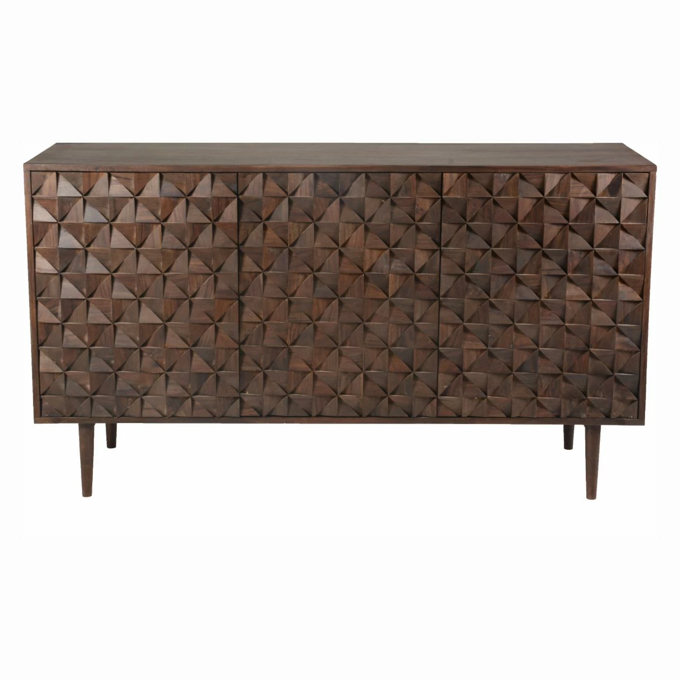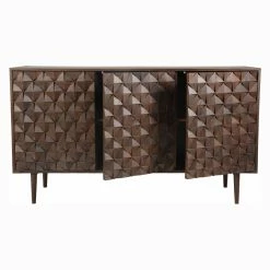 With exotic Sheesham wood and striking geometric faceted doors, the Moes Home Pablo 3 Door Sideboard commands attention in any space. Dress up your dining room, den, or kitchen with this striking contemporary piece, finished in a warm dark brown. Hardware-free doors ensure a seamless facade, and the sideboard’s three spacious cabinets provide a convenient storage solution for china, glassware, or serving dishes. Some assembly is required upon delivery.