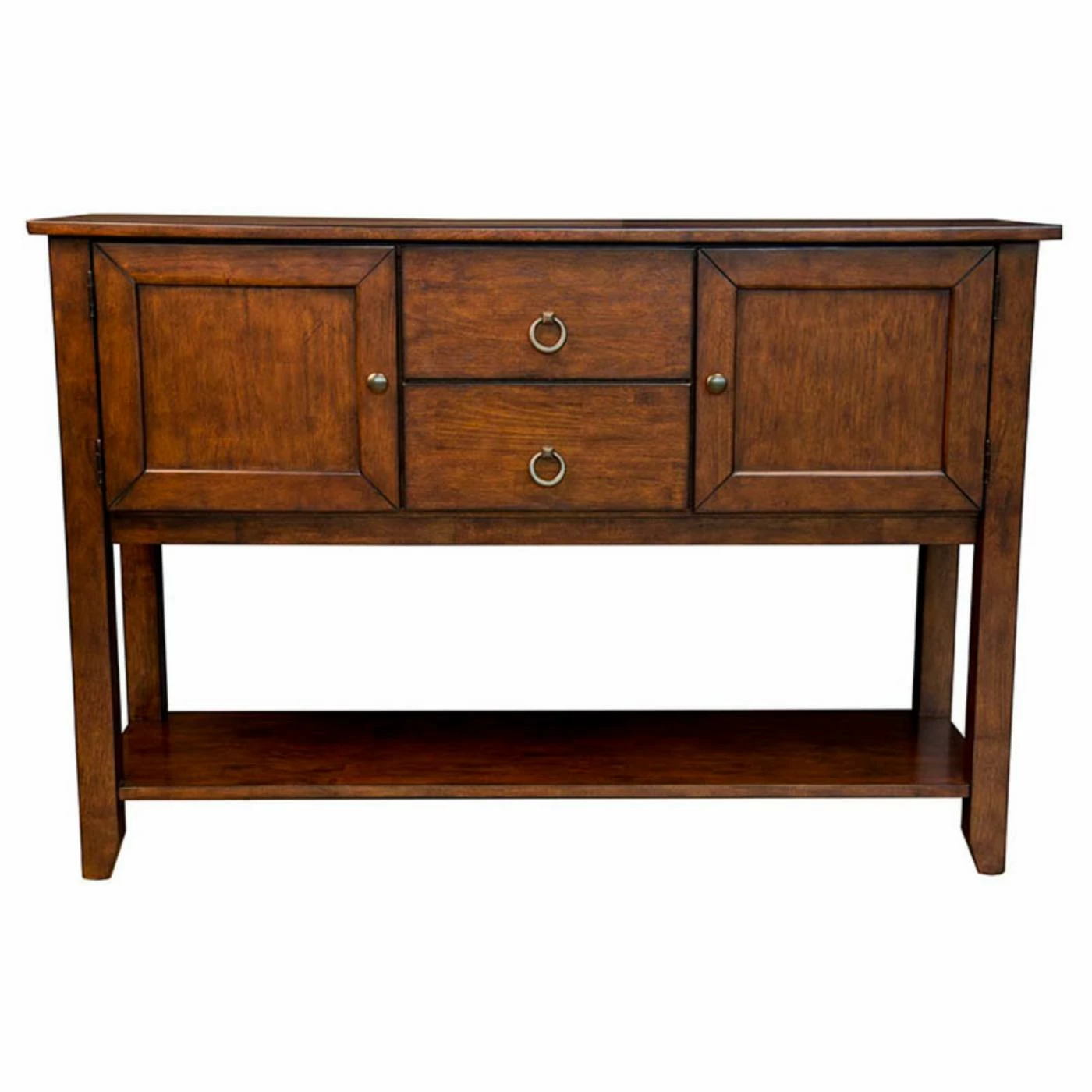 The A-America Mason Server in a radiant mango finish is a fantastic solution to your storage and display needs. Appropriate for any room, be it the foyer, dining room, or living area, the Mason Server provides a variety of organizing and decorating options. First there is the vast tabletop that can be used to show off art, collectibles, and family photos, or you could take the furnishing’s name literally and take advantage of the spacious surface to offer food and drinks buffet style at your next gathering. It also sports two raised panel doors that open to generous cabinet storage, and there are two center drawers as well with antiqued metal ring pulls. At the base you’ll find a full-width open shelf perfect for wicker baskets and bins.