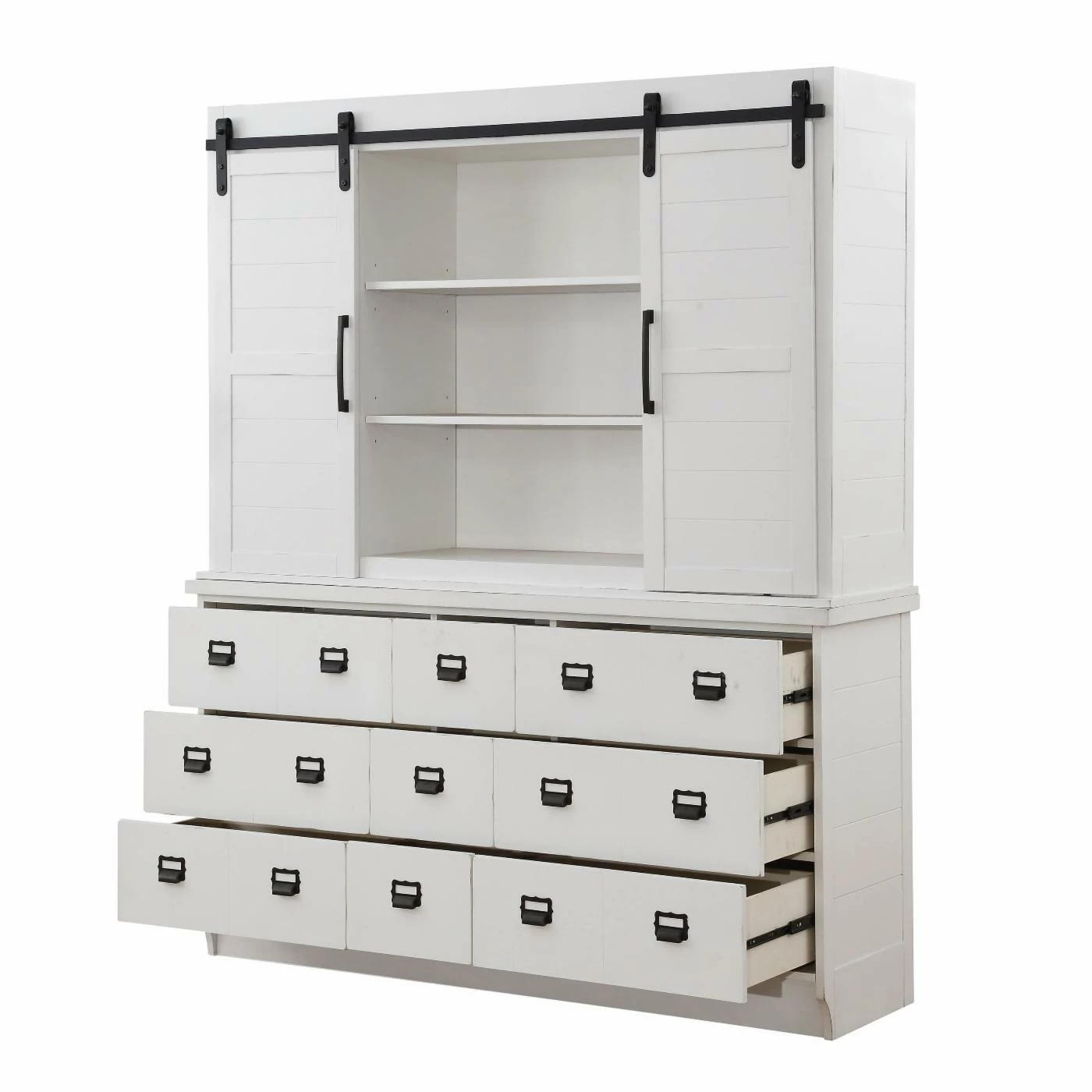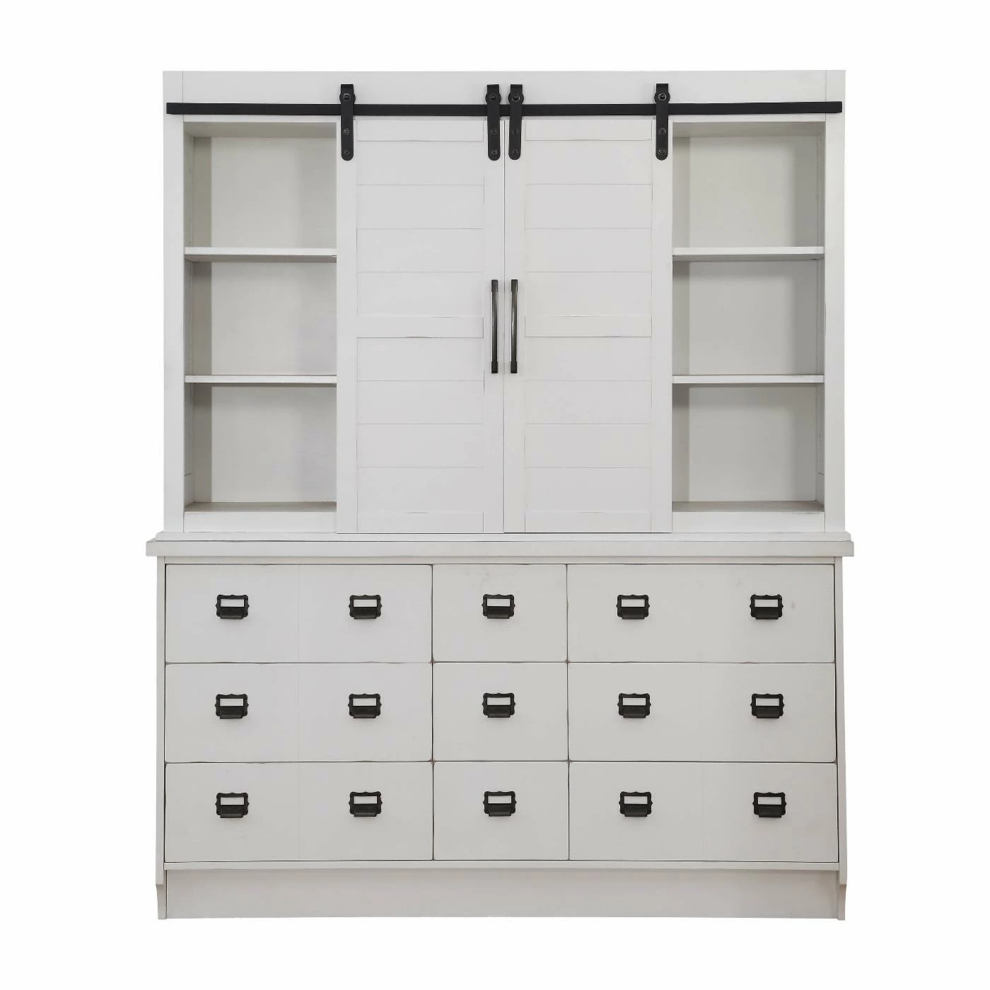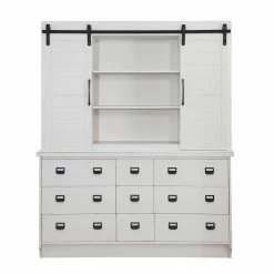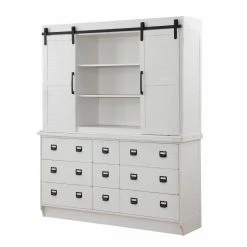 Freshen up your dining room with the Acme Furniture Renske Buffet with Hutch, accented with a roomy hutch adorned with barn doors featuring six shelves for storage and display. This rustic, shabby-chic buffet boasts a bright white finish that gives it an abundance of versatility for any home. The buffet boasts nine drawers adorned with metal hardware that gives it a dash of farmhouse flair and plenty of storage space.