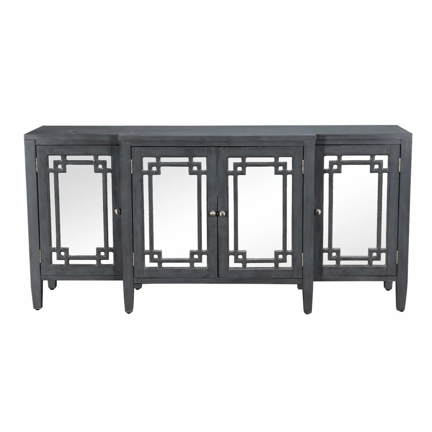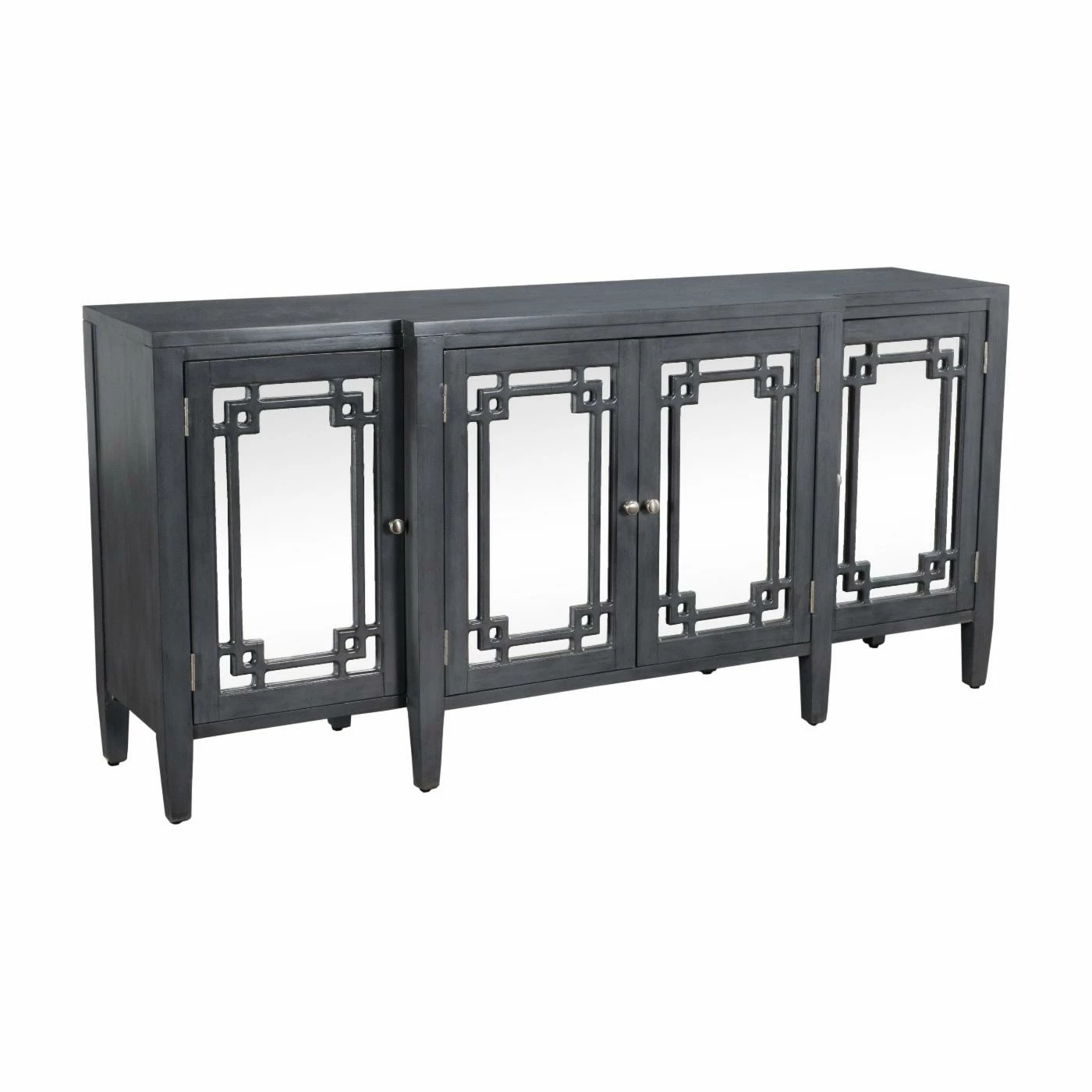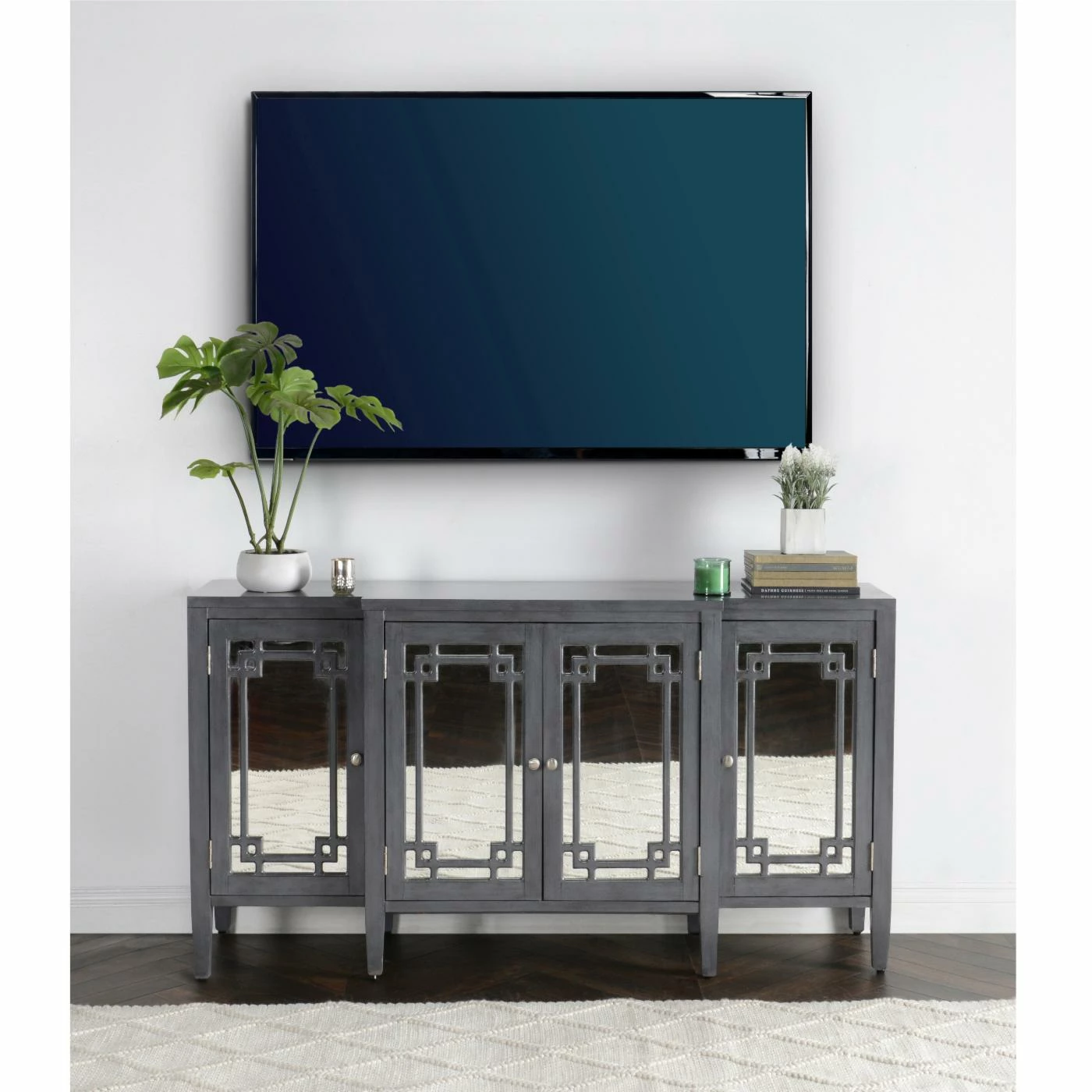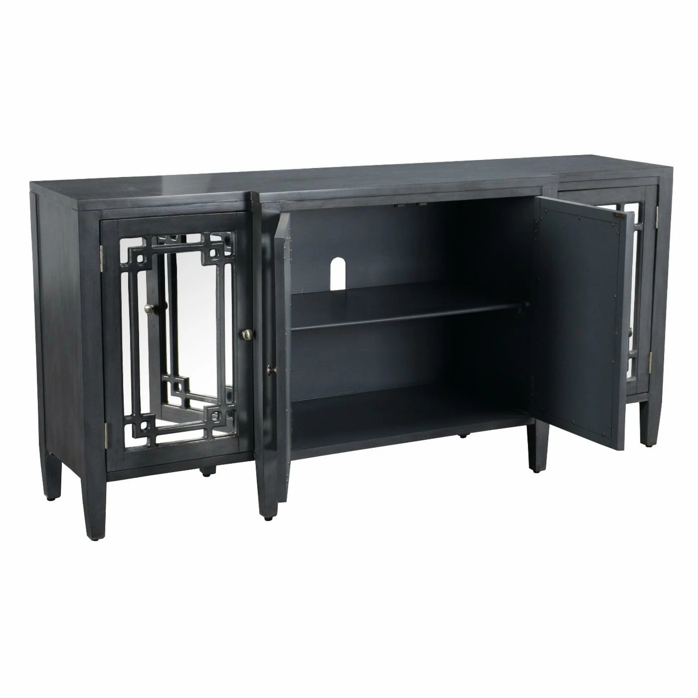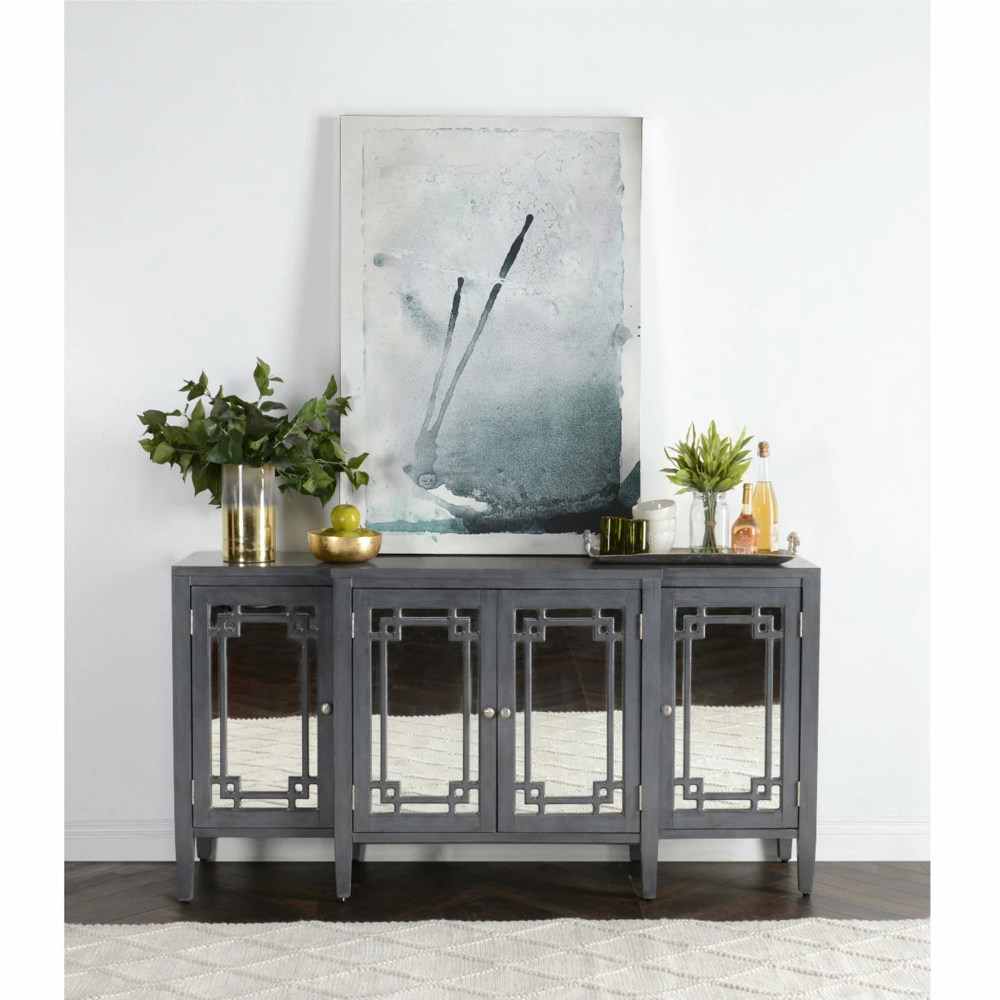 Maximize your dining area and do it in style with the Kosas Home Haley 4 Door Sideboard. Designed with ample storage space, this sturdy sideboard is durably constructed of hardwood solids and MDF (a dense, warp-resistant engineered wood). The four mirror doors open to reveal generous shelf space to keep plates, glasses, and other essentials neatly organized. Featuring a rich charcoal gray finish, this stylish and versatile sideboard features wire management and can easily double as a TV stand.