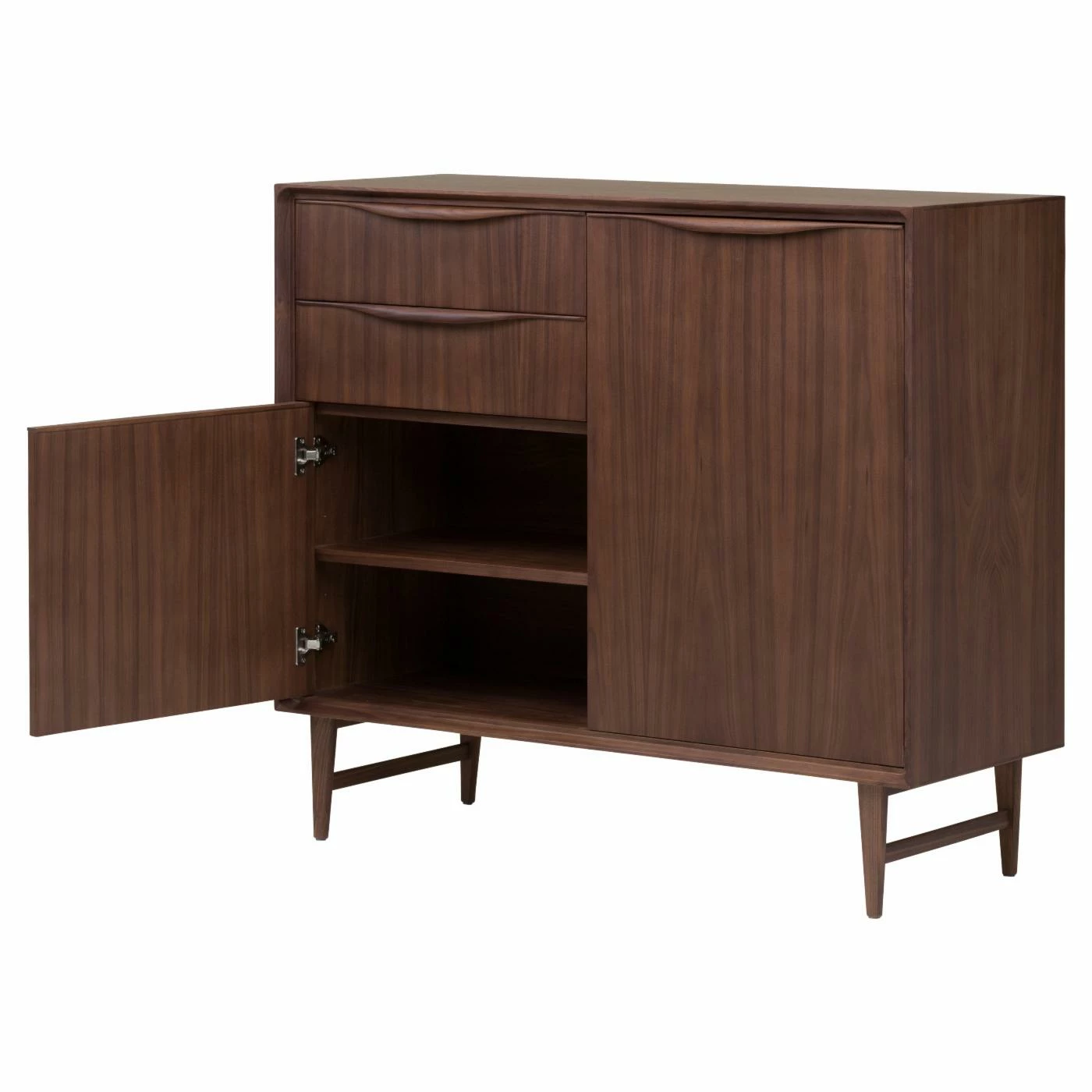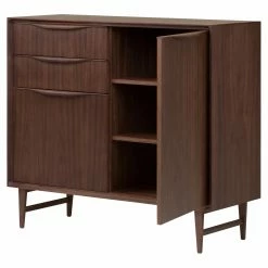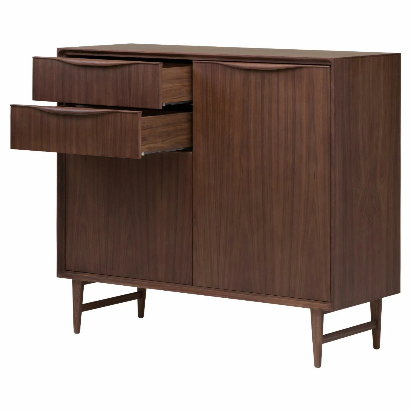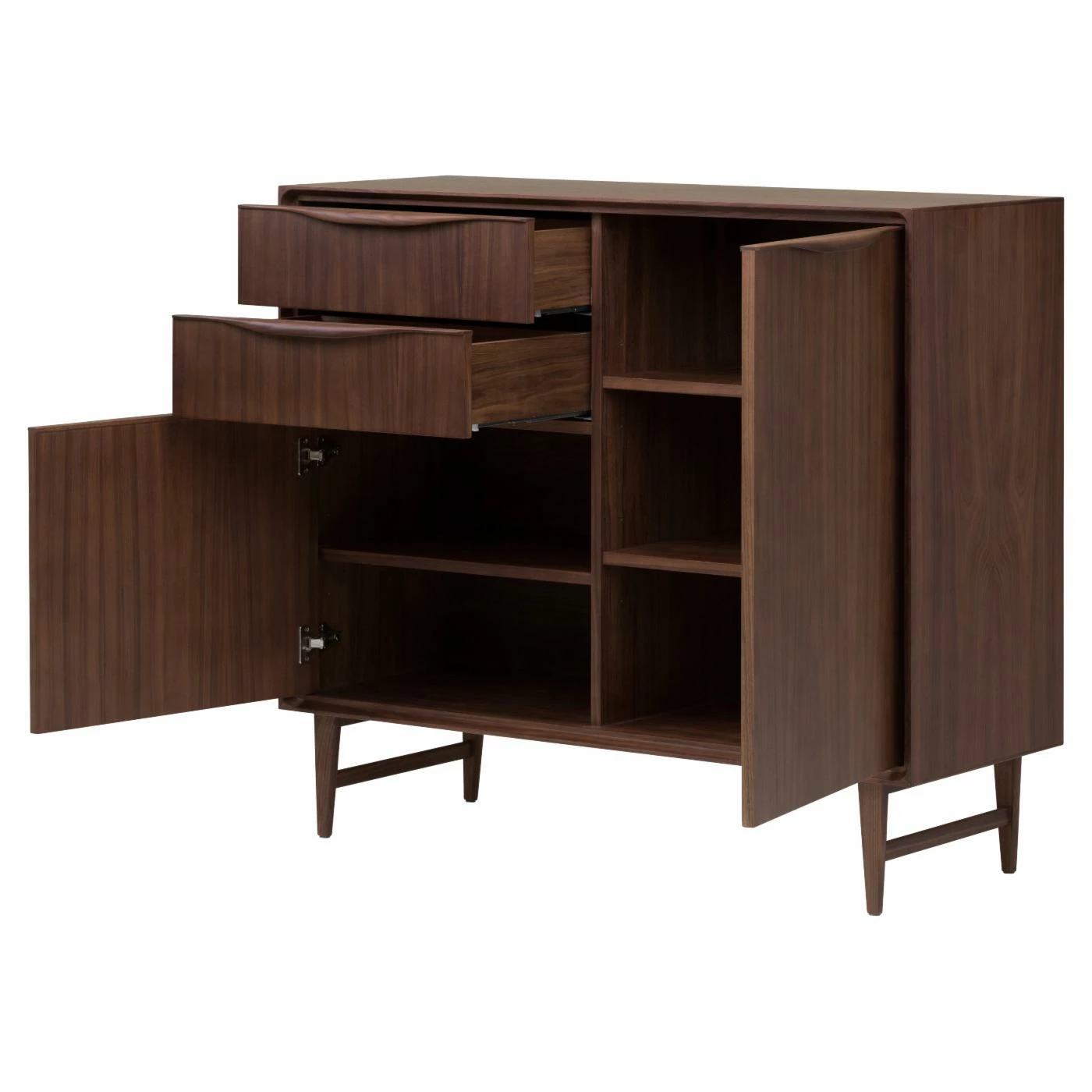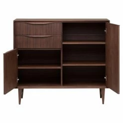 The lofty Nuevo Elisabeth Tall Sideboard offers plenty of storage space without taking up much floor space. It’s perfect for your apartment or loft! The sideboard features one tall cabinet door and one smaller that open to reveal interior shelving. Two drawers are ideal for flatware, table linens, and more. This tall sideboard boasts chic curled wood pulls and is built from wood in a walnut stain.