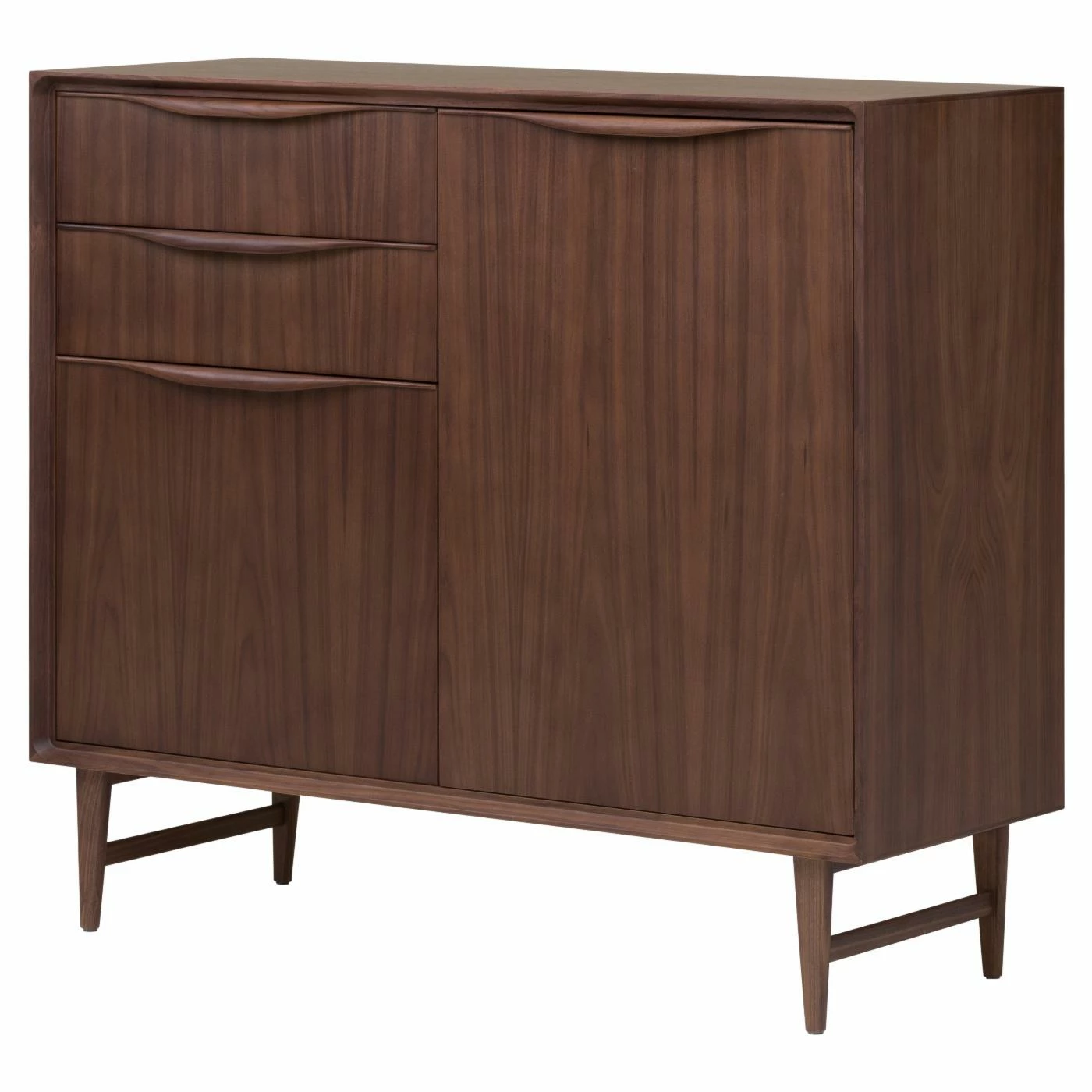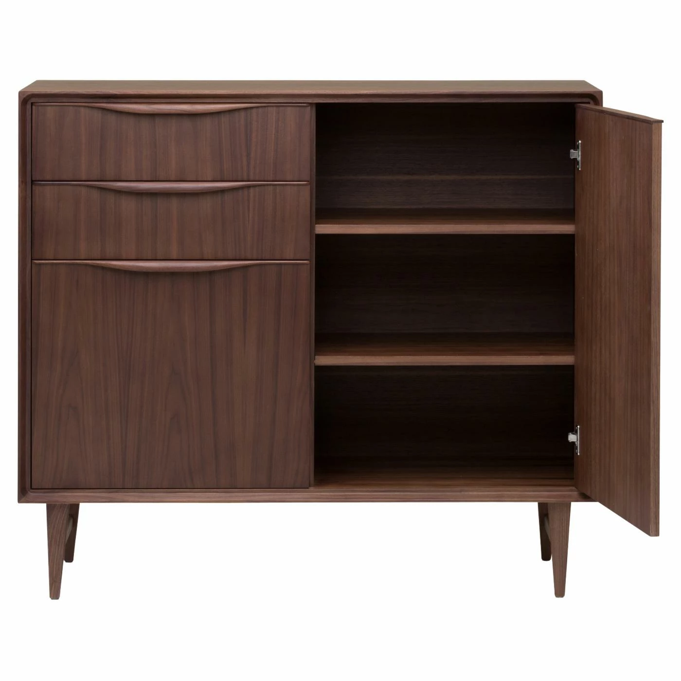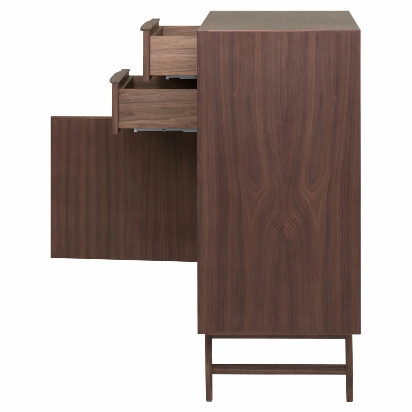 The lofty Nuevo Elisabeth Tall Sideboard offers plenty of storage space without taking up much floor space. It’s perfect for your apartment or loft! The sideboard features one tall cabinet door and one smaller that open to reveal interior shelving. Two drawers are ideal for flatware, table linens, and more. This tall sideboard boasts chic curled wood pulls and is built from wood in a walnut stain.