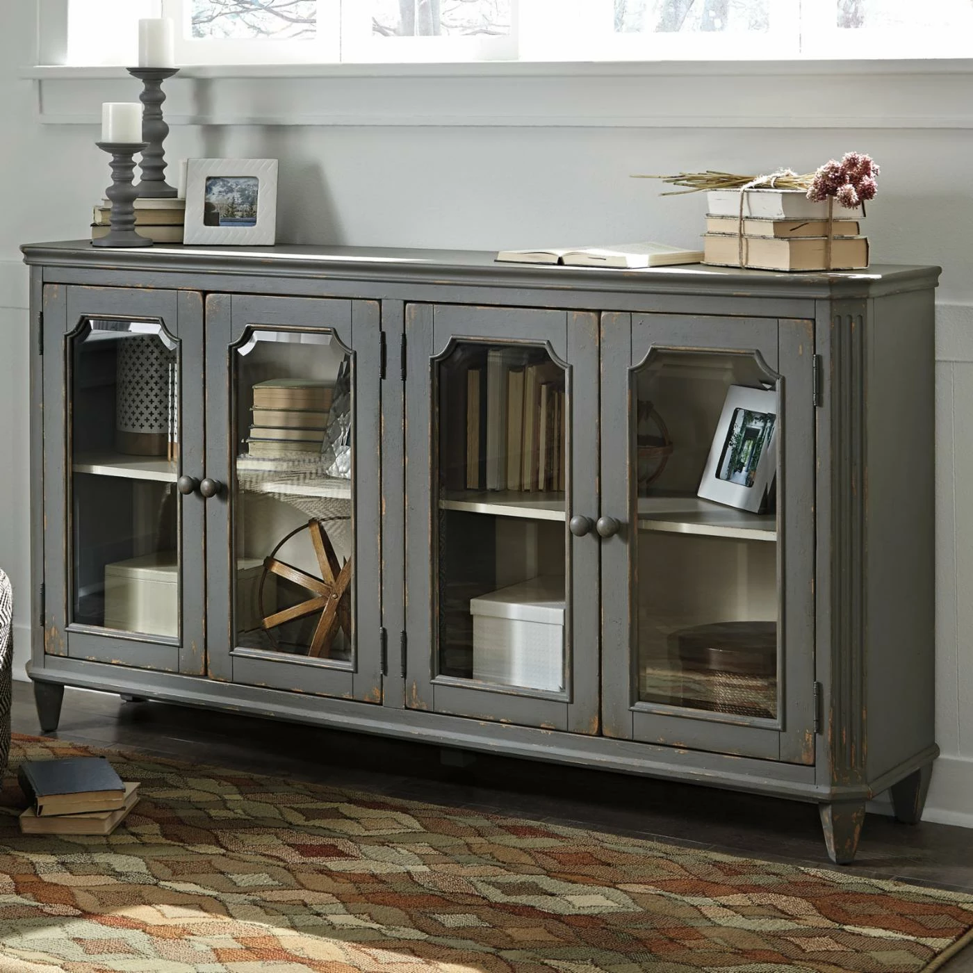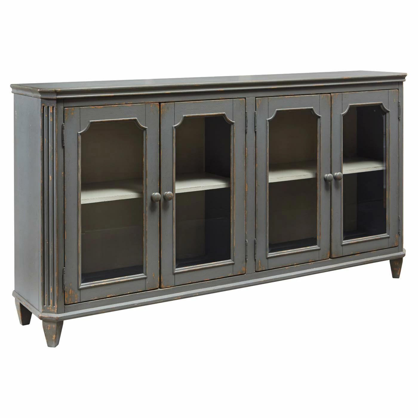 The Signature Design by Ashley Mirimyn Sideboard with 4 Glass Doors is the perfect touch of romantic, vintage charm for any home. Adjustable shelves behind glass-paneled doors make this cabinet an eminently practical choice for storage or display in your dining room, foyer, or bedroom. The delicate French-inspired molding and lightly distressed antique gray paint make it tres chic. Be the envy of your friends with this old-school glam statement piece.